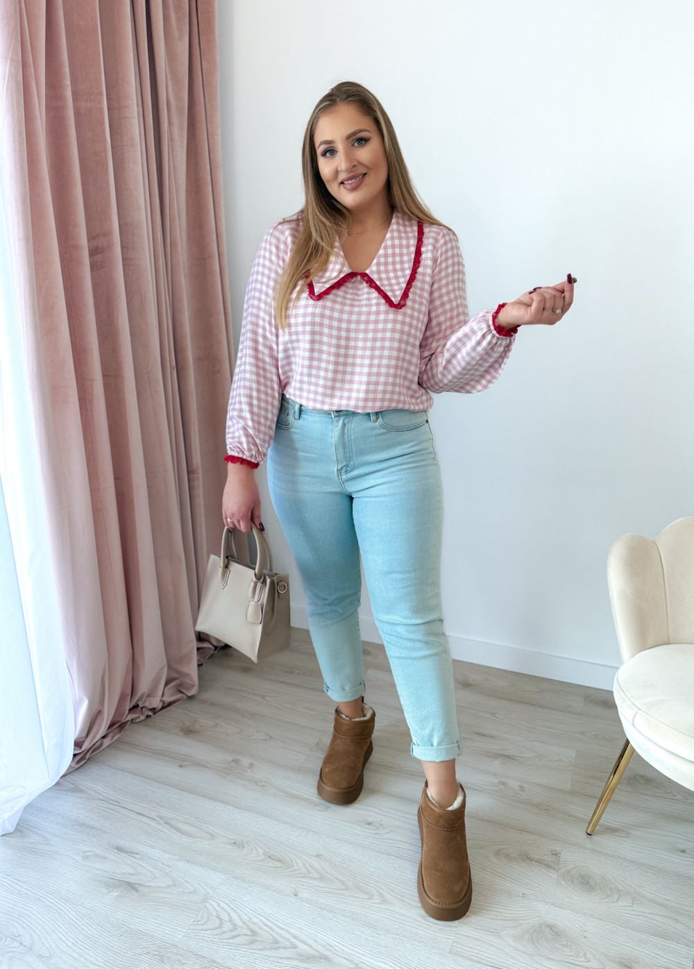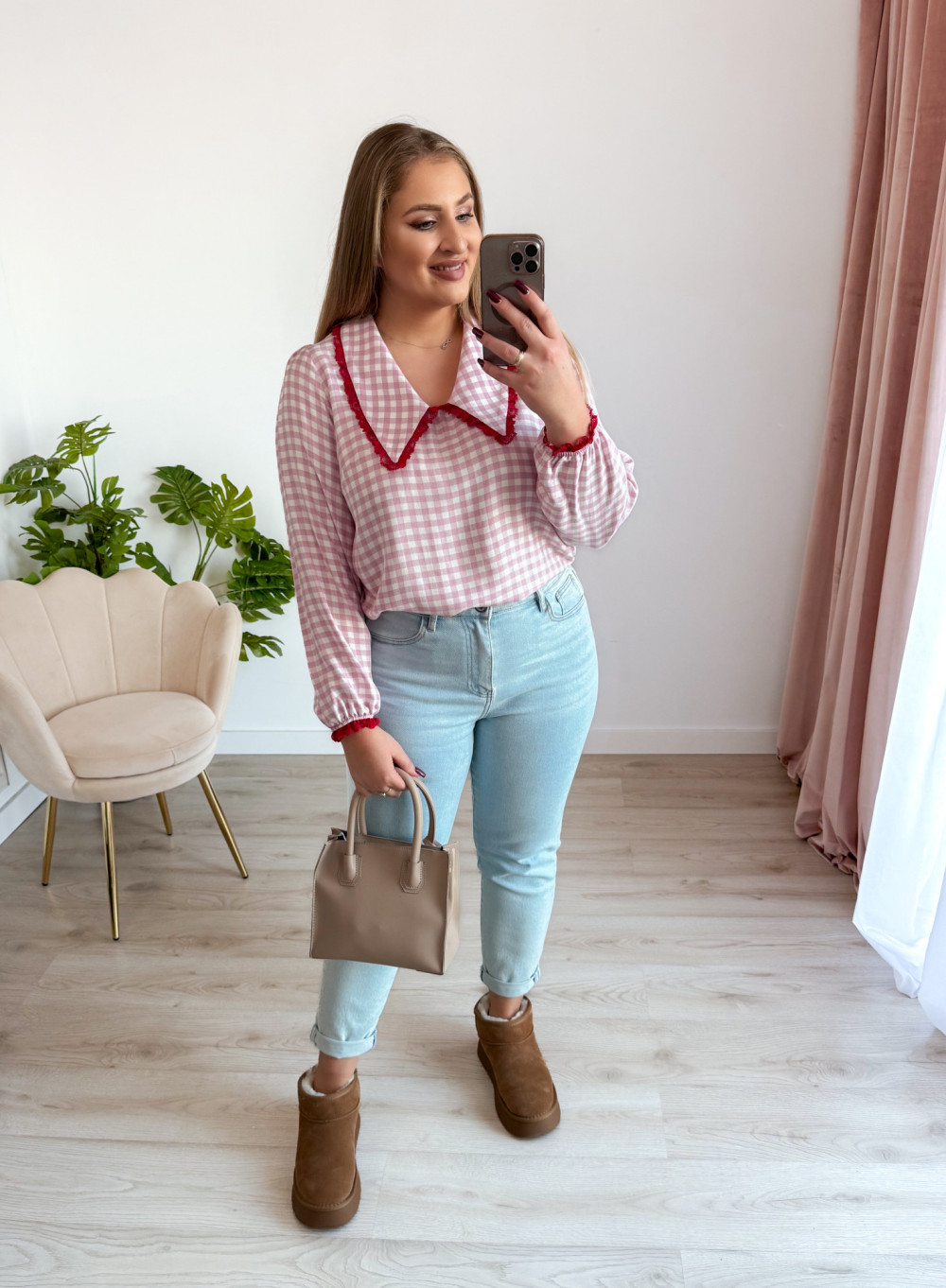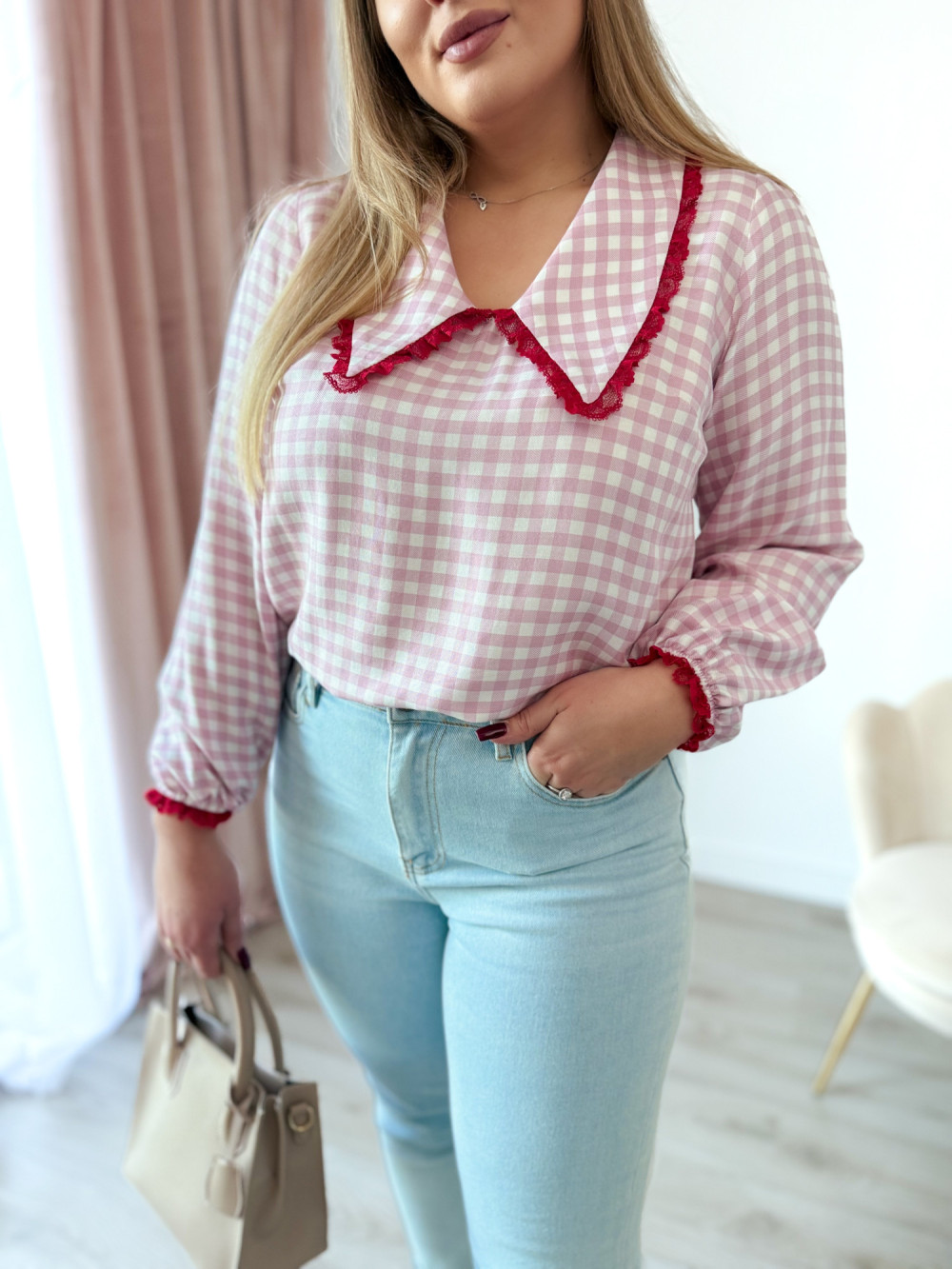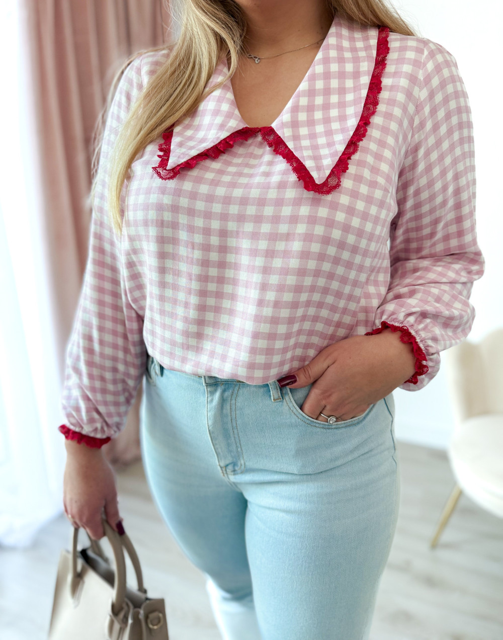 Koszula z ozdobnym kołnierzykiem biało-różowa kratka Pretty Check
