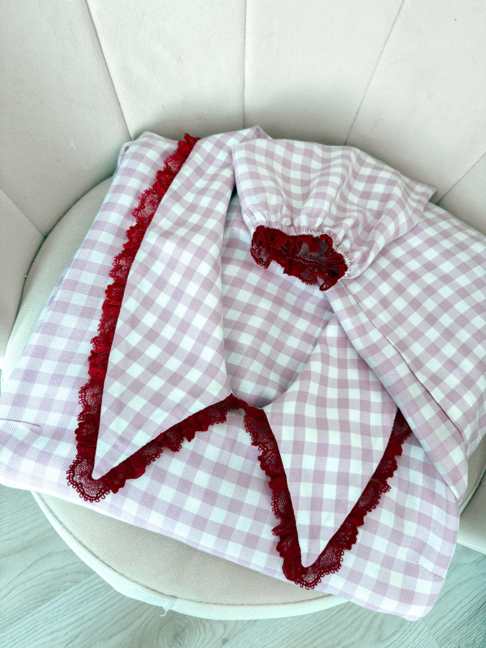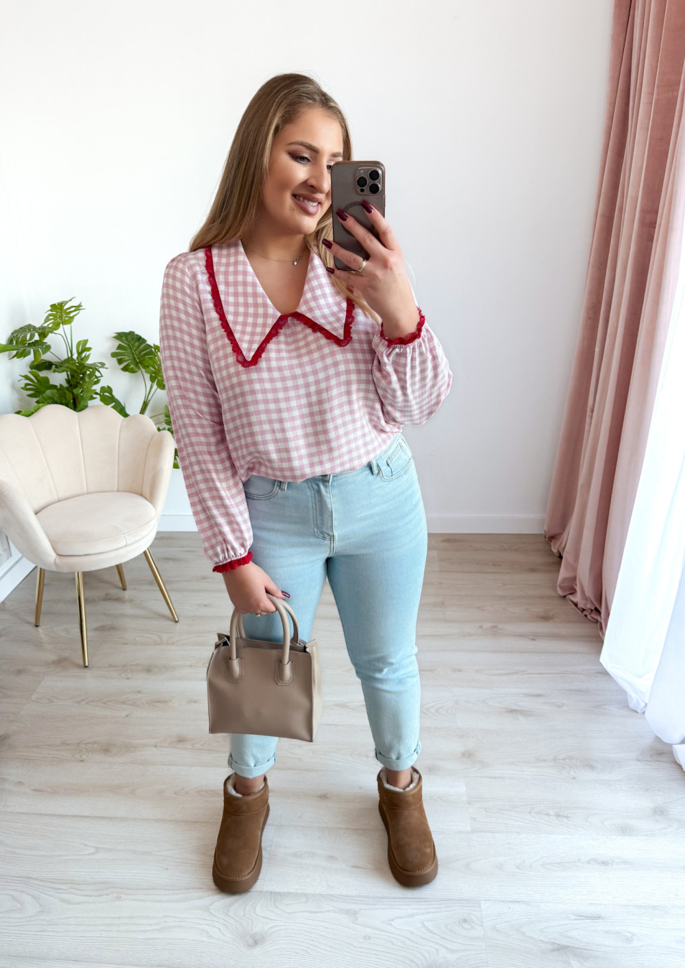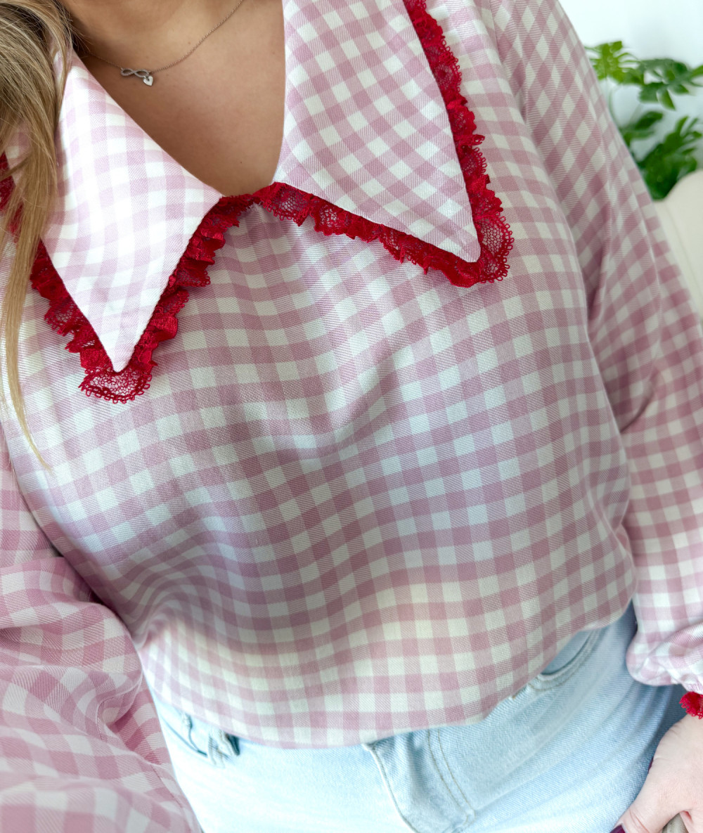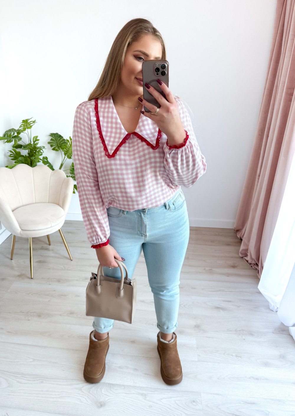 Koszula z ozdobnym kołnierzykiem biało-różowa kratka Pretty Check