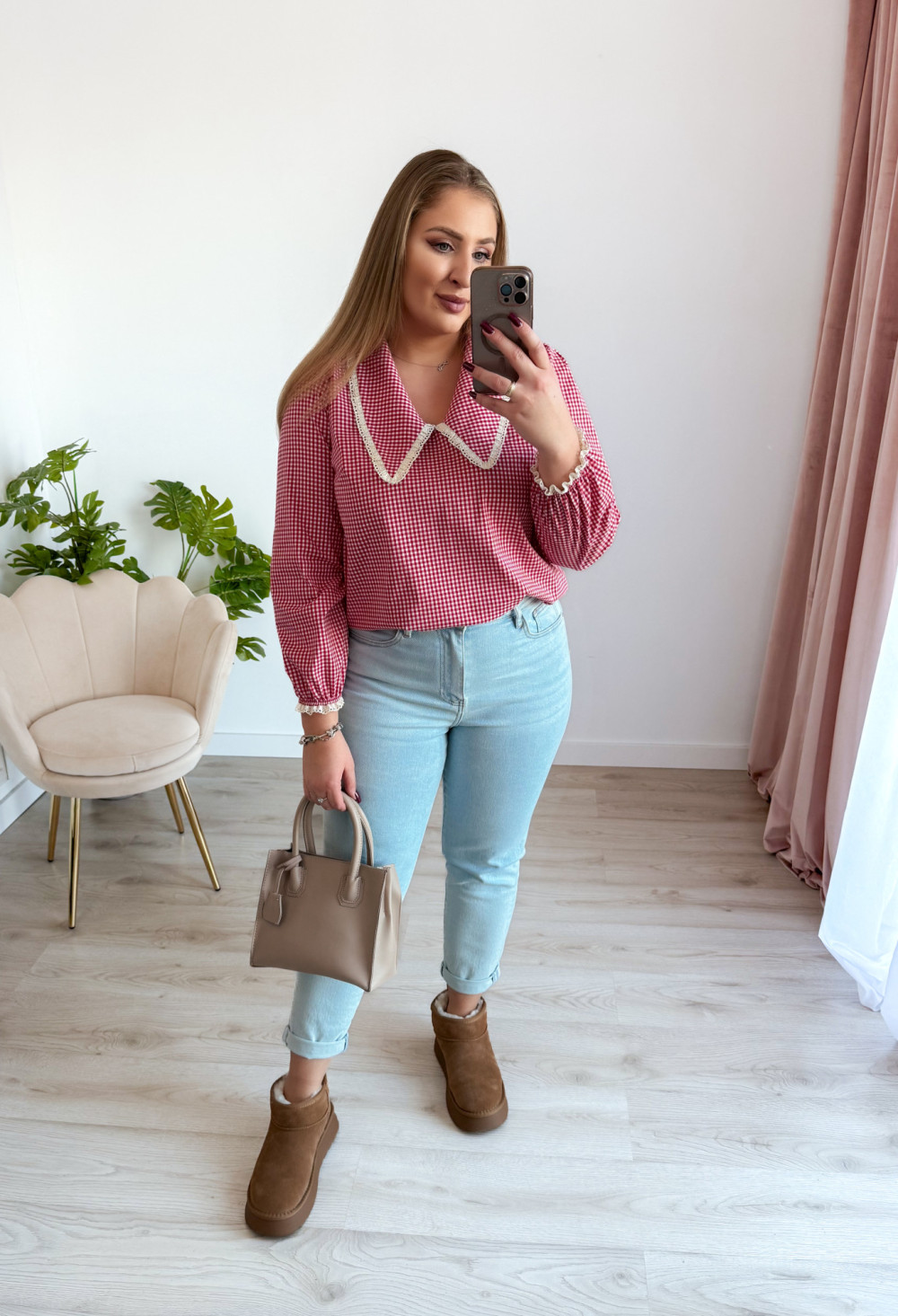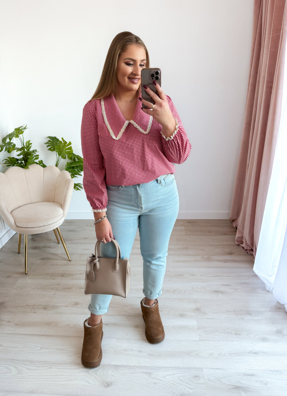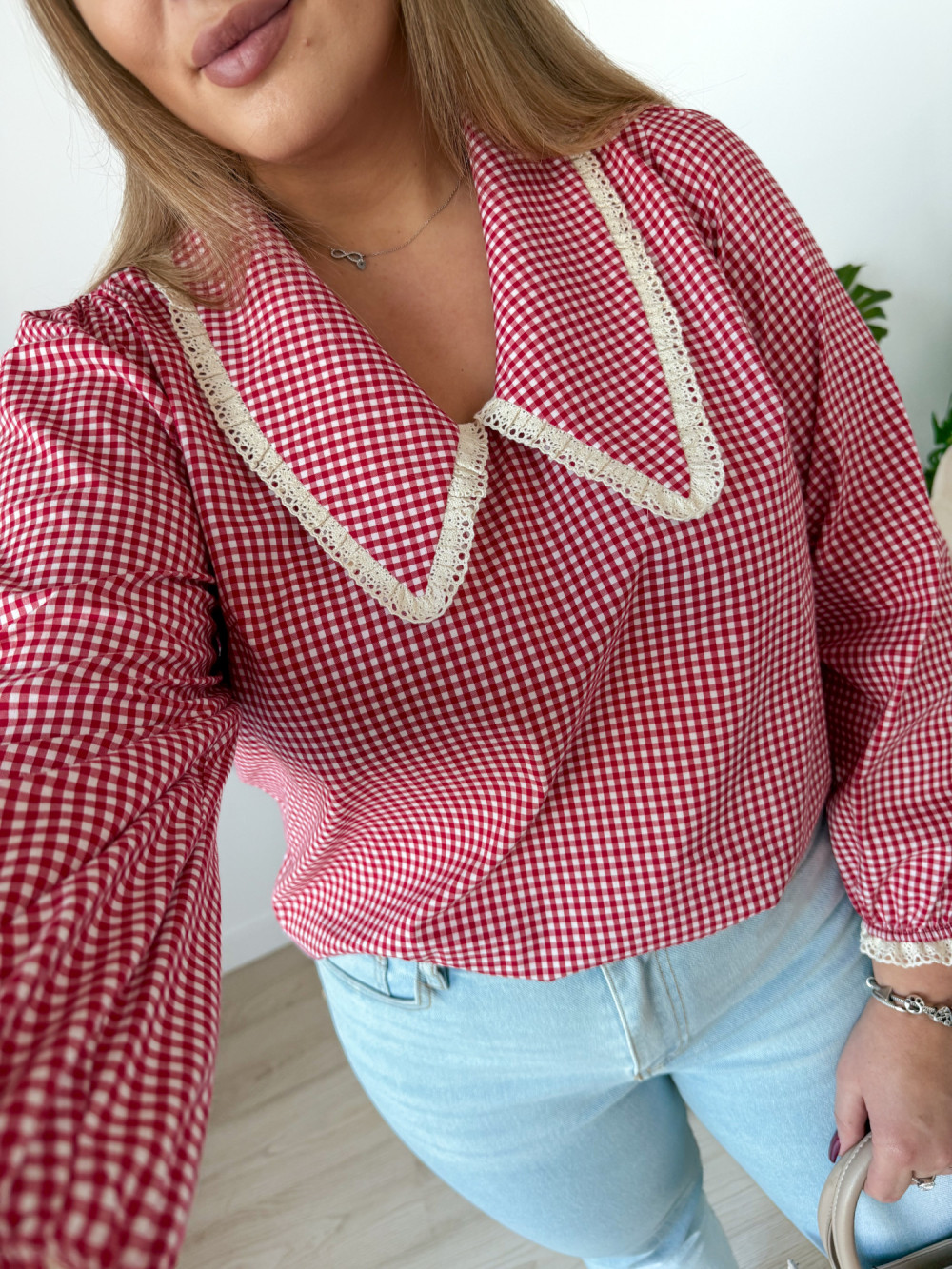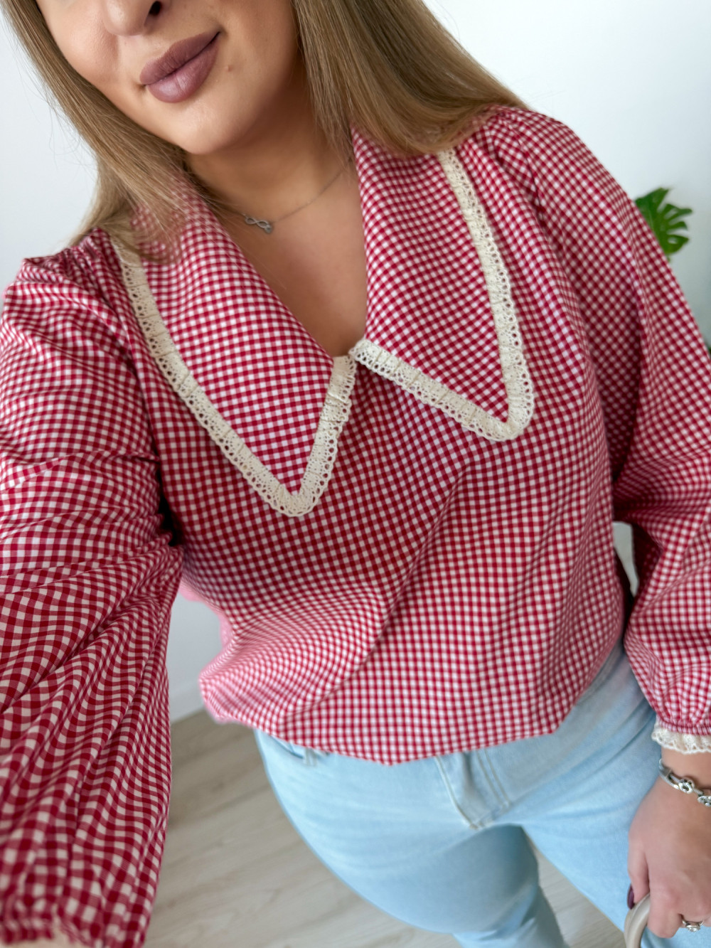 Koszula, która łączy klasykę z modnym akcentem. Czerwono-biała krata przyciąga wzrok i dodaje stylizacji charakteru, a ozdobny kołnierzyk nadaje całości eleganckiego, kobiecego wykończenia. Idealna zarówno do jeansów, jak i spódnicy – sprawdzi się na co dzień i do pracy.