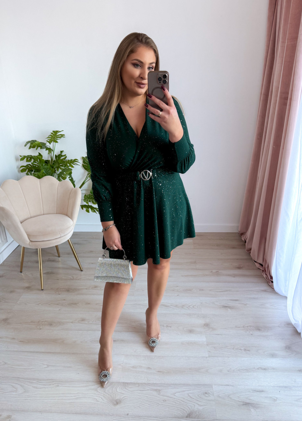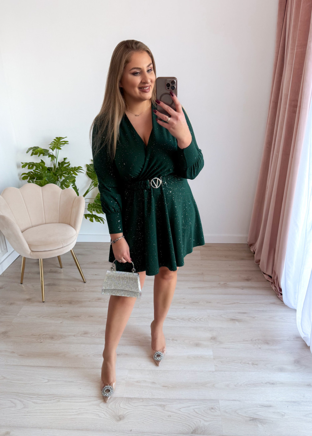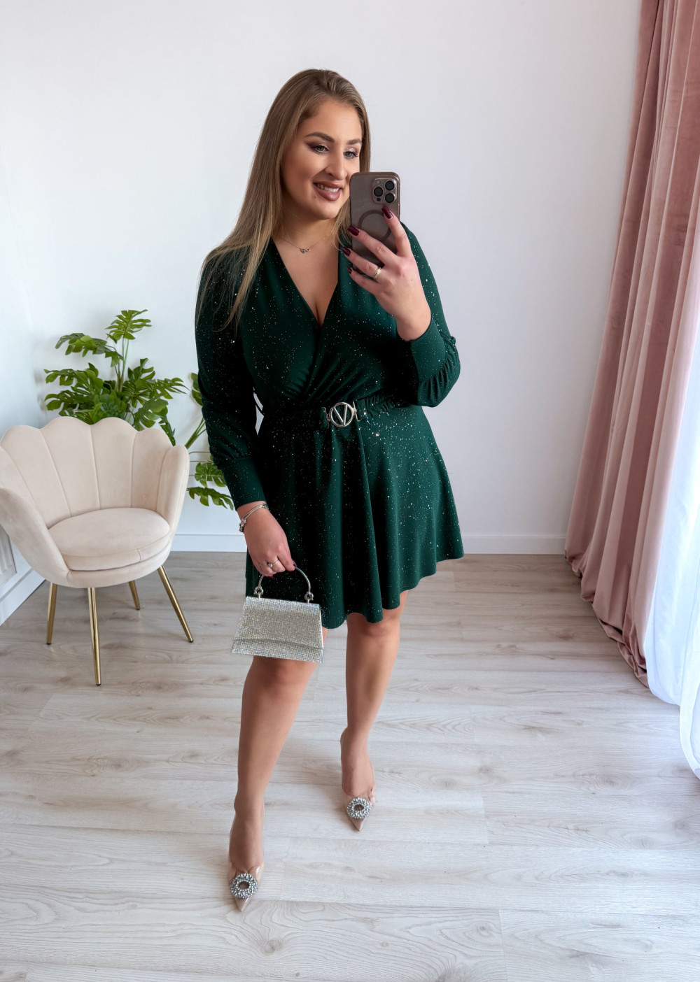 Sukienka krótka ze srebrnymi drobinkami Princess - butelkowa zieleń