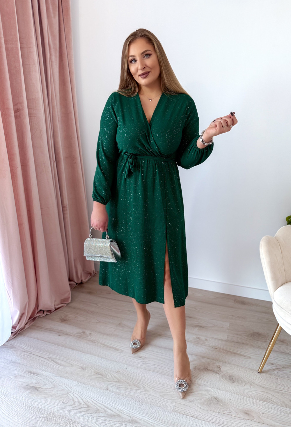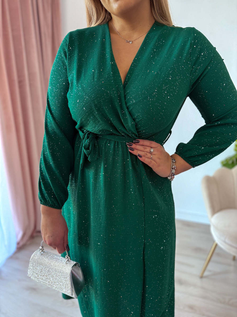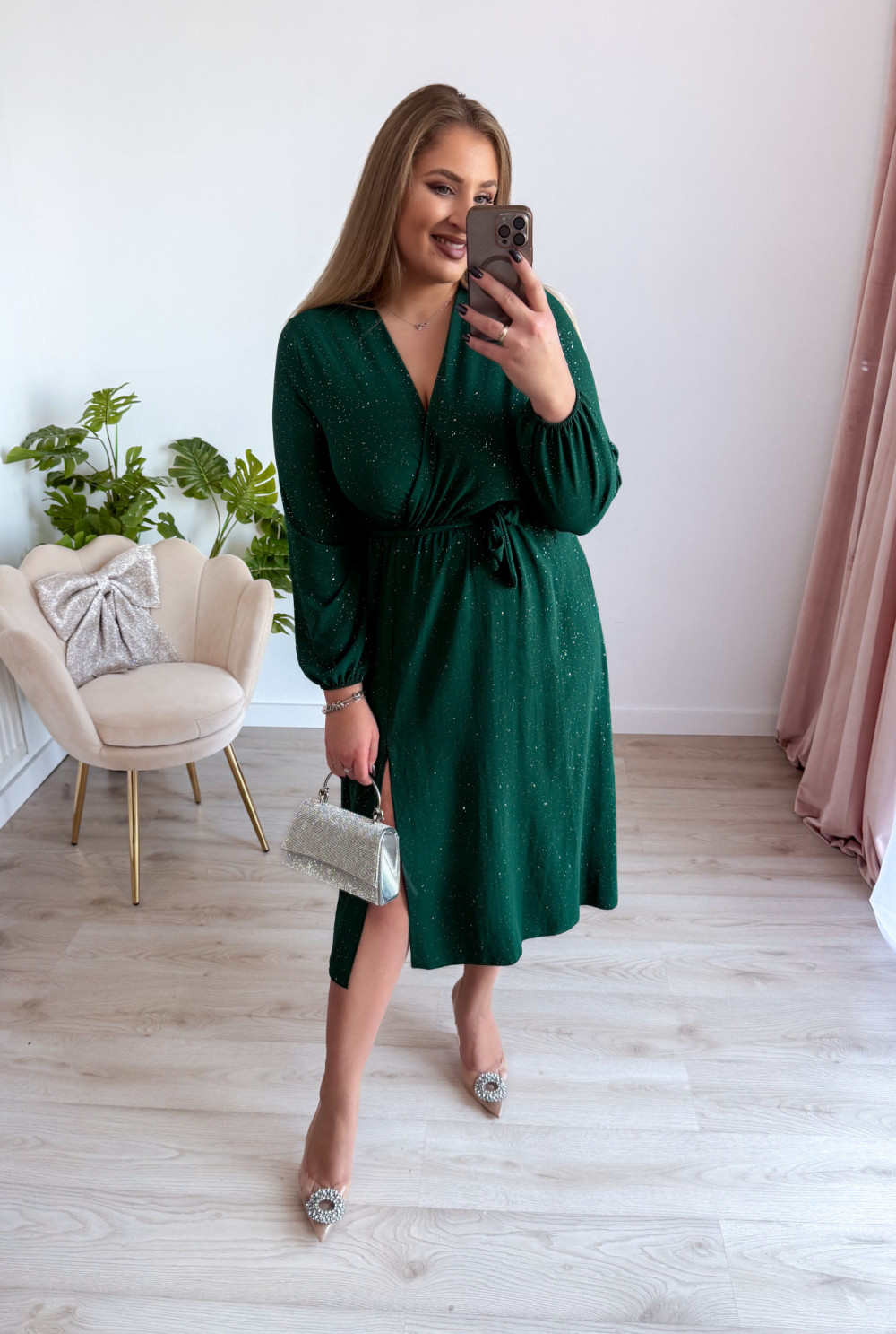 Sukienka nietoperzowa midi z rozcięciem na nogę i srebrnymi drobinkami Marina - butelkowa zieleń