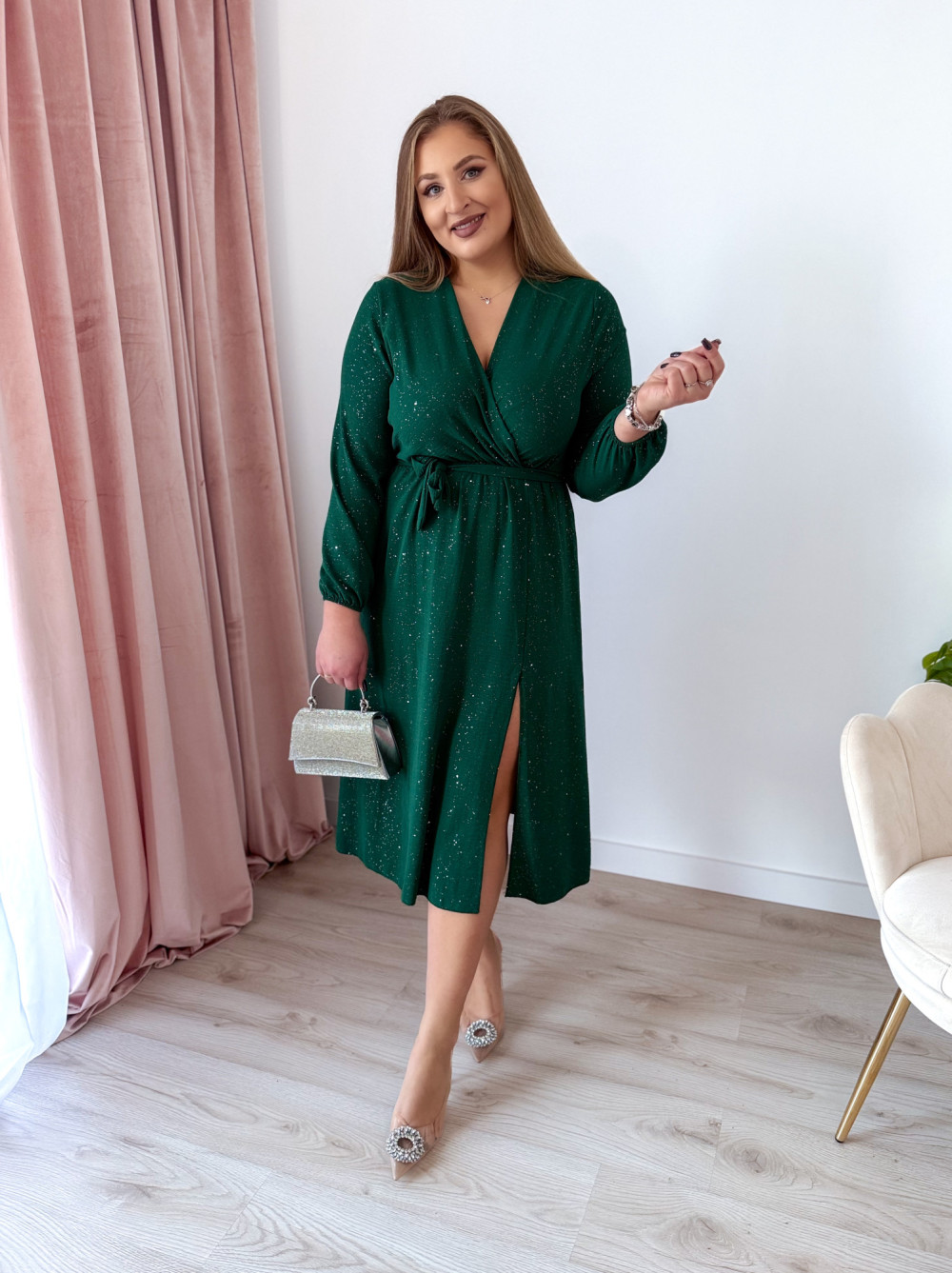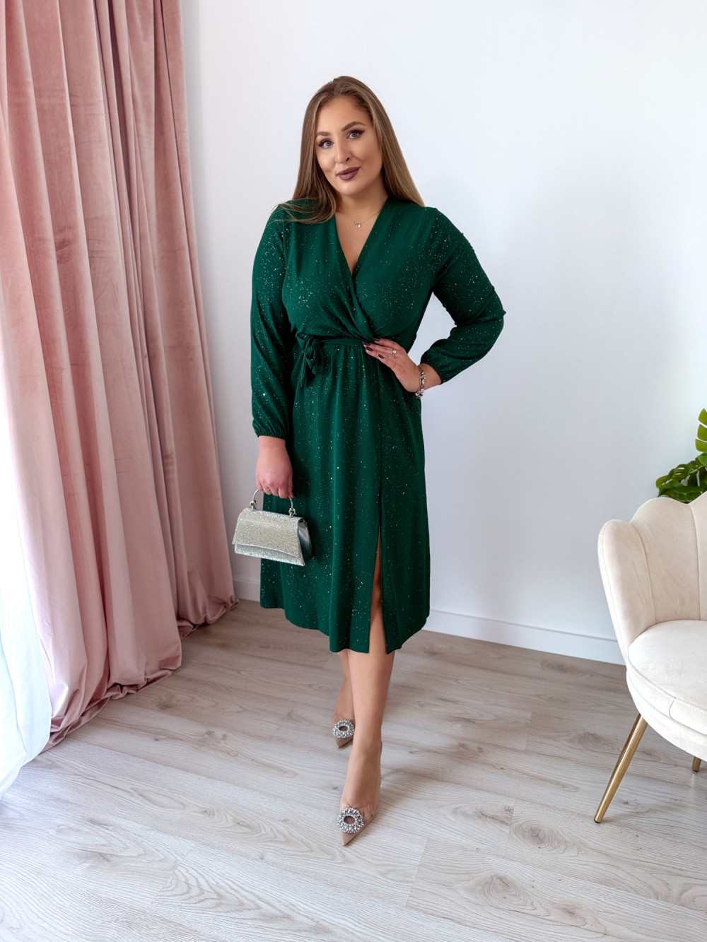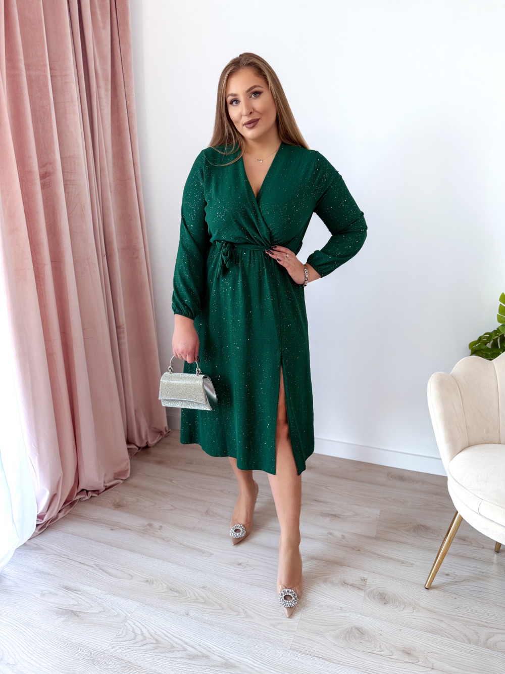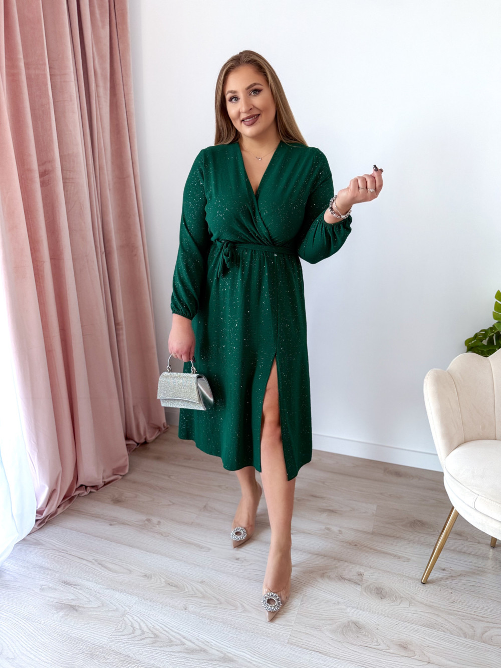 Sukienka nietoperzowa midi z rozcięciem na nogę i srebrnymi drobinkami Marina - butelkowa zieleń