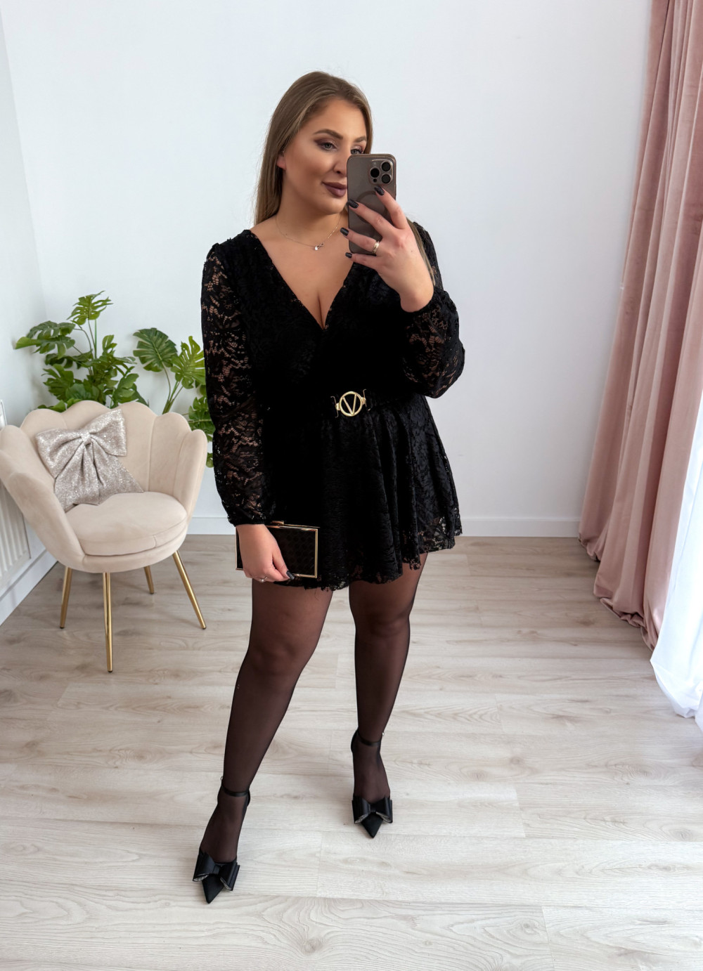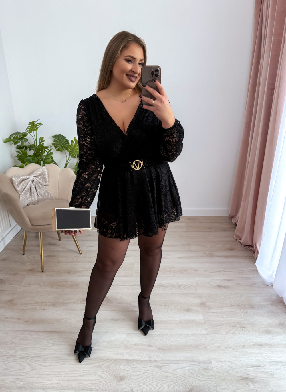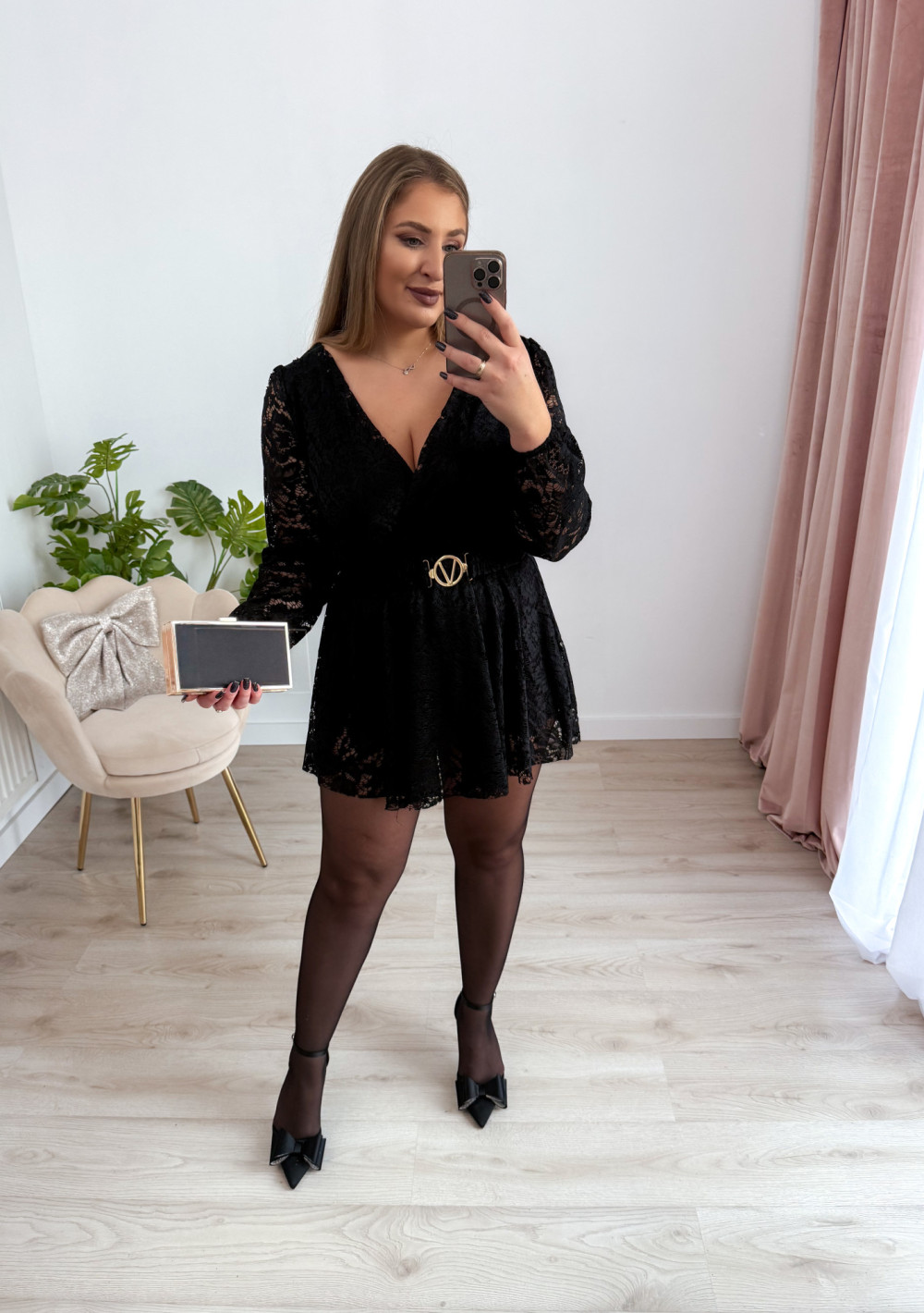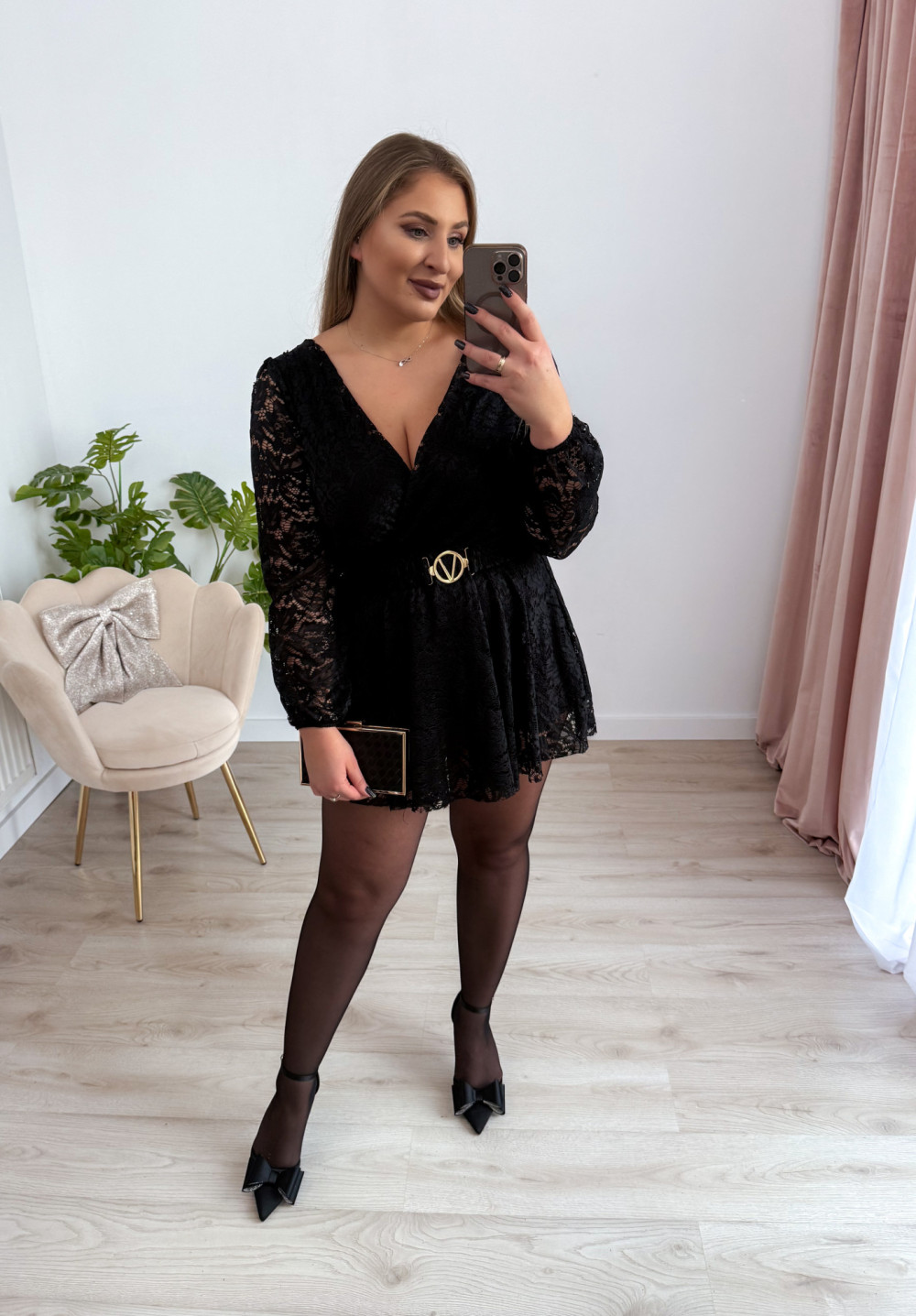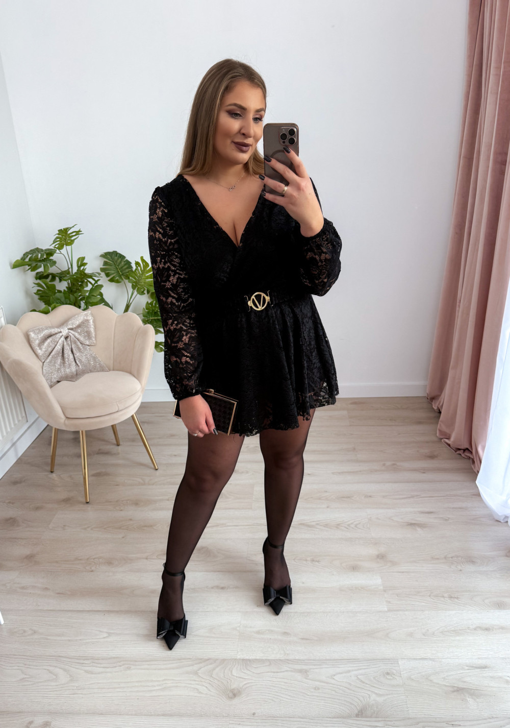 Kombinezon, który łączy kobiecość i wygodę w najpiękniejszym wydaniu. Wykonany z delikatnej koronki, prezentuje się niezwykle stylowo i romantycznie. Krótki fason podkreśla nogi, a zakładany dekolt dodaje zmysłowości. Gumka w talii wraz z dodatkowym paskiem pozwalają idealnie dopasować kombinezon do sylwetki.