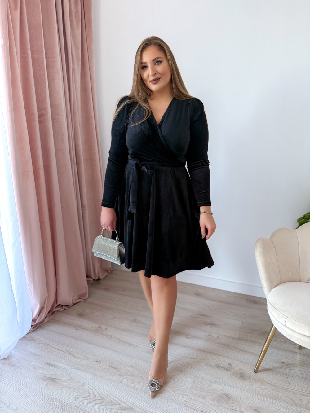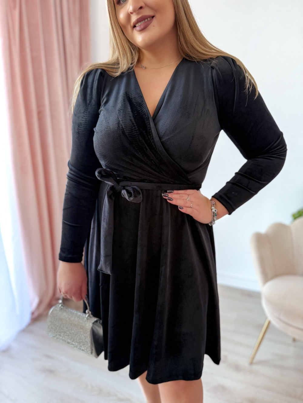 Sukienka welurowa z delikatnymi bufkami Marilyn - czarna