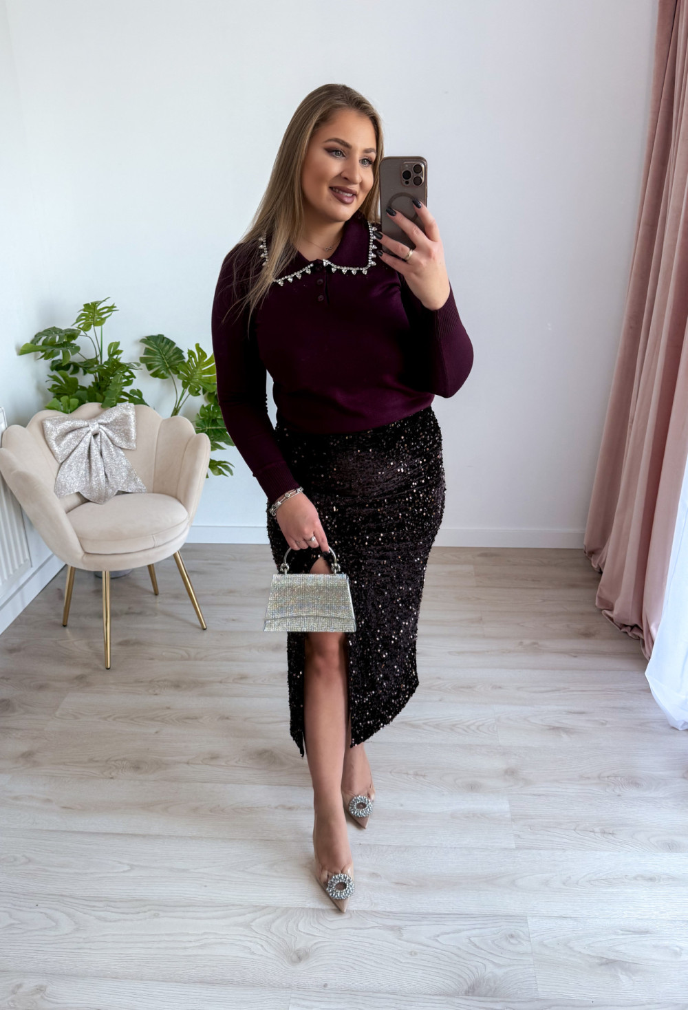 Sweterek, który łączy elegancję z subtelnym blaskiem. Miękki materiał zapewnia komfort noszenia, a długi rękaw dodaje przytulności i klasy. Ozdobny kołnierzyk przy dekolcie wysadzany diamencikami przyciąga spojrzenia i nadaje całości wyjątkowego, kobiecego charakteru.