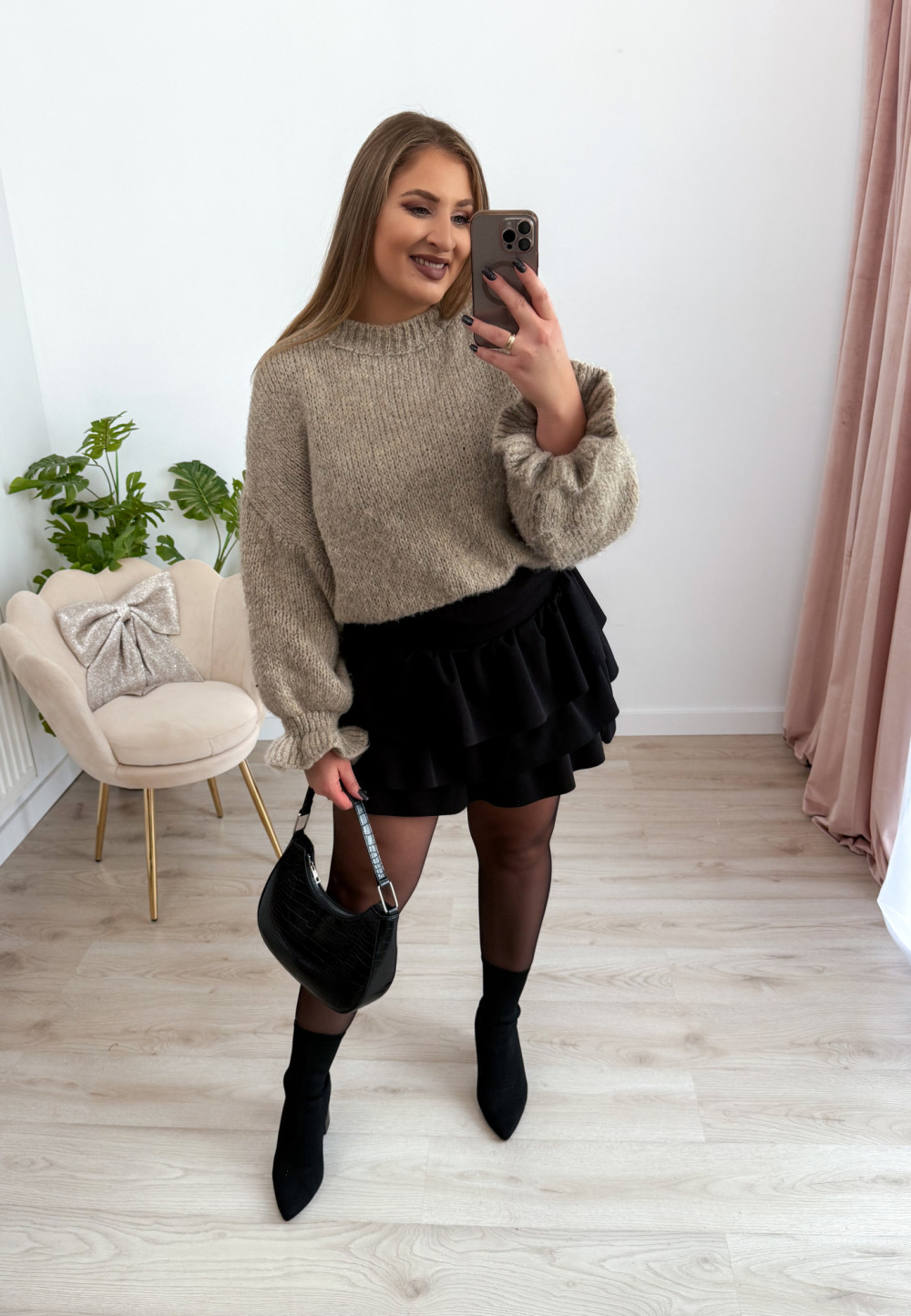 Ta urocza spódniczka z falbanek to propozycja, która doda lekkości i dziewczęcego uroku każdej stylizacji. Idealnie podkreśla talię dzięki wygodnej gumce, a jej delikatna forma pięknie współgra z miękkimi sweterkami i eleganckimi bluzkami.