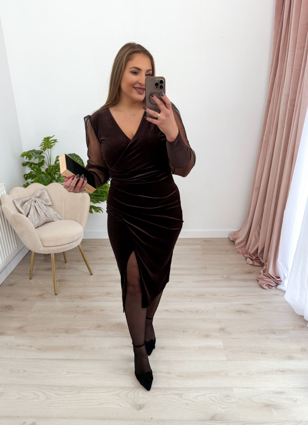 Sukienka midi z siateczkowanymi rękawami Holy Night - czekolada