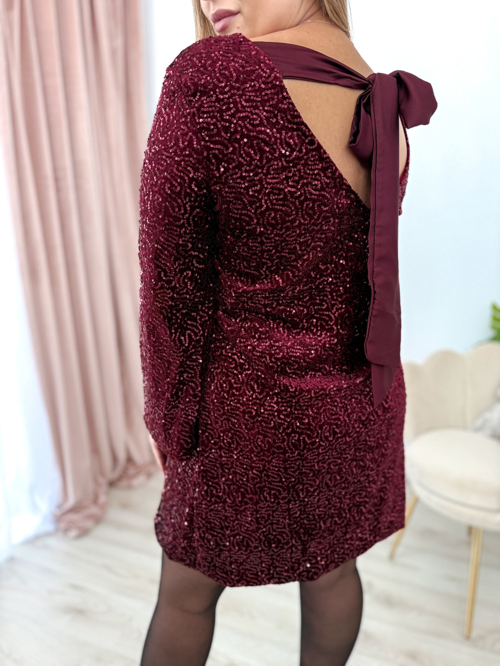 Sukienka krótka cekinowa z wiązaną kokardką na plecach Adelaide - bordo