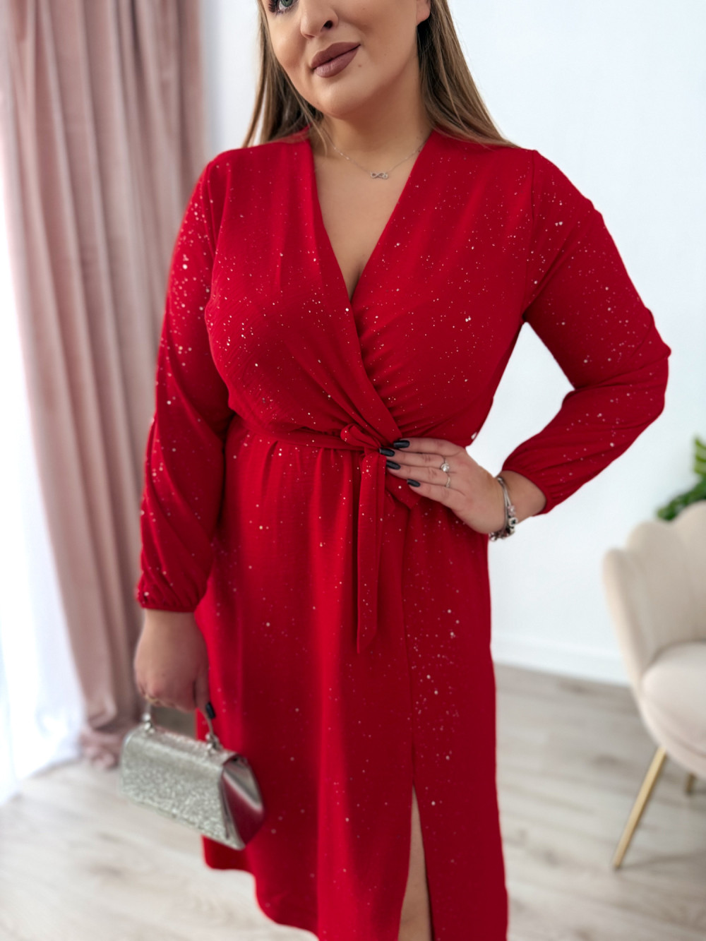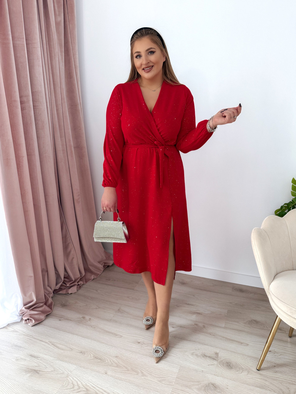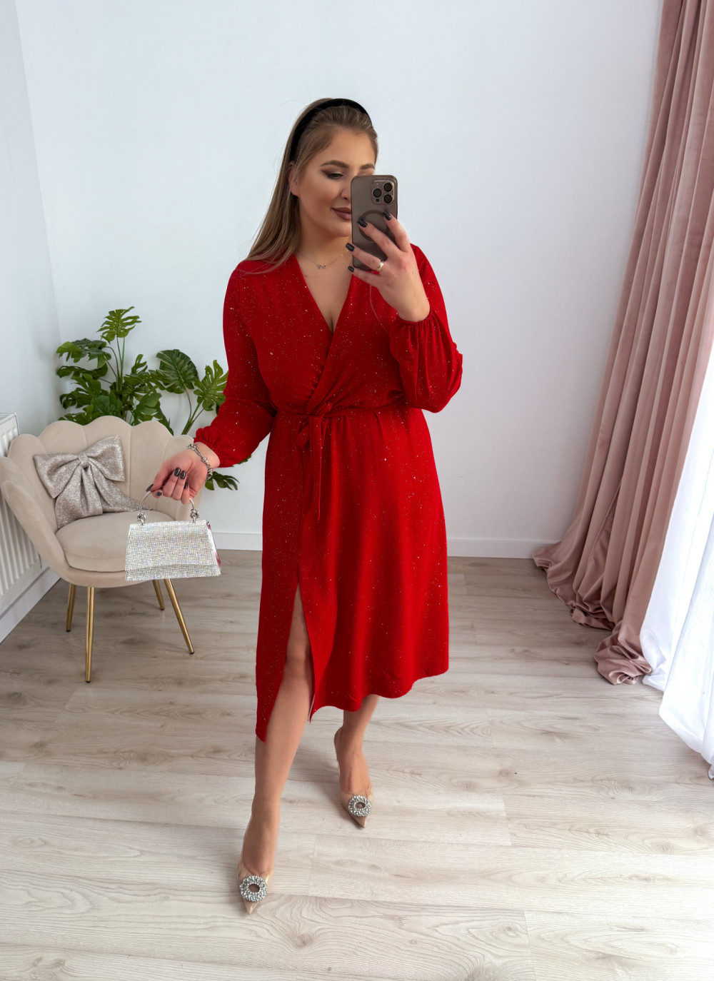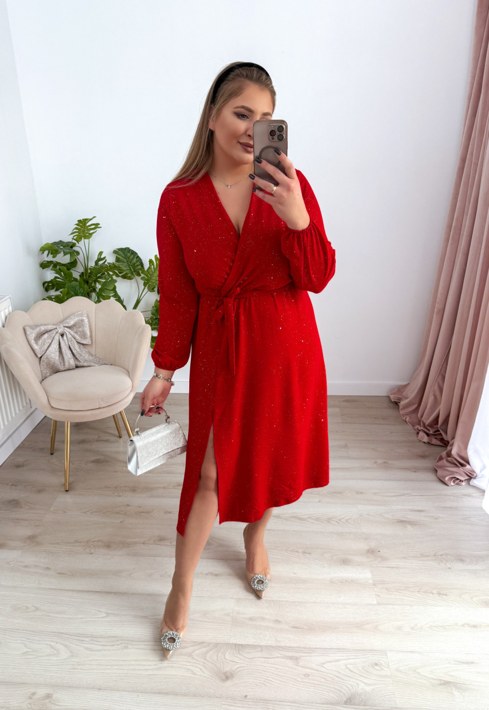 Sukienka nietoperzowa midi z rozcięciem na nogę i srebrnymi drobinkami Marina - czerwona