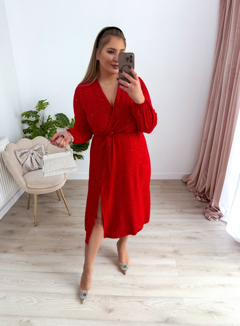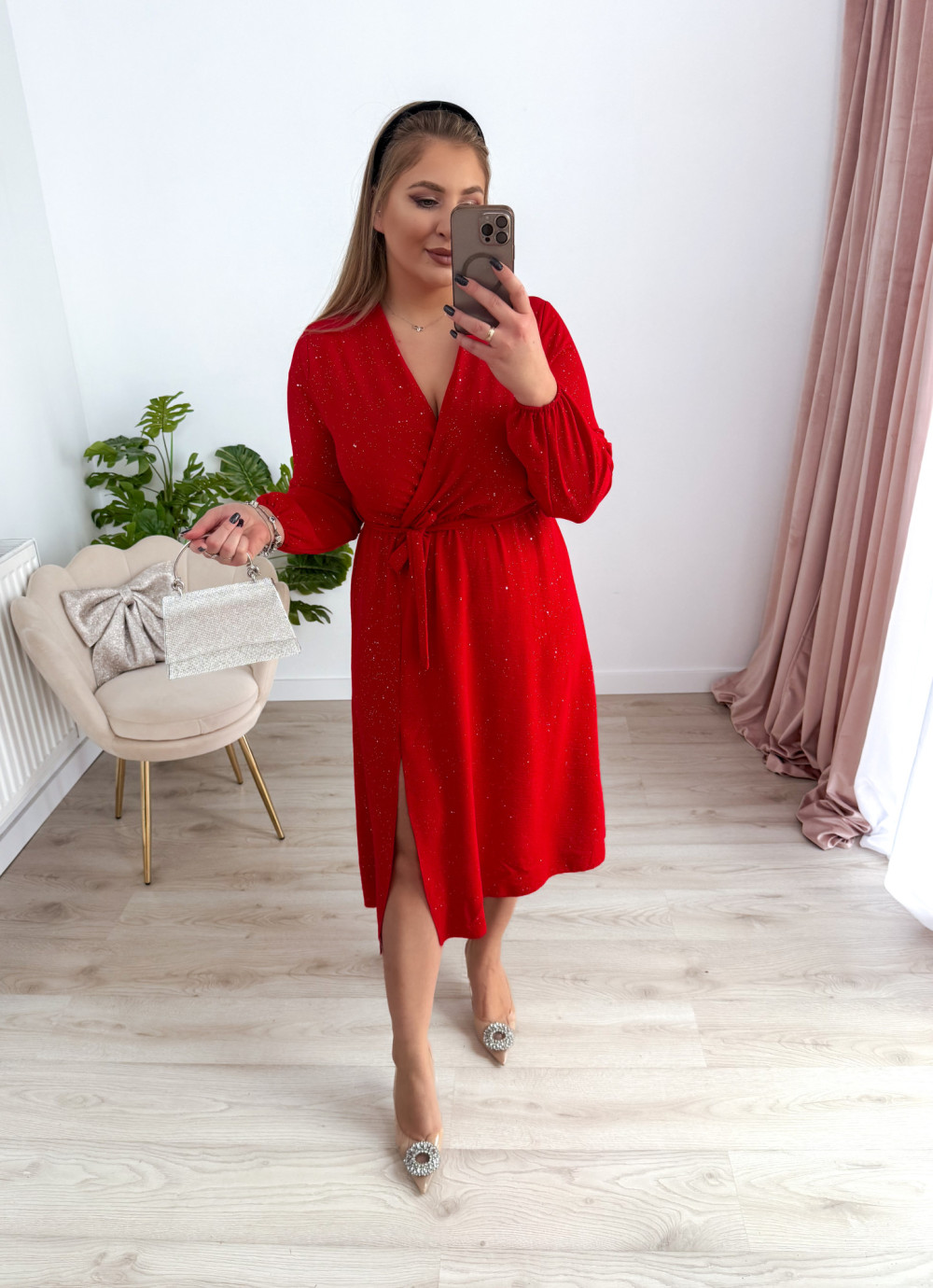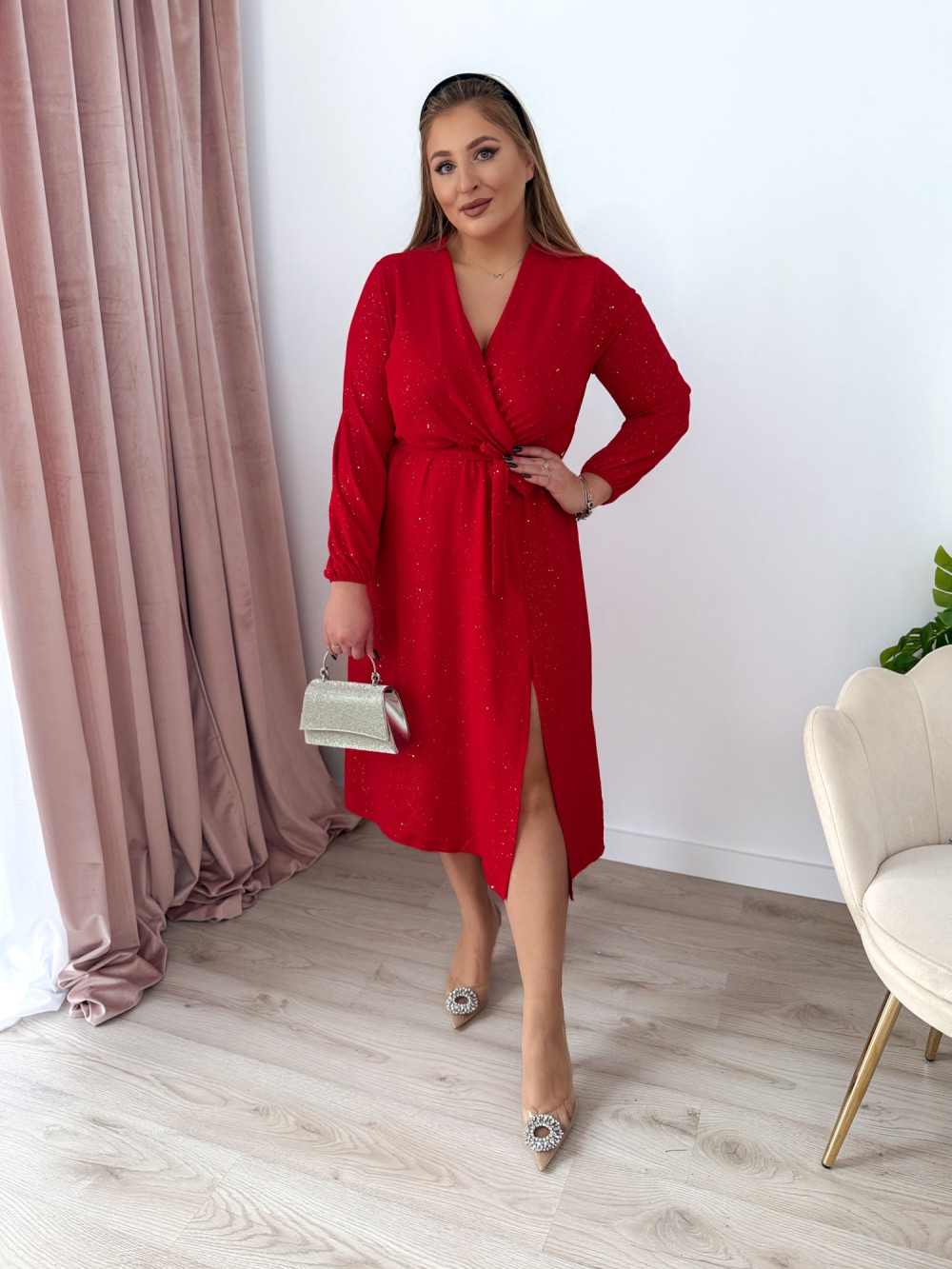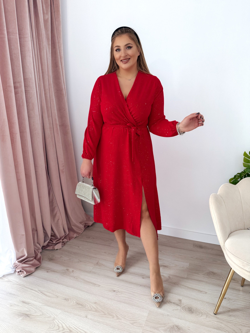 Sukienka nietoperzowa midi z rozcięciem na nogę i srebrnymi drobinkami Marina - czerwona