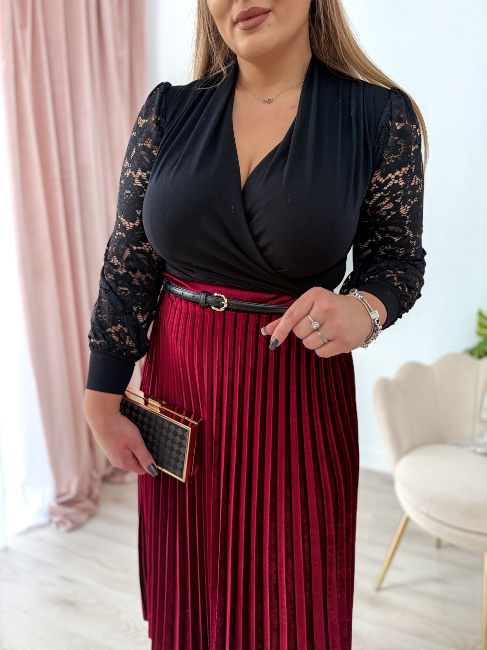 - Koronkowe, długie rękawy dodające elegancji i kobiecego uroku
