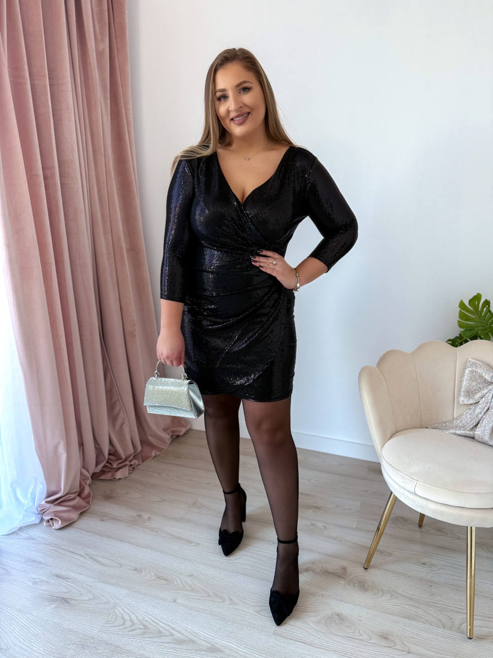 Sukienka cekinowa o dopasowanym kroju to propozycja stworzona dla kobiet, które chcą błyszczeć na każdej imprezie. Krótka długość podkreśla nogi, a zakładany dekolt dodaje elegancji i subtelnie eksponuje szyję. Rękaw 3/4 sprawia, że model prezentuje się szykownie i jest idealny na różne okazje – od uroczystości po wieczorne wyjścia. Mieniące się cekiny gwarantują spektakularny efekt, dzięki któremu nie pozostaniesz niezauważona.