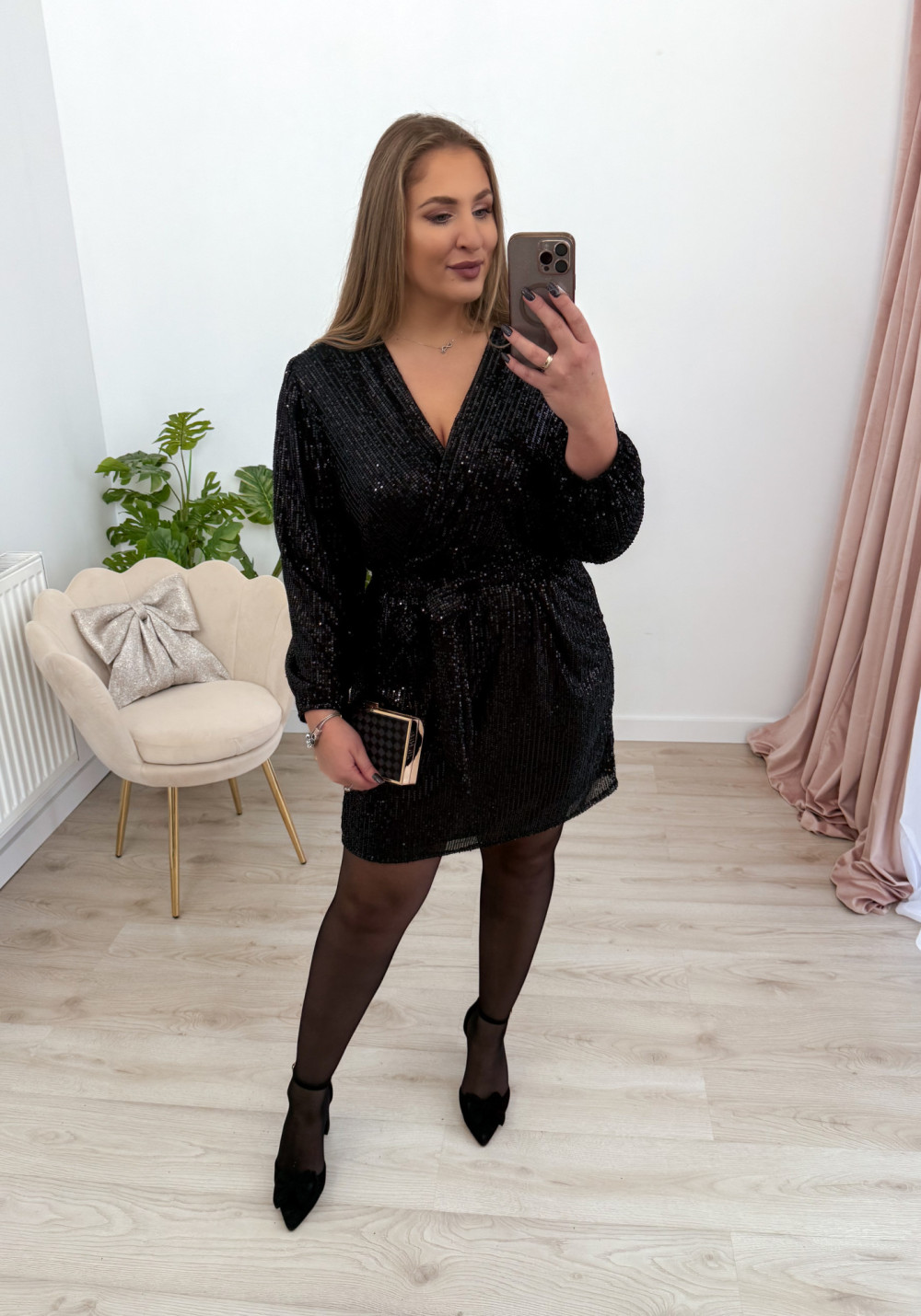 Sukienka krótka cekinowa wiązana w talii Oksana - czarna