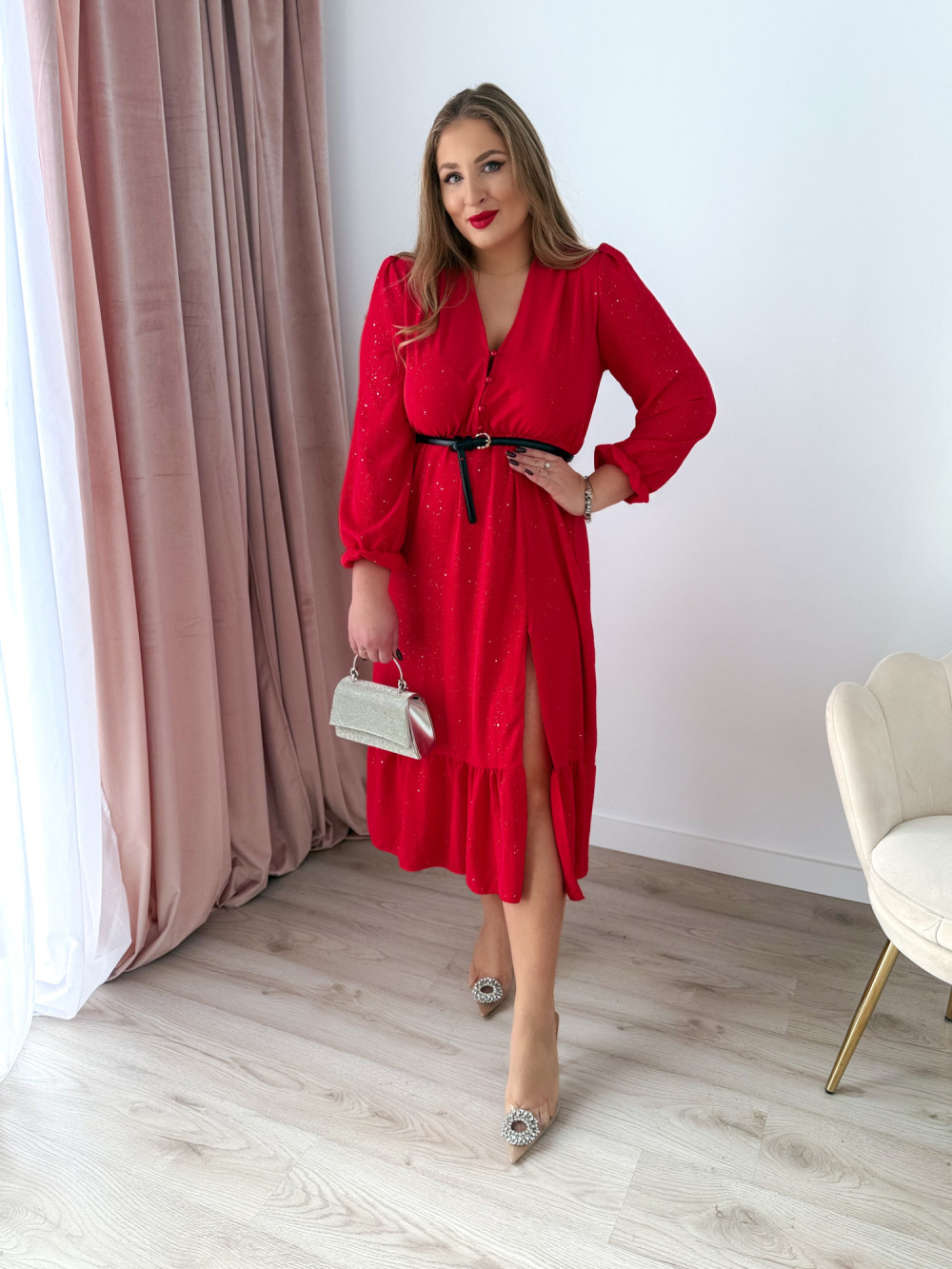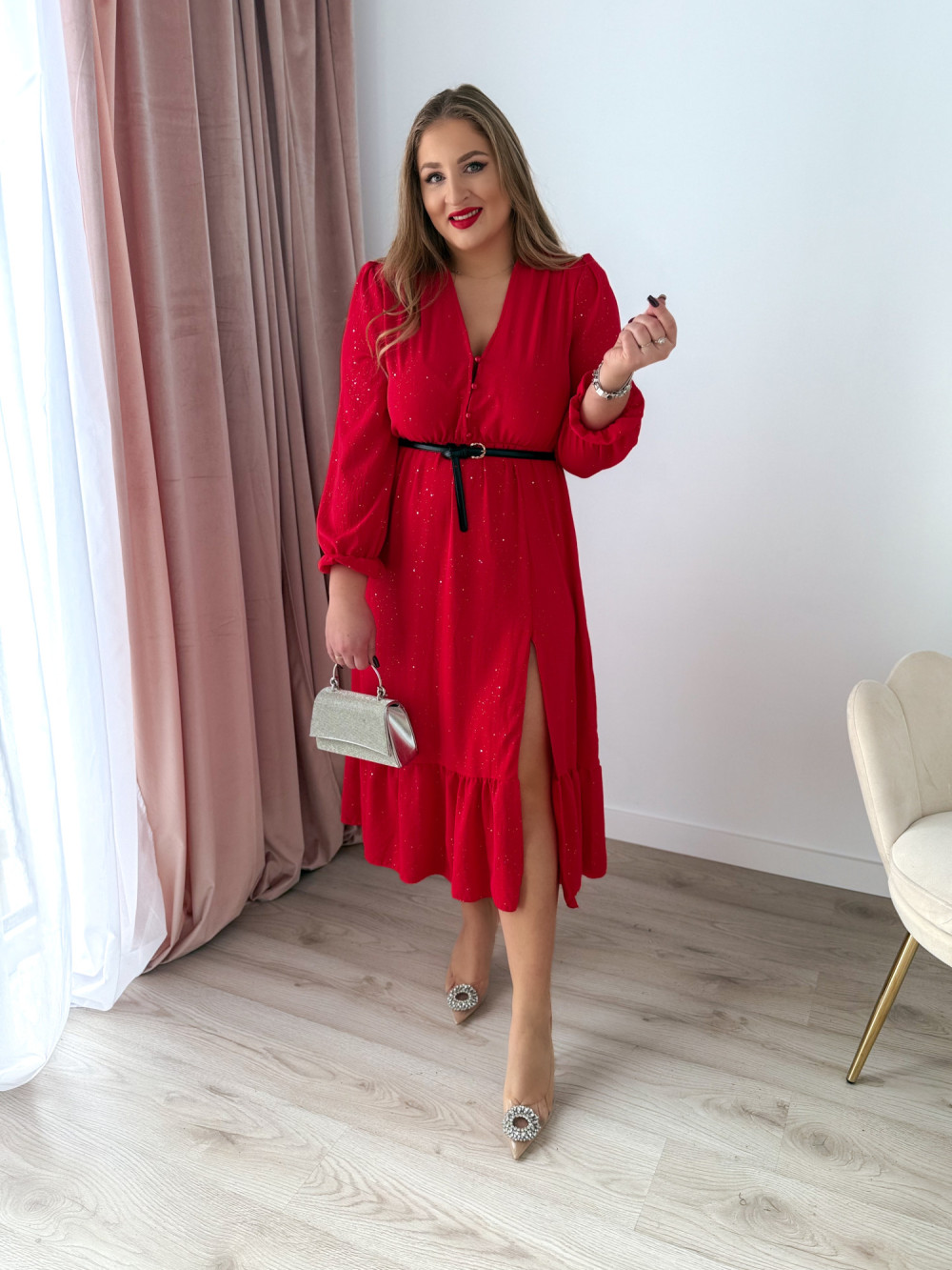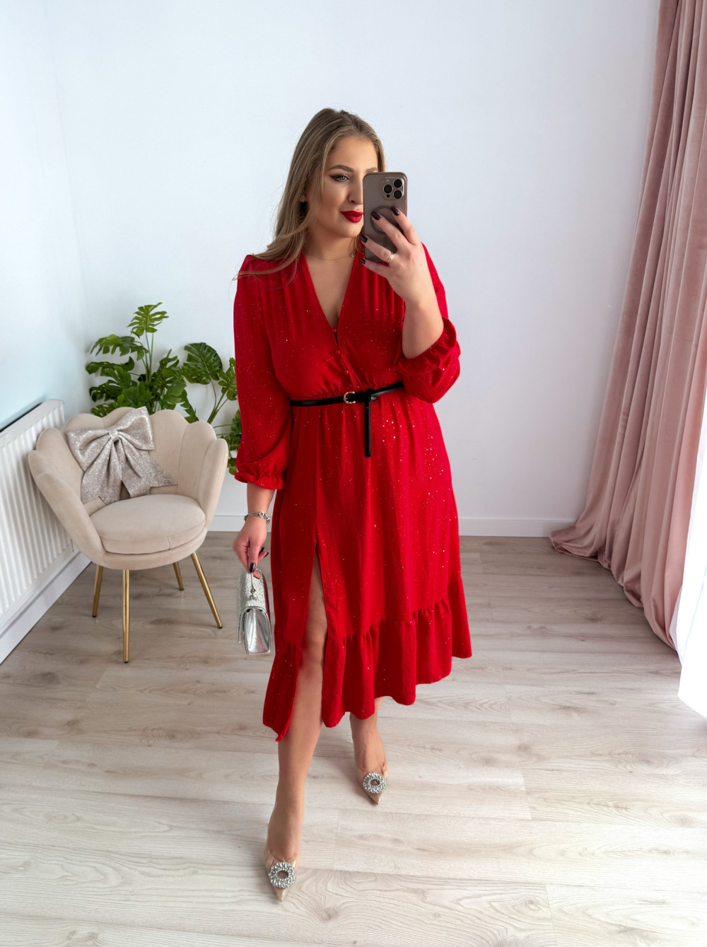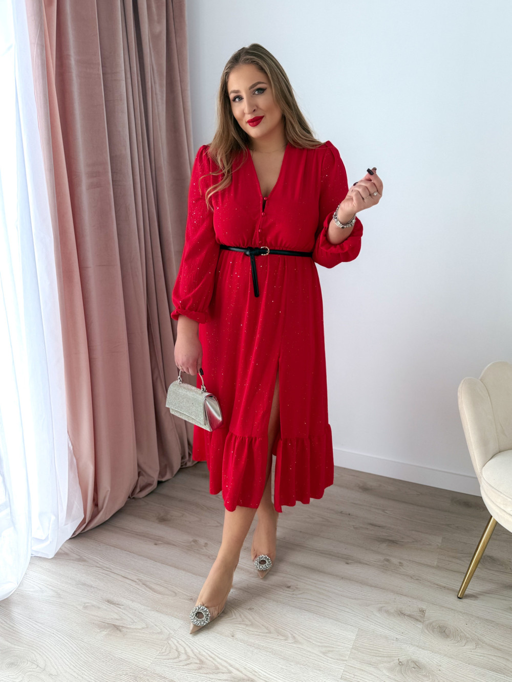 Sukienka midi z rozcięciem na nodze i srebrnymi drobinkami Belle - czerwona