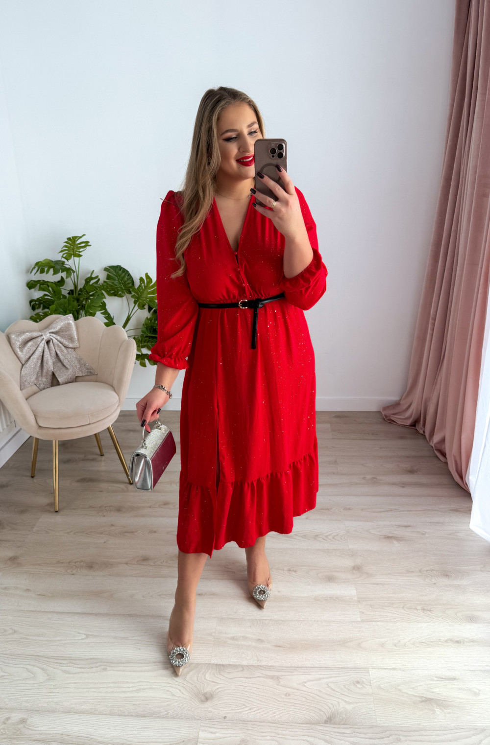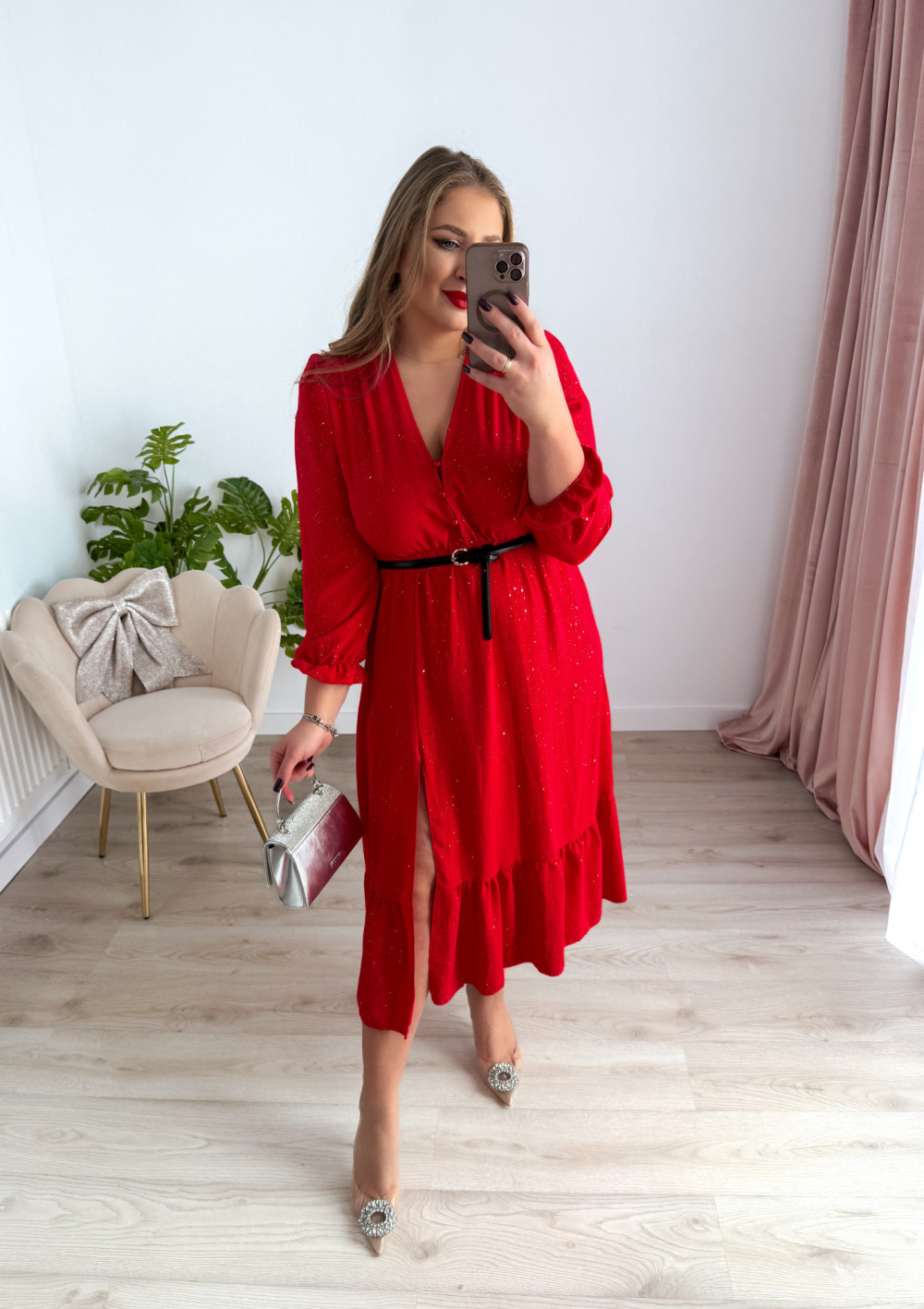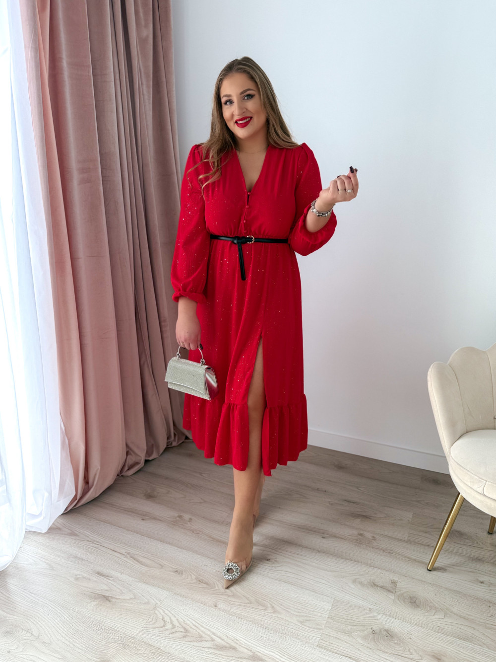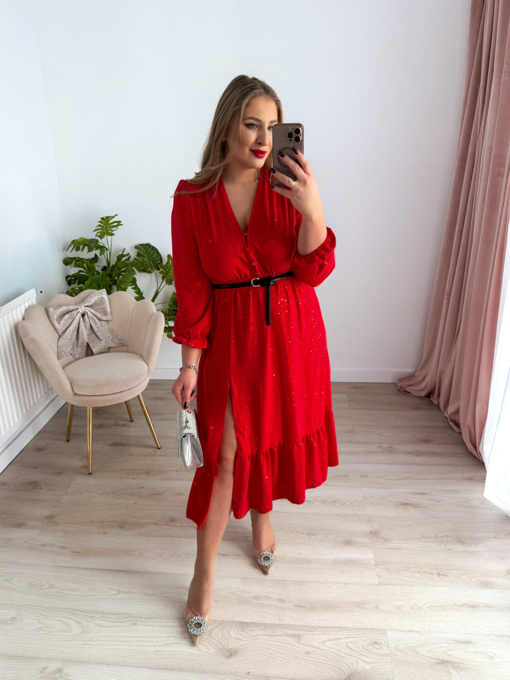 Sukienka midi z rozcięciem na nodze i srebrnymi drobinkami Belle - czerwona