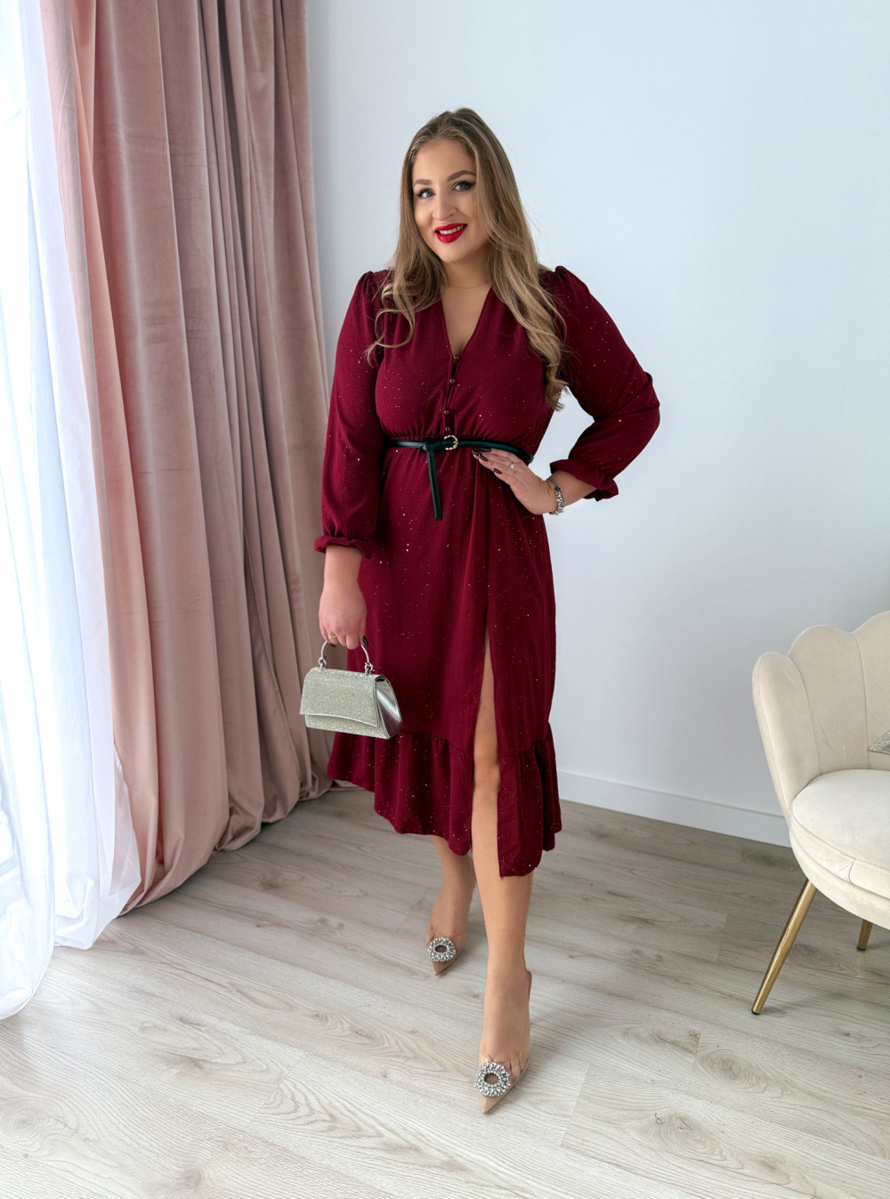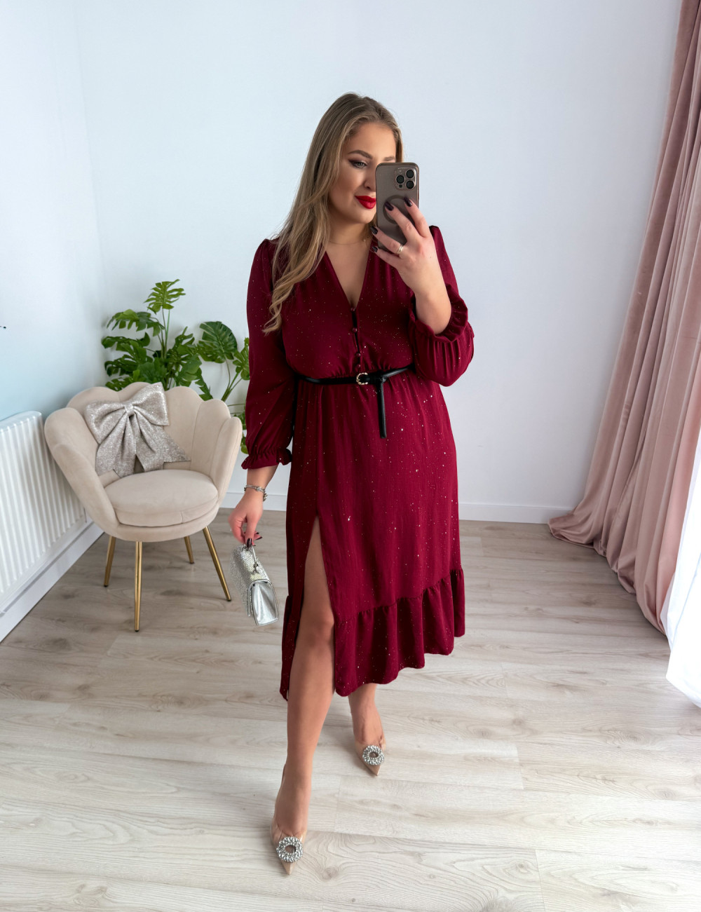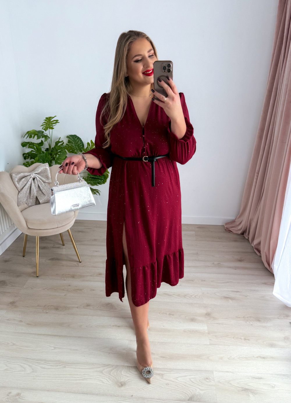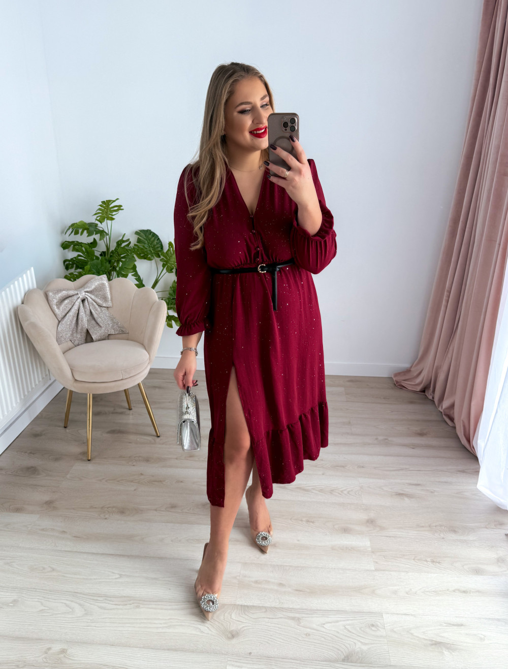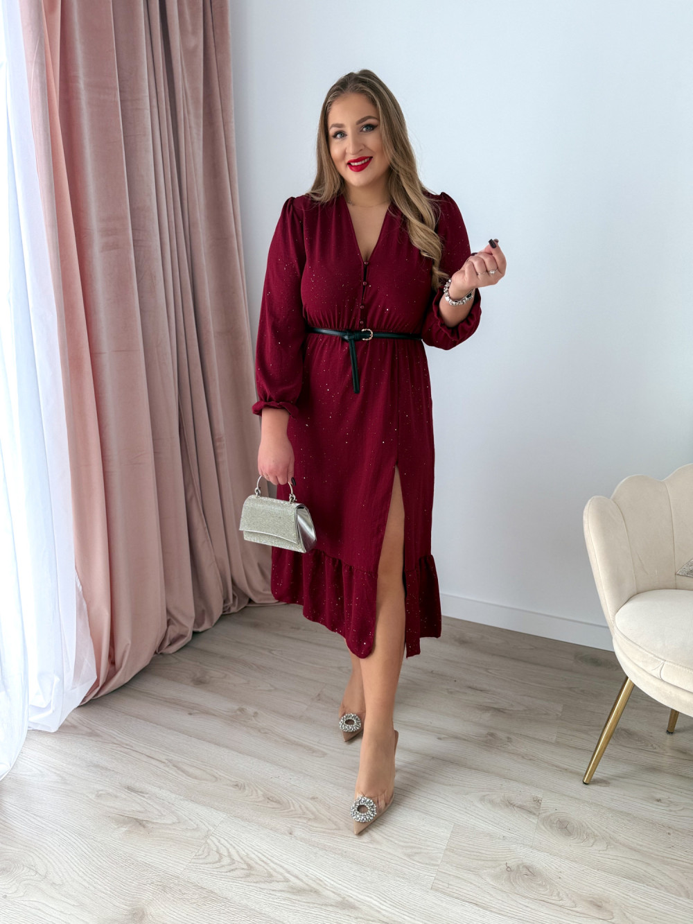 Sukienka midi z rozcięciem na nodze i srebrnymi drobinkami Belle - bordo