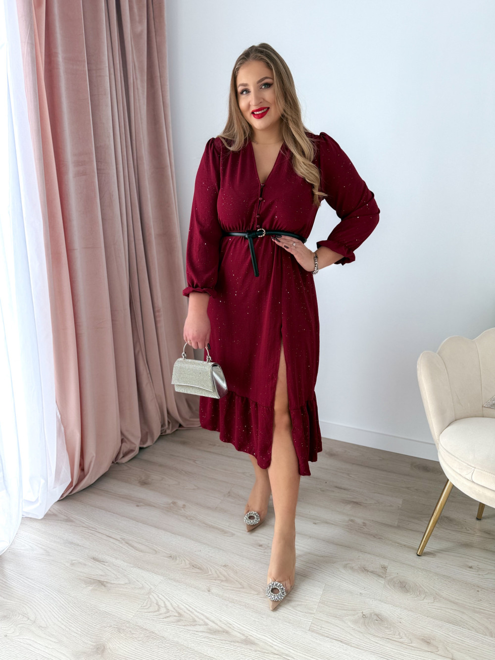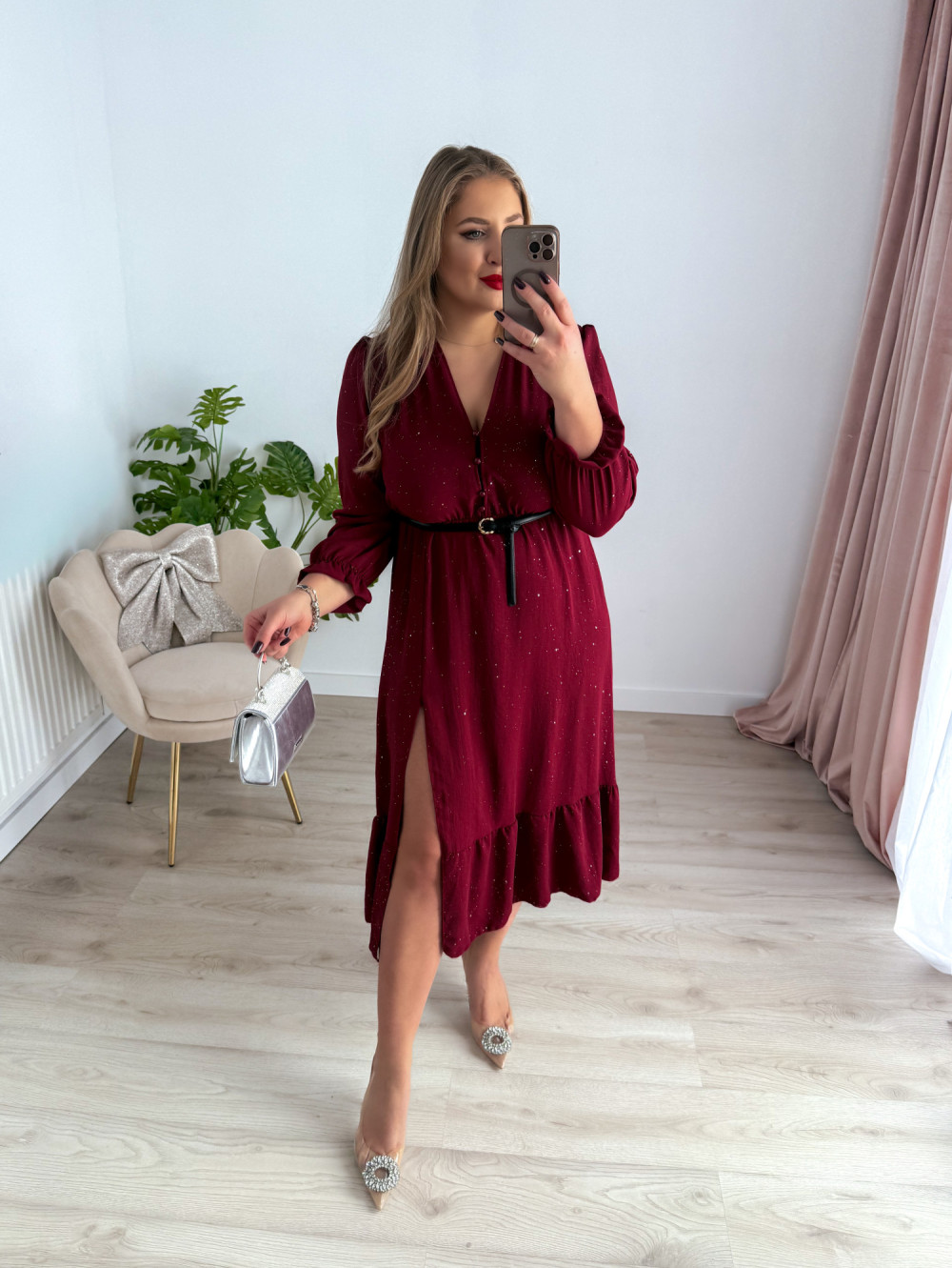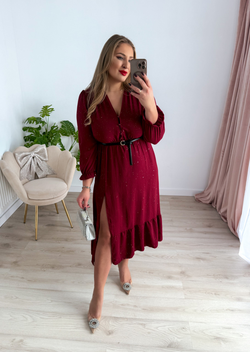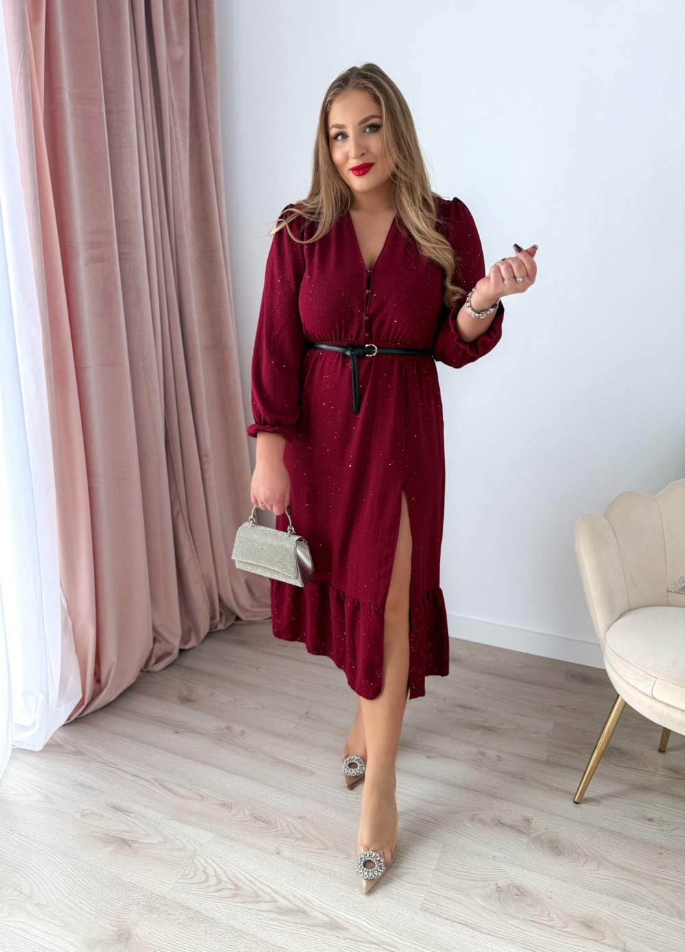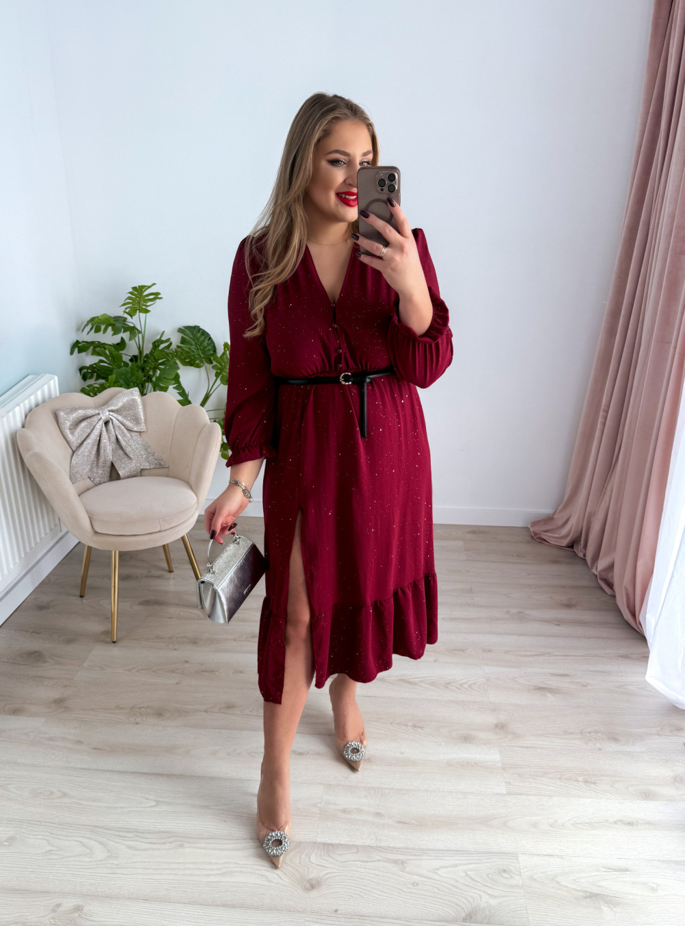 Sukienka midi z rozcięciem na nodze i srebrnymi drobinkami Belle - bordo