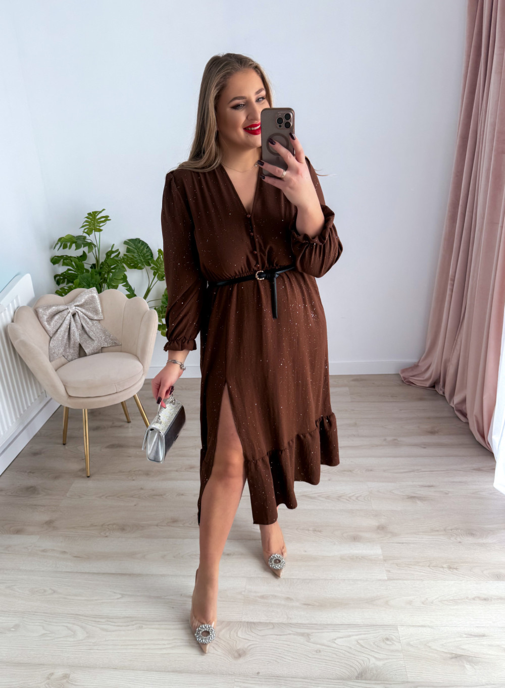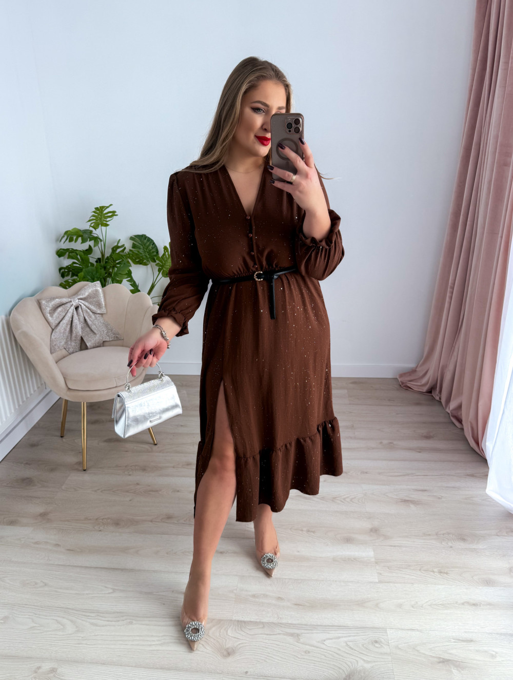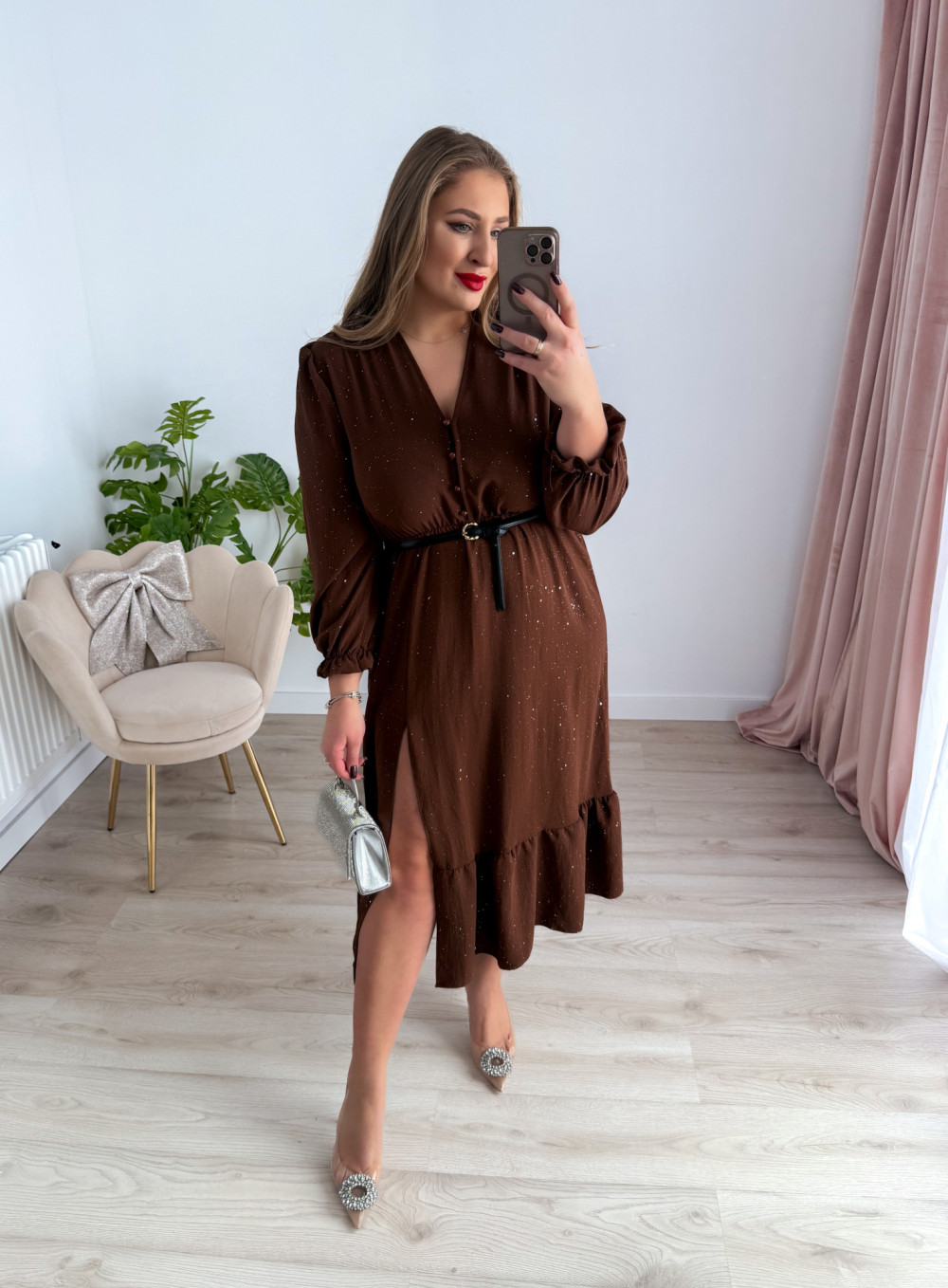 Sukienka midi z rozcięciem na nodze i srebrnymi drobinkami Belle - mleczna czekolada