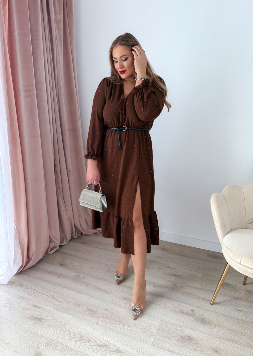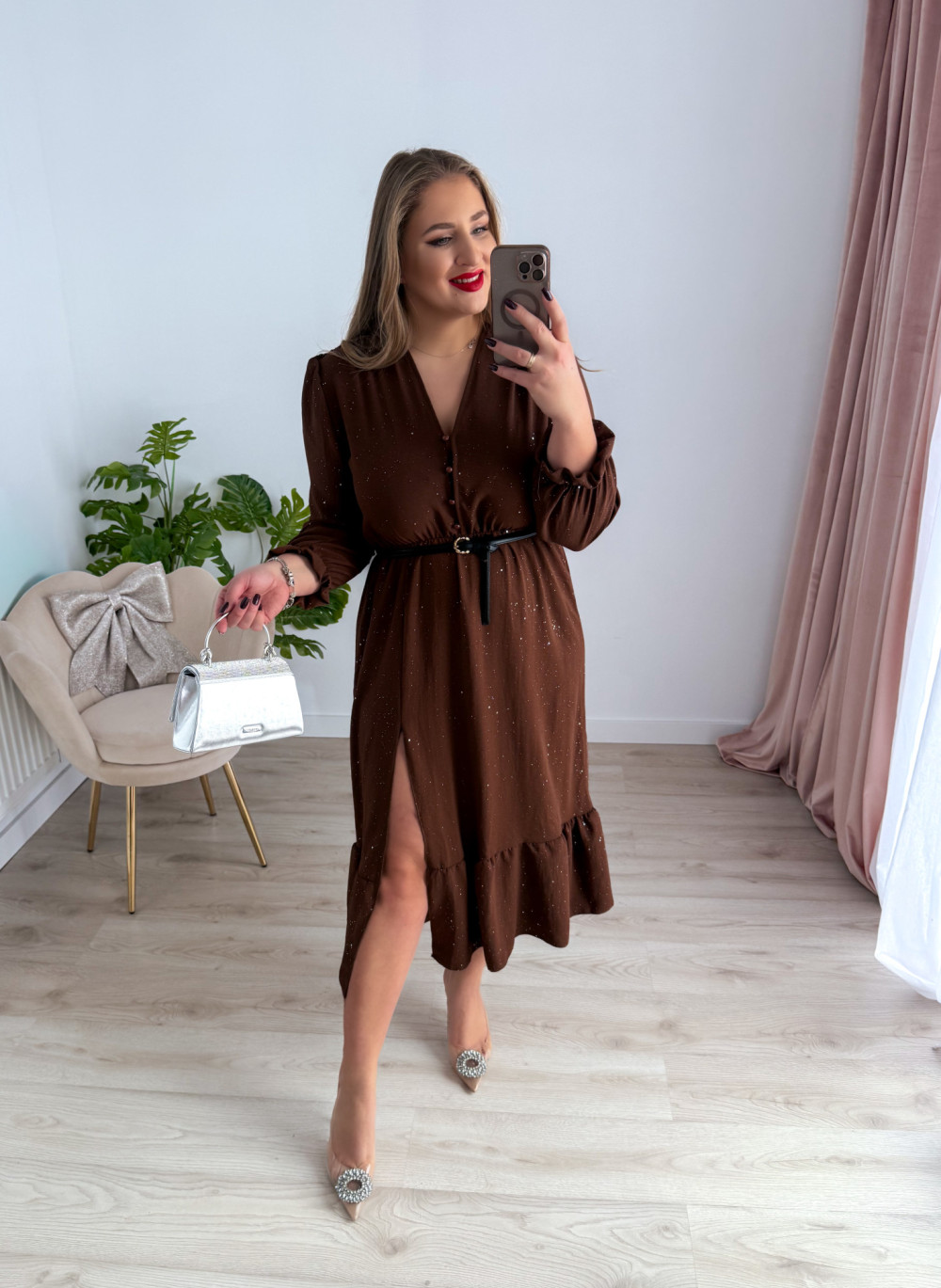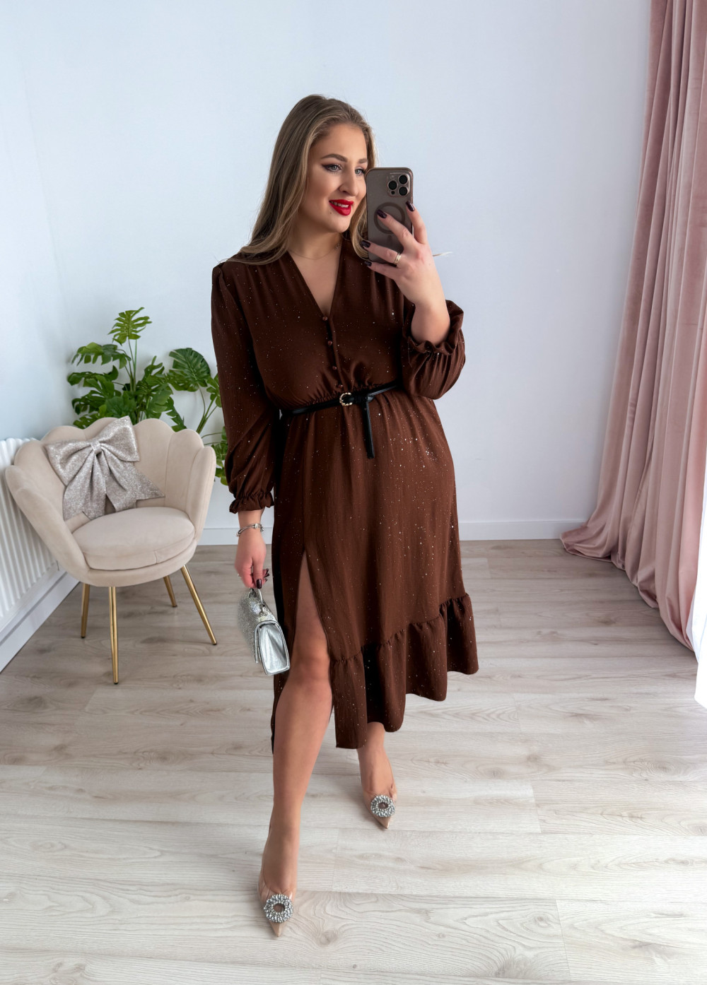 Sukienka midi z rozcięciem na nodze i srebrnymi drobinkami Belle - mleczna czekolada