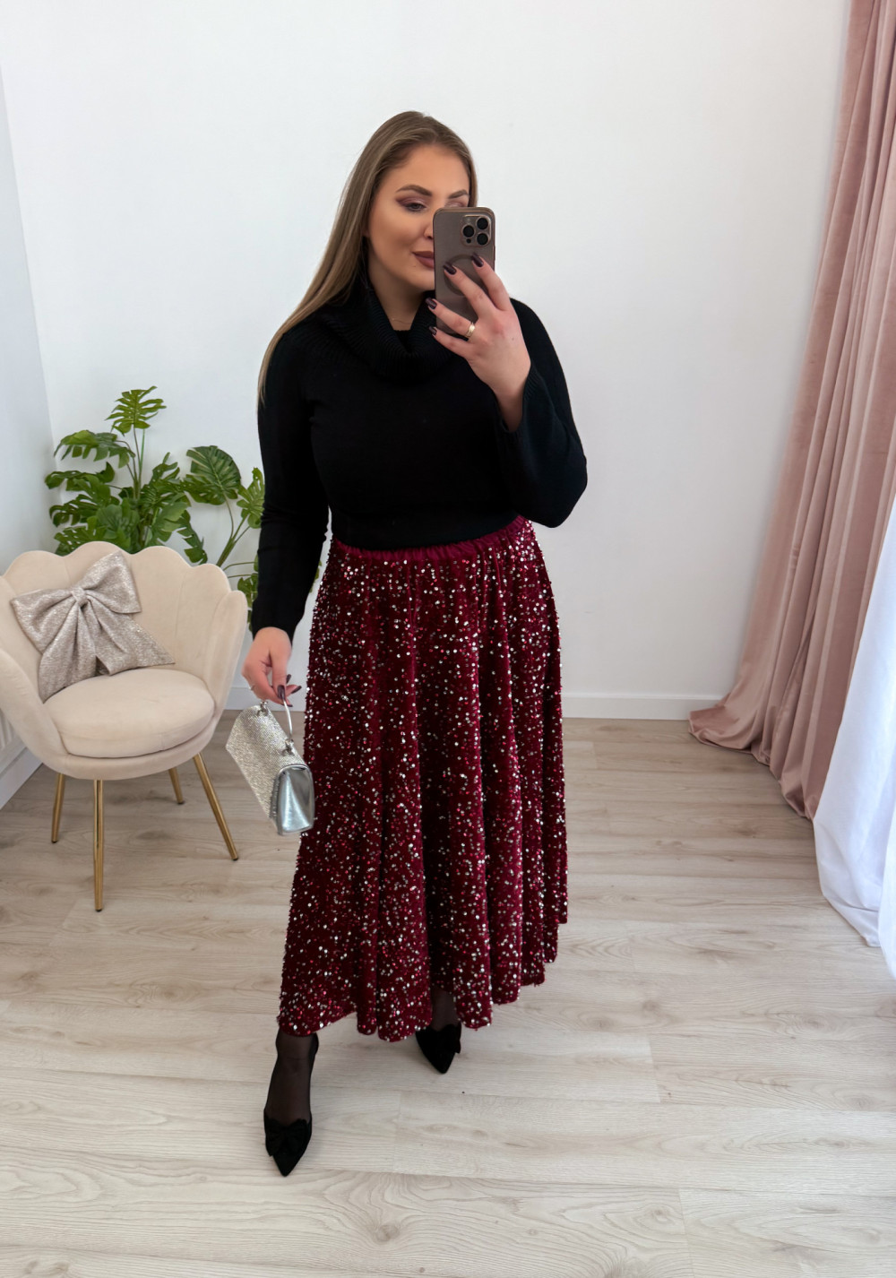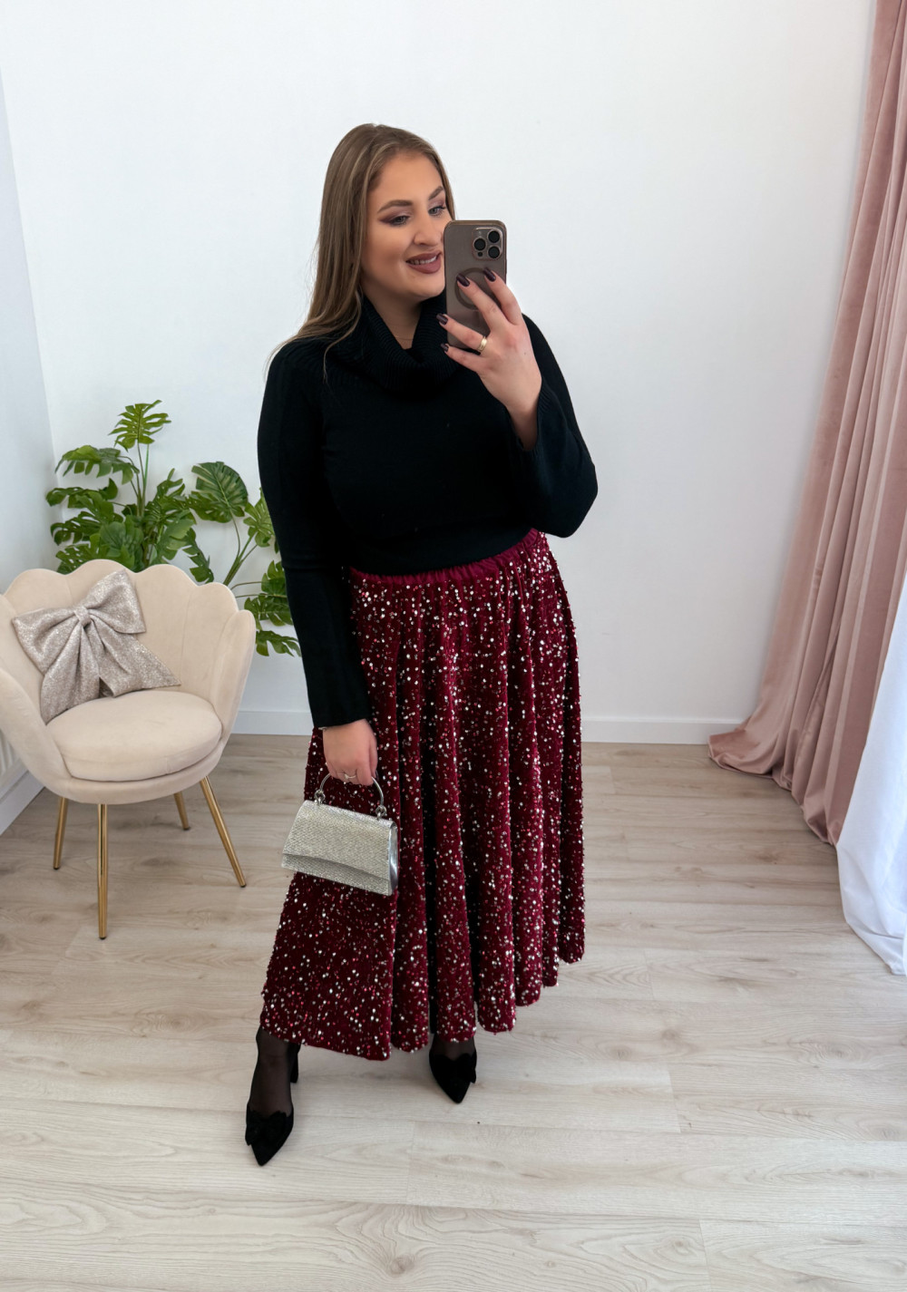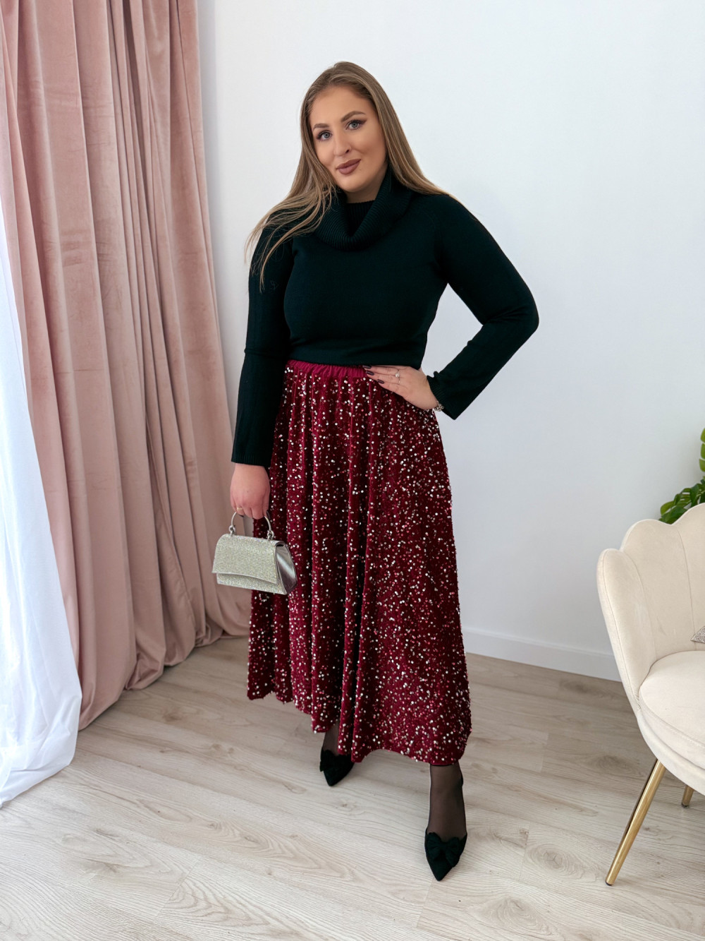 Spódnica maxi błyszcząca cekinowa Shine - srebrne cekiny na bordowym welurze