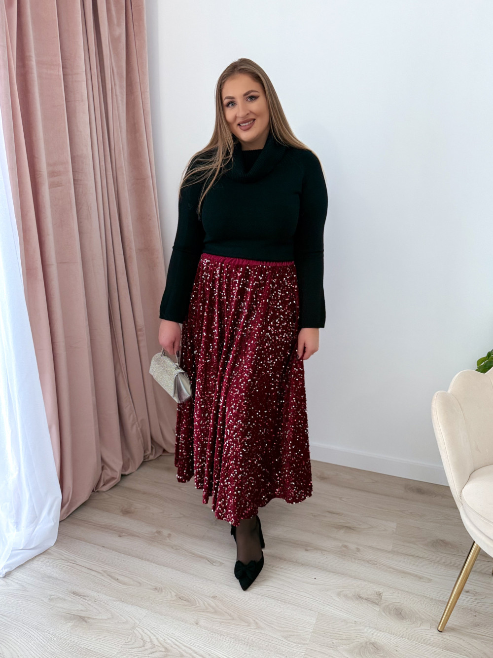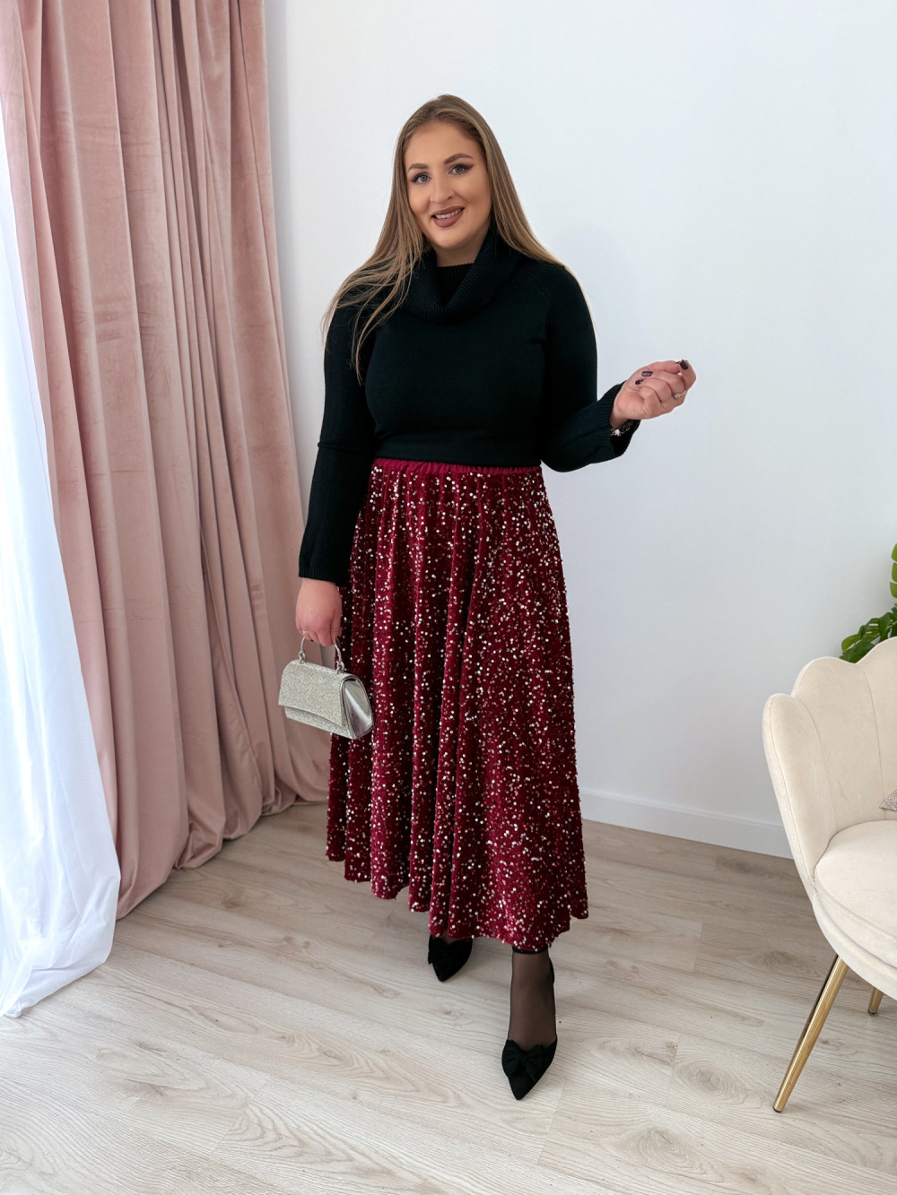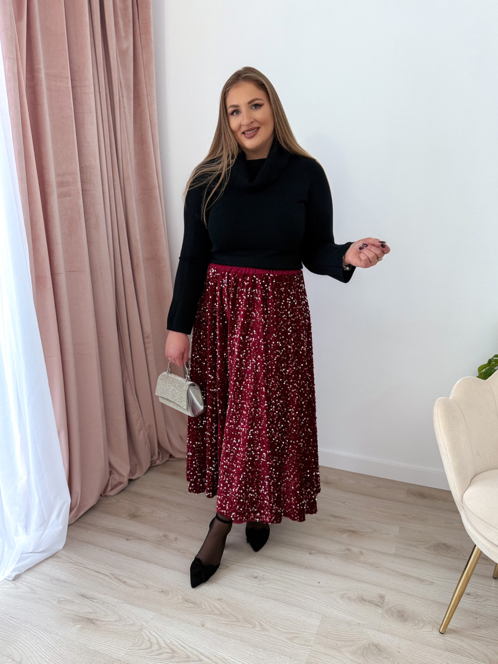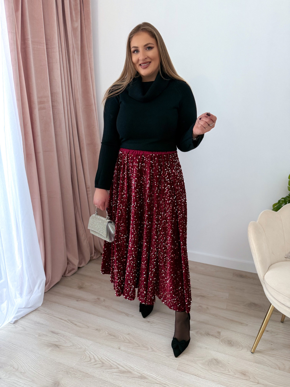 Spódnica maxi w całości pokryta mieniącymi się cekinami to propozycja, która zachwyca efektem glamour. Welurowa baza nadaje jej miękkości i głębi, pięknie współgrając z połyskującą powierzchnią. Elastyczna gumka w pasie zapewnia komfort noszenia i idealne dopasowanie do sylwetki. To model, który przyciąga wzrok i doskonale sprawdzi się na wyjątkowe wyjścia, świąteczne stylizacje oraz wieczorne imprezy.