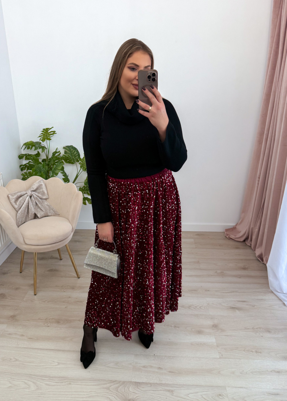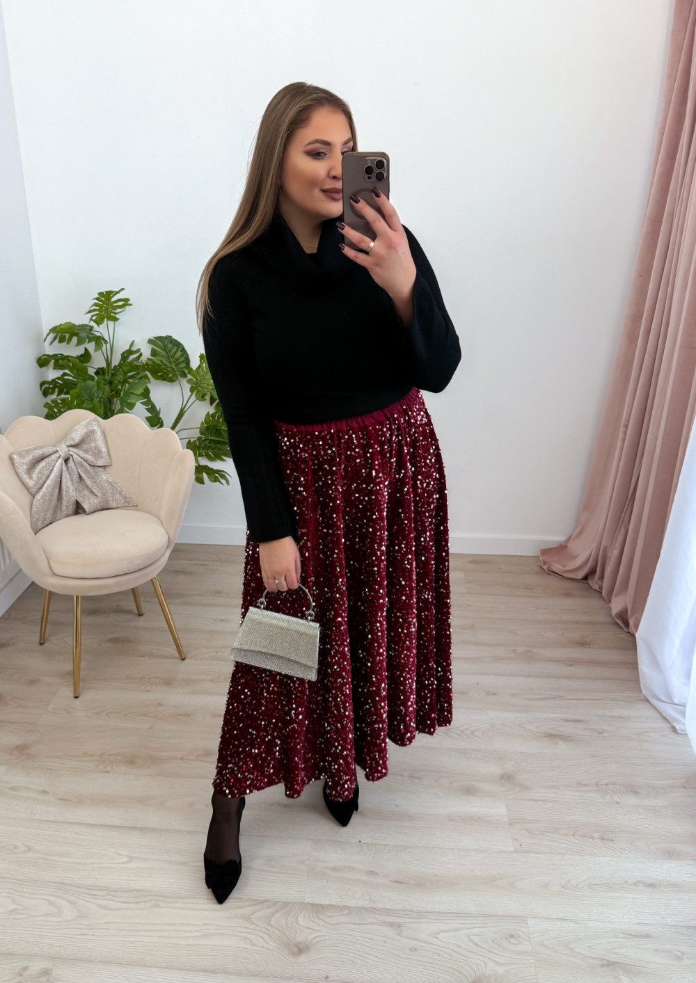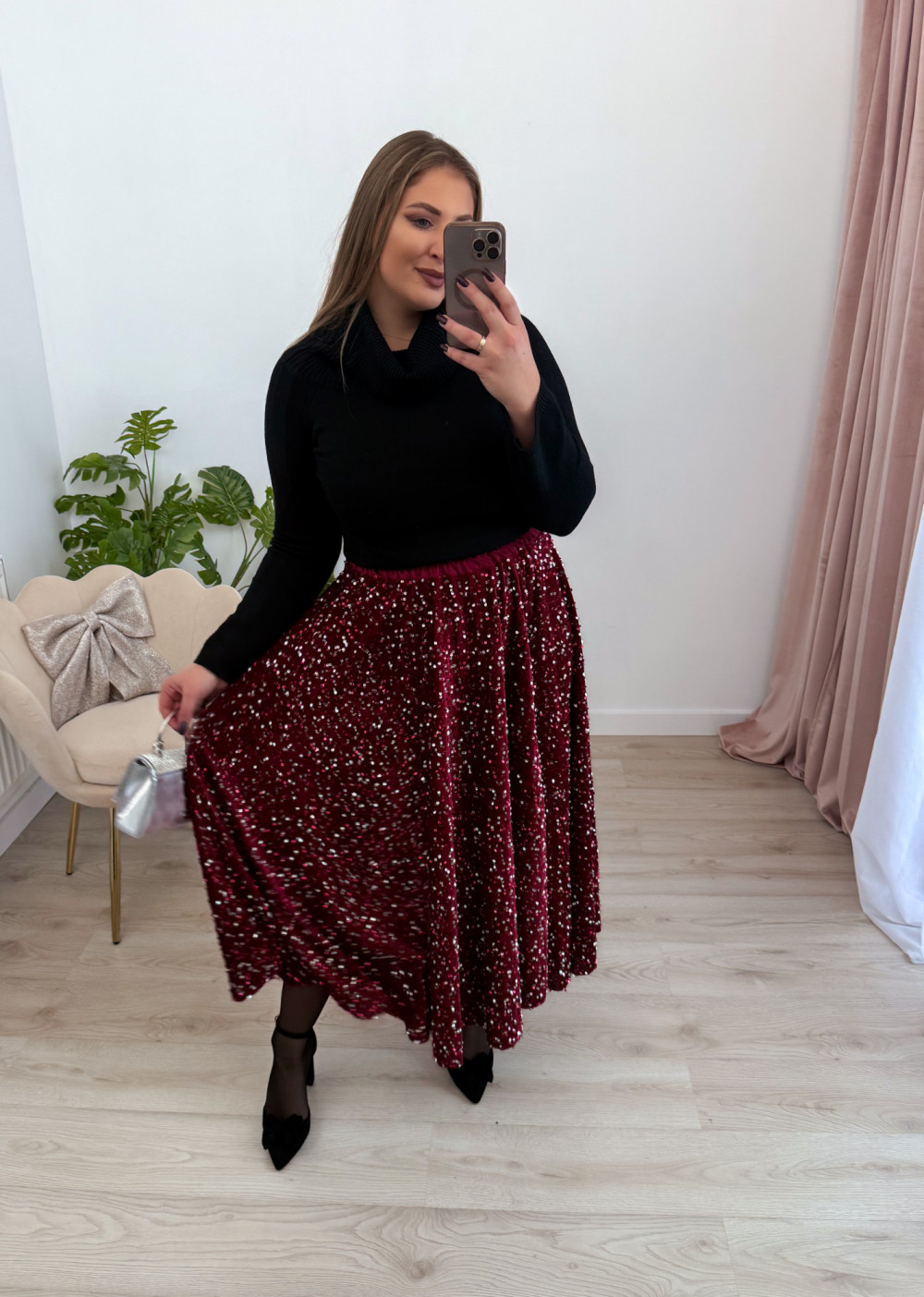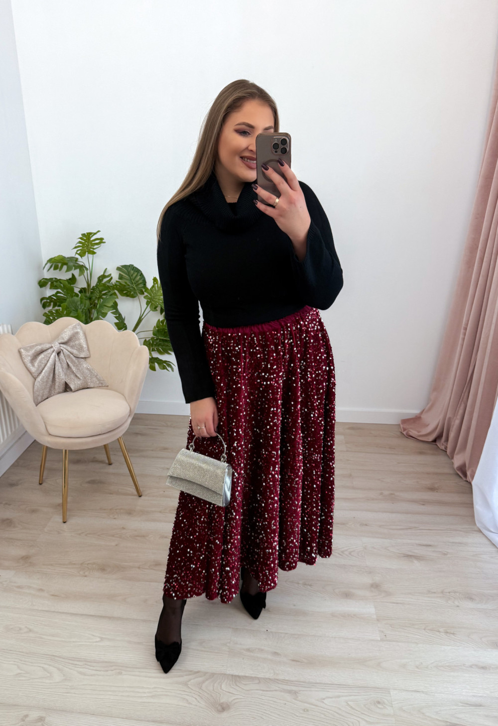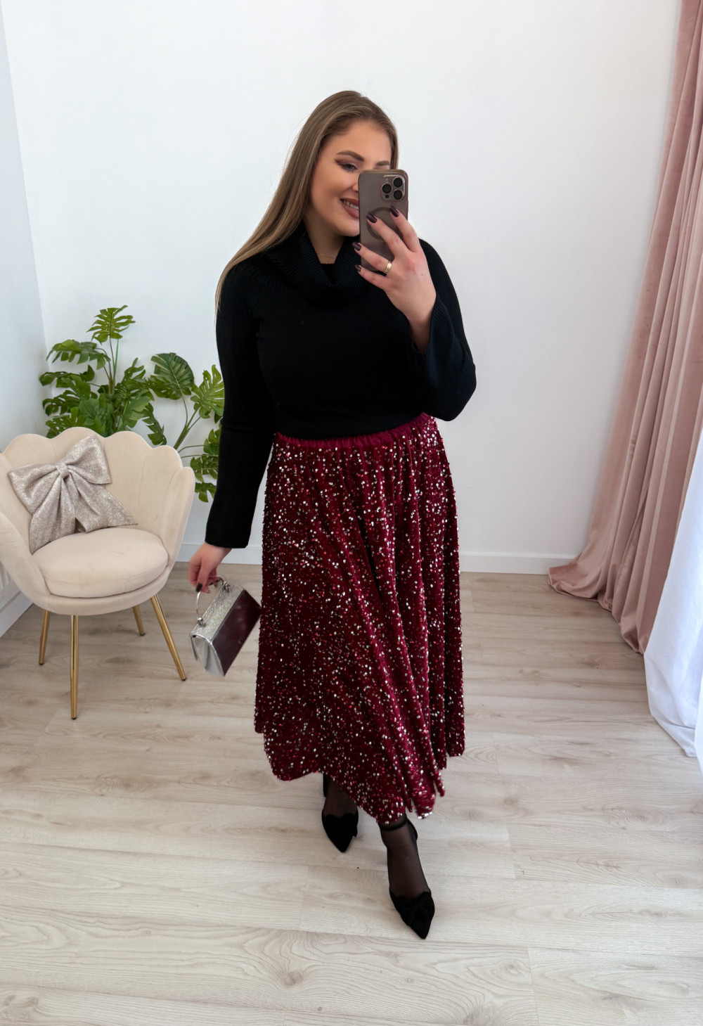 Spódnica maxi w całości pokryta mieniącymi się cekinami to propozycja, która zachwyca efektem glamour. Welurowa baza nadaje jej miękkości i głębi, pięknie współgrając z połyskującą powierzchnią. Elastyczna gumka w pasie zapewnia komfort noszenia i idealne dopasowanie do sylwetki. To model, który przyciąga wzrok i doskonale sprawdzi się na wyjątkowe wyjścia, świąteczne stylizacje oraz wieczorne imprezy.