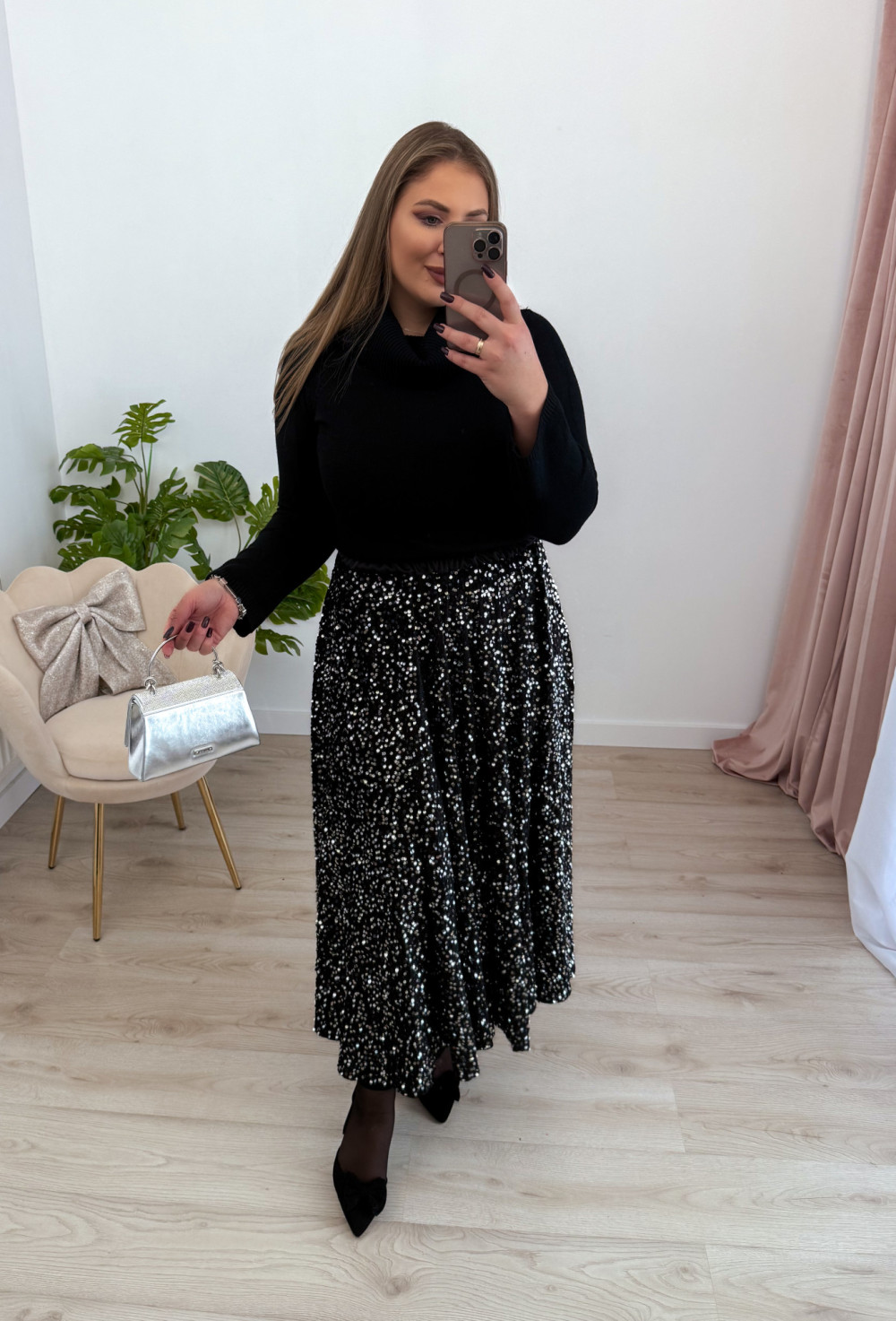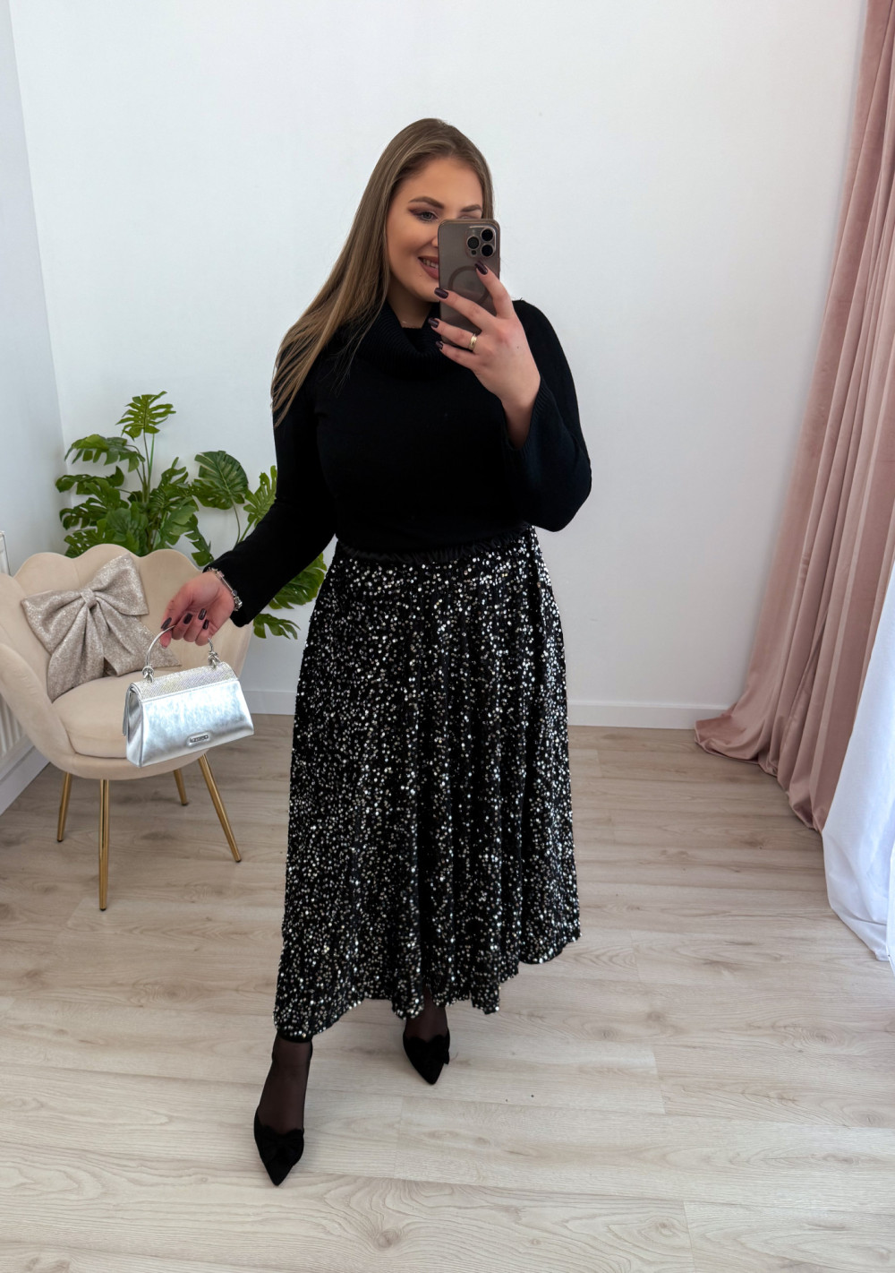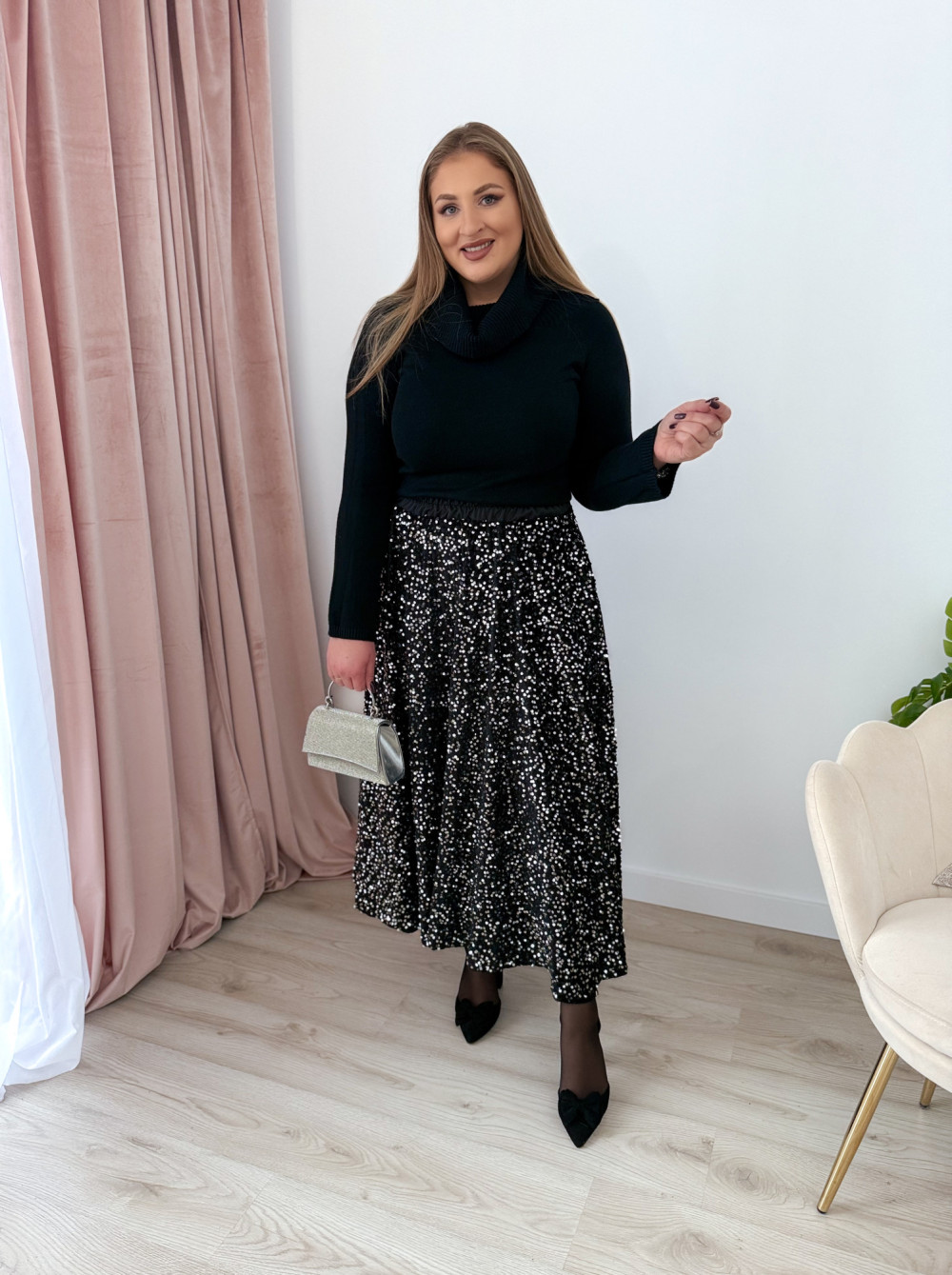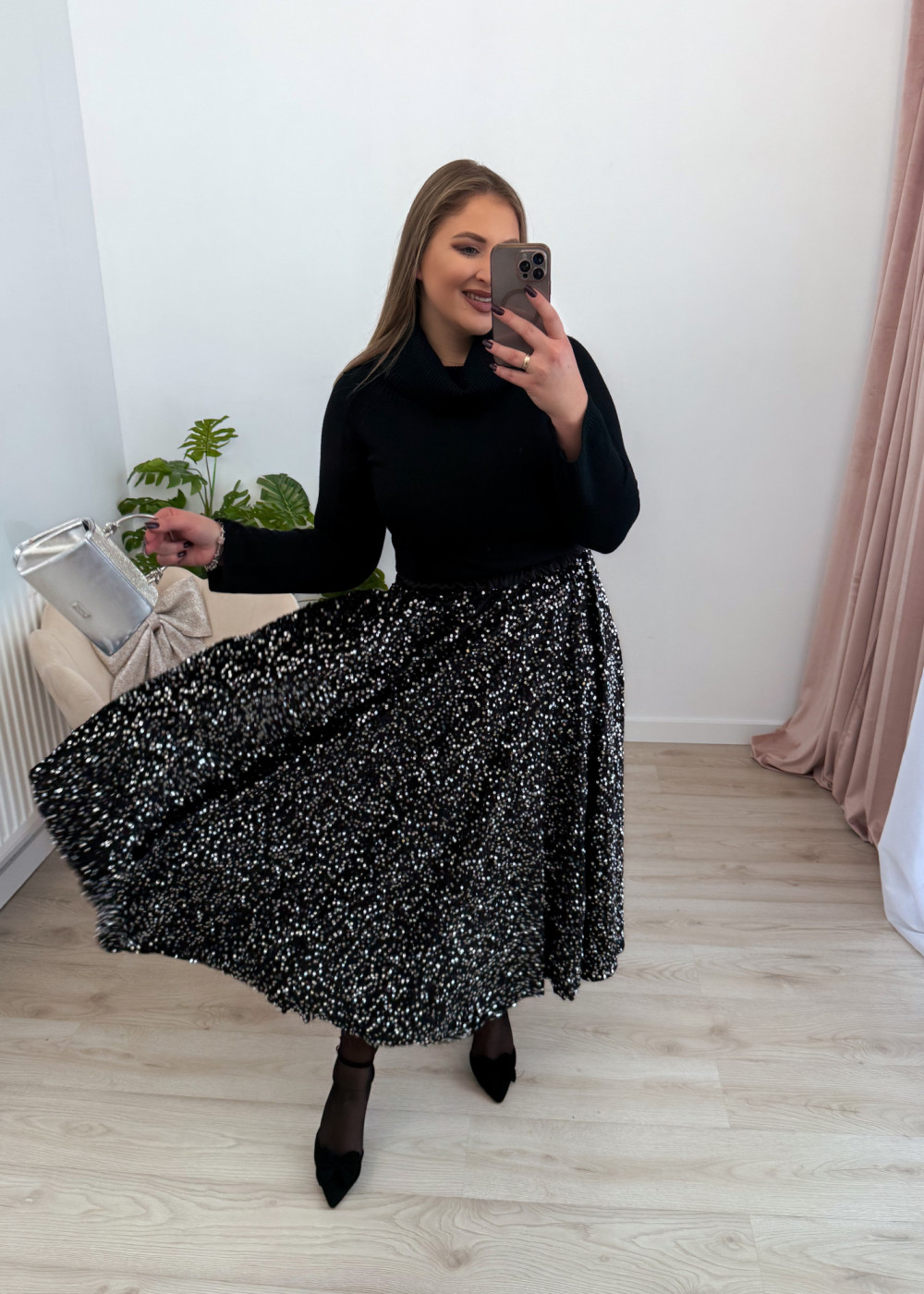 Spódnica maxi błyszcząca cekinowa Shine - srebrne cekiny na czarnym welurze