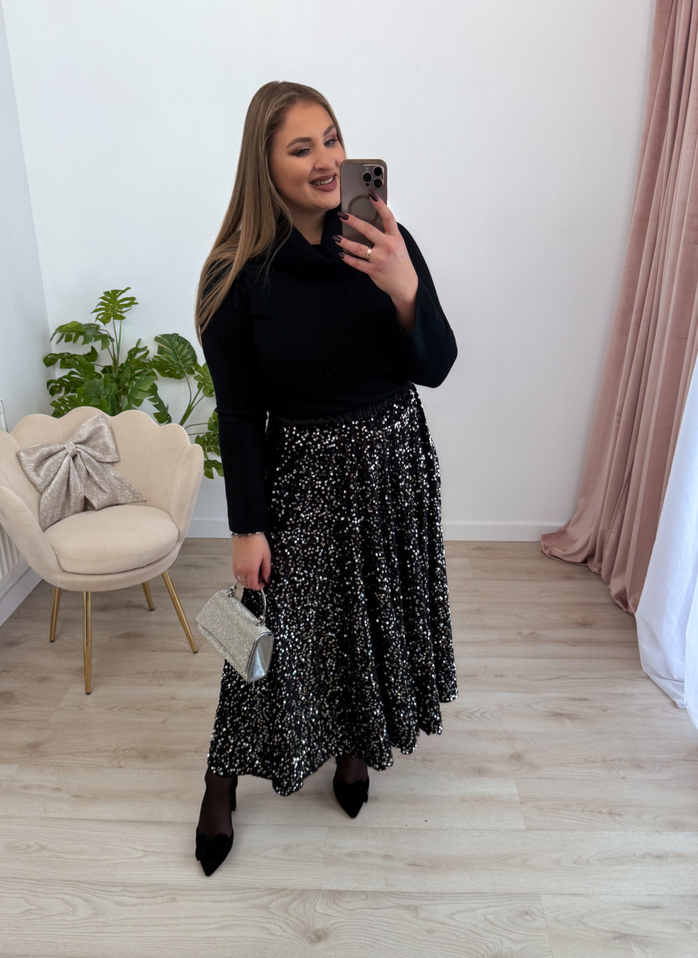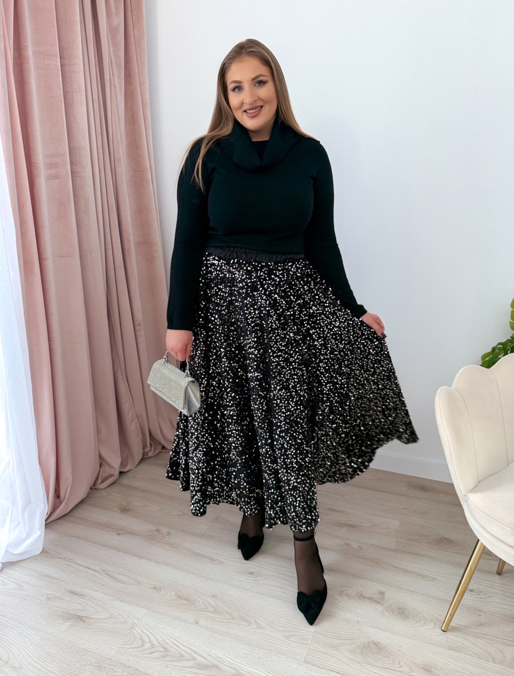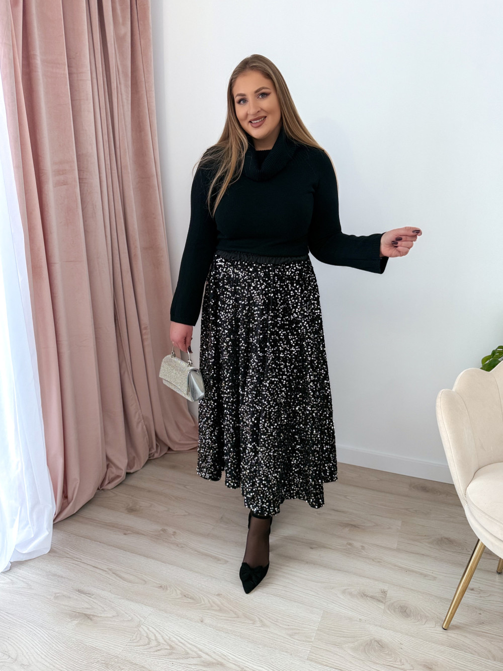 Spódnica maxi błyszcząca cekinowa Shine - srebrne cekiny na czarnym welurze
