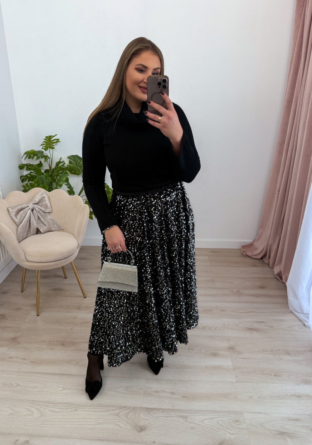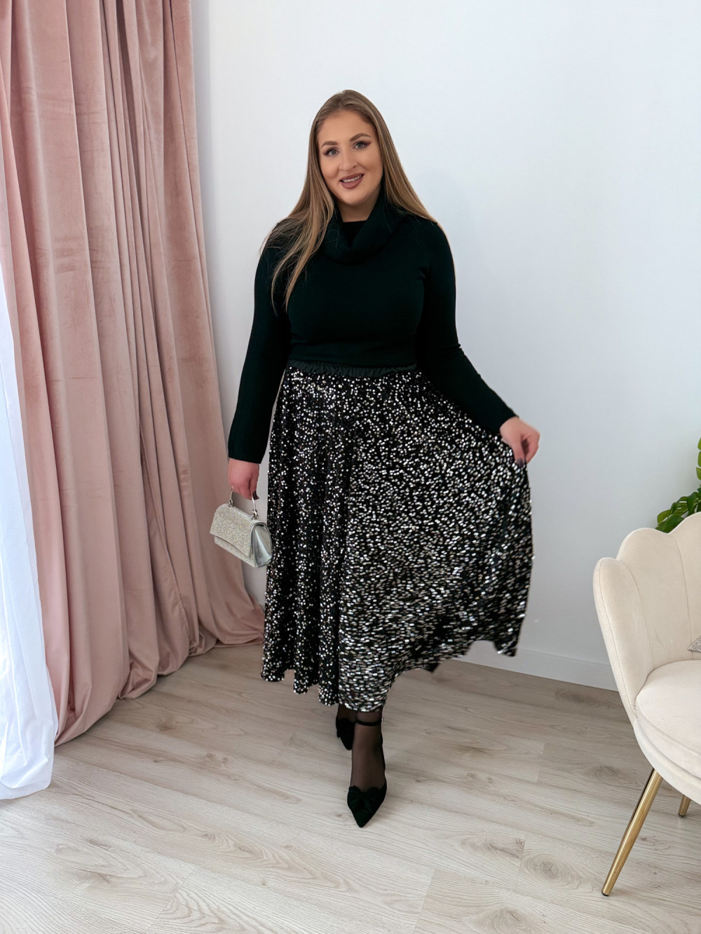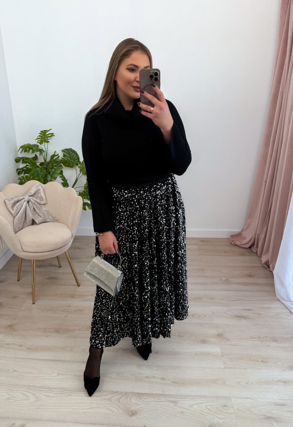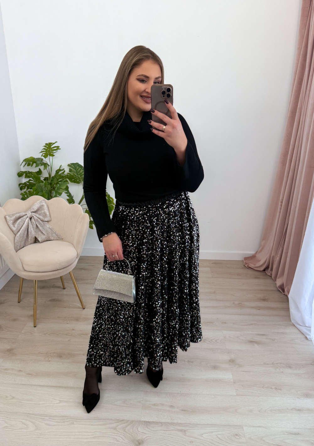 Spódnica maxi błyszcząca cekinowa Shine - srebrne cekiny na czarnym welurze