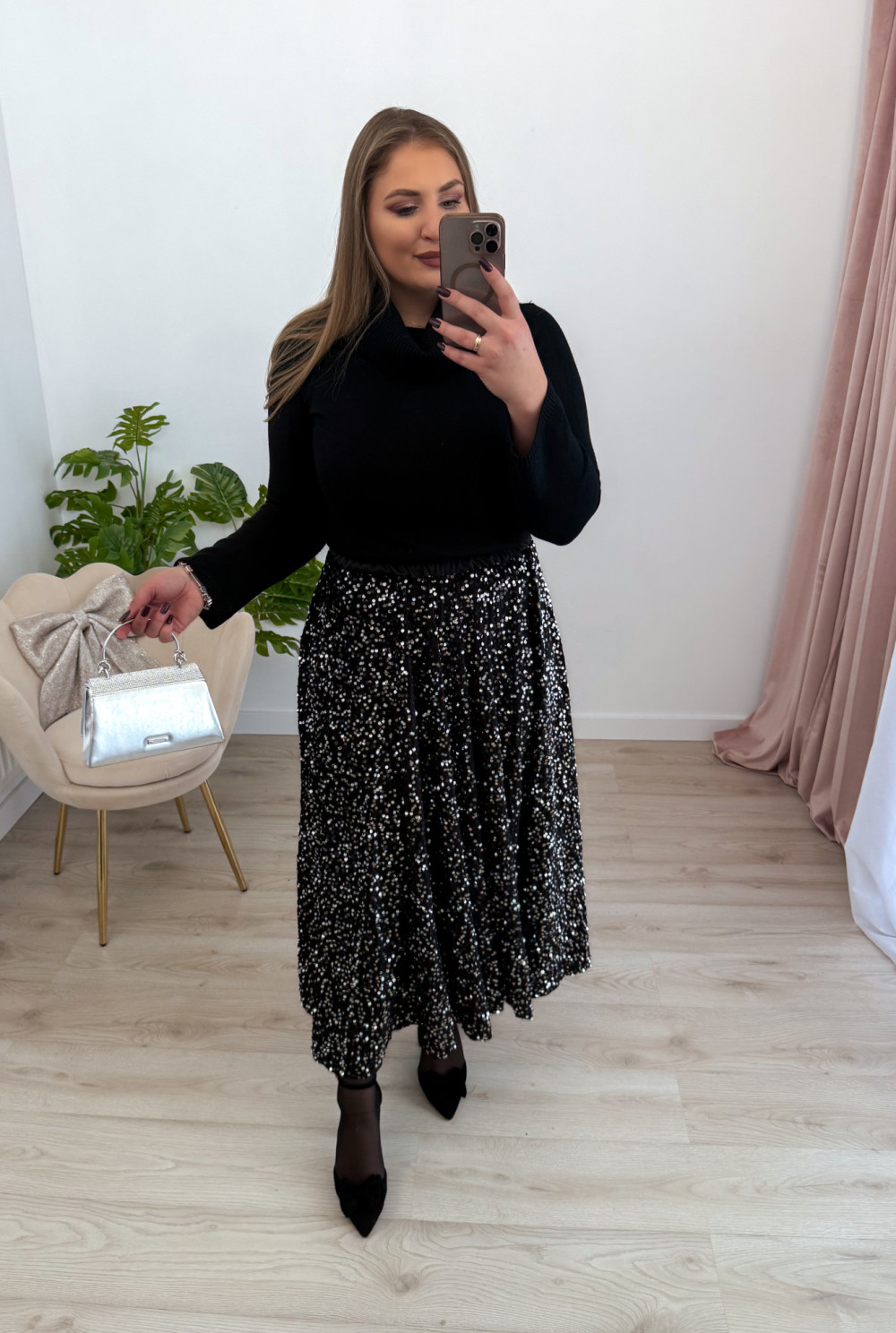 Spódnica maxi w całości pokryta mieniącymi się cekinami to propozycja, która zachwyca efektem glamour. Welurowa baza nadaje jej miękkości i głębi, pięknie współgrając z połyskującą powierzchnią. Elastyczna gumka w pasie zapewnia komfort noszenia i idealne dopasowanie do sylwetki. To model, który przyciąga wzrok i doskonale sprawdzi się na wyjątkowe wyjścia, świąteczne stylizacje oraz wieczorne imprezy.