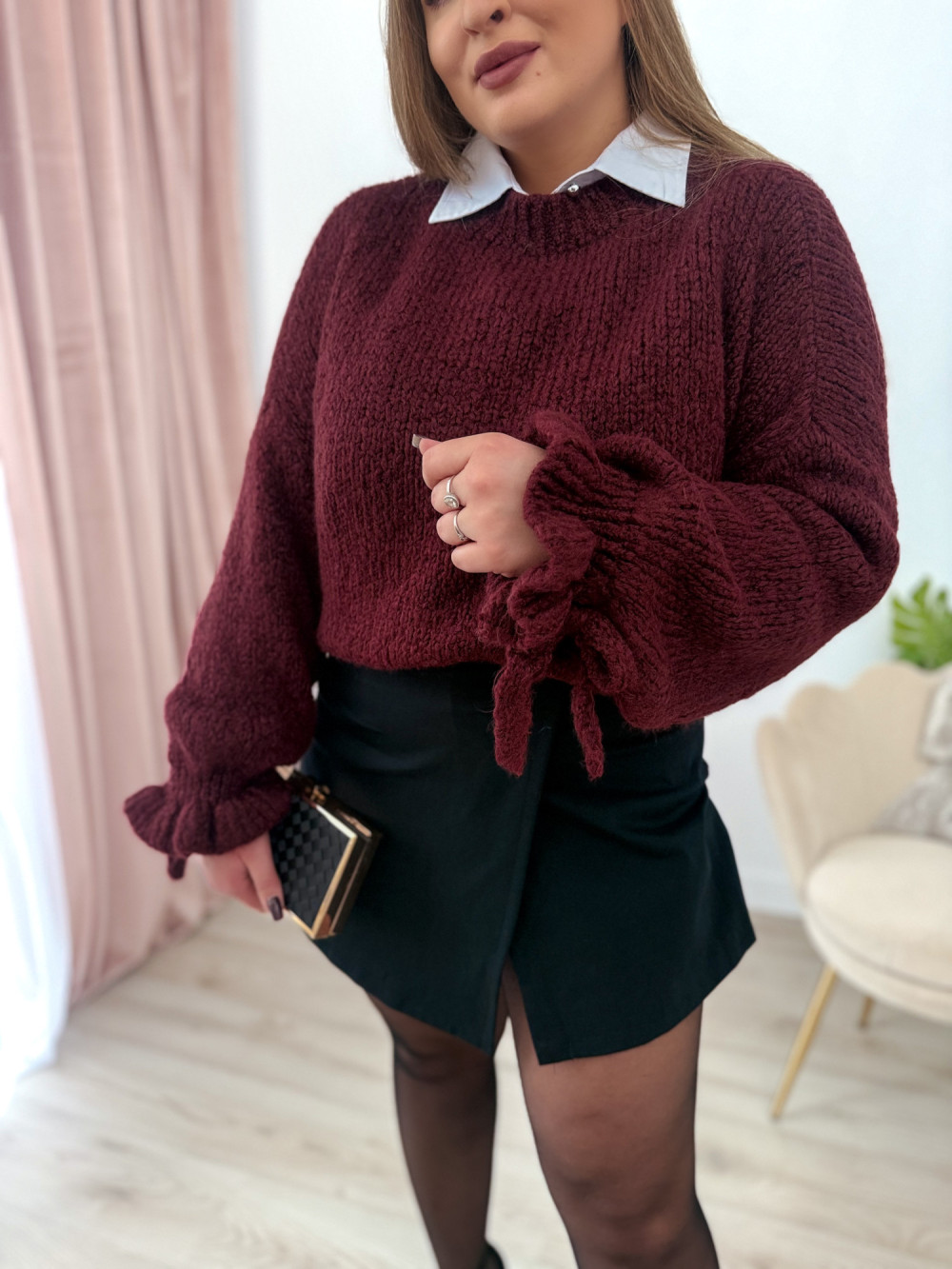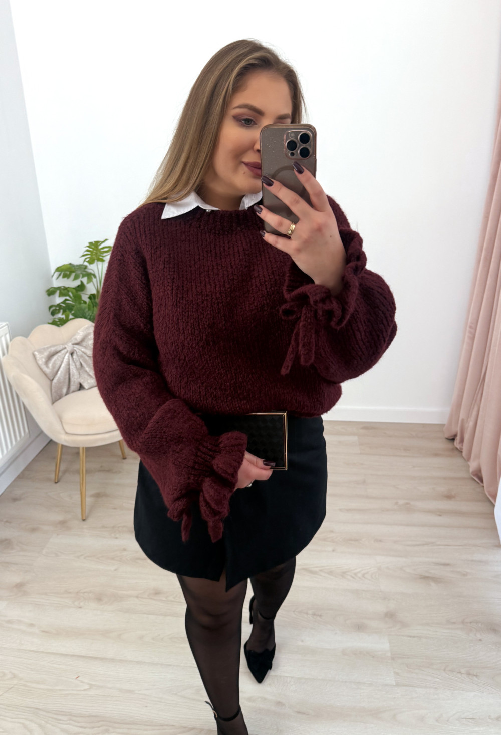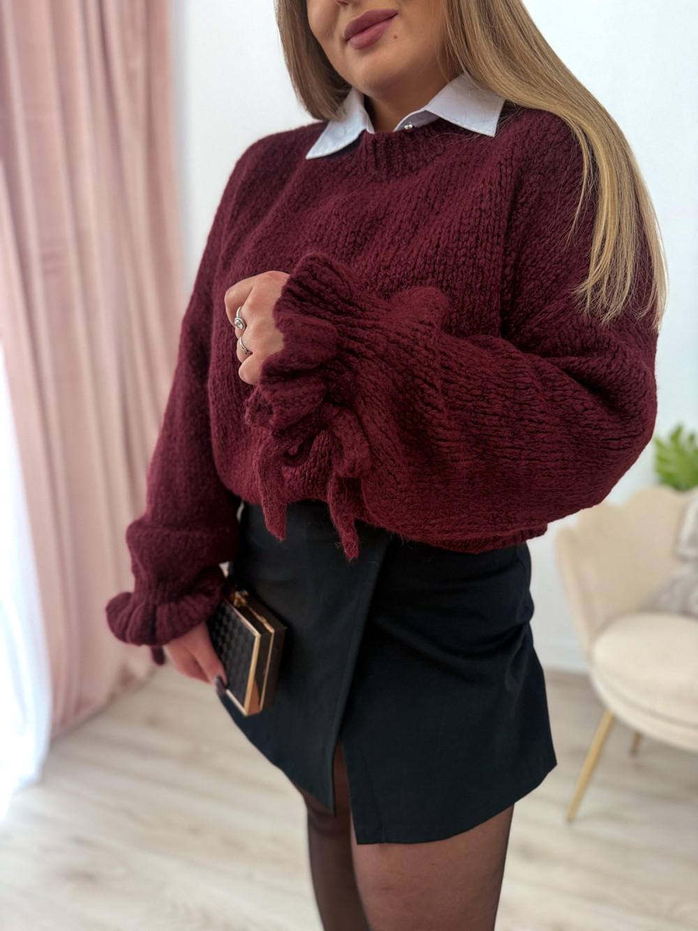 Sweter oversize z wełną i szerokimi rękawami z falbanką Graceful - śliwka