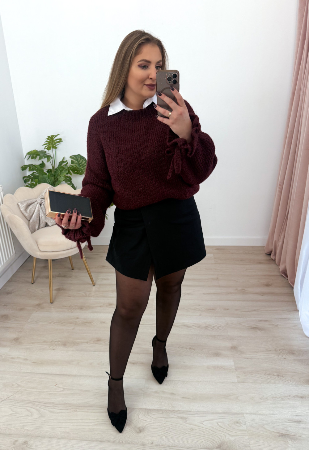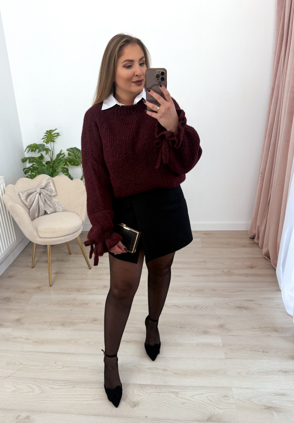 Ten urokliwy sweter z klasycznym, okrągłym dekoltem zachwyca subtelnymi, kobiecymi detalami. Rękawy zostały wykończone delikatną falbanką oraz ozdobnym wiązaniem, które można zawiązać w stylową kokardkę – to akcent dodający lekkości i romantycznego charakteru. Sweter wykonano z miękkiego, przyjemnego w dotyku materiału, dzięki czemu świetnie układa się na sylwetce i zapewnia komfort przez cały dzień. Idealny do eleganckich stylizacji, jak i codziennych zestawów.