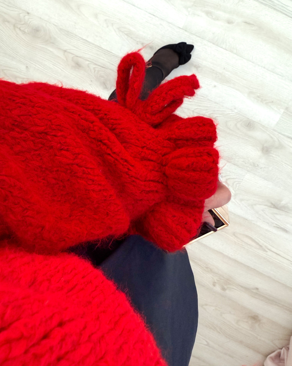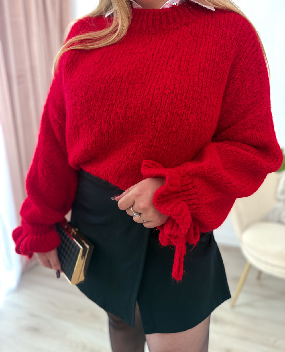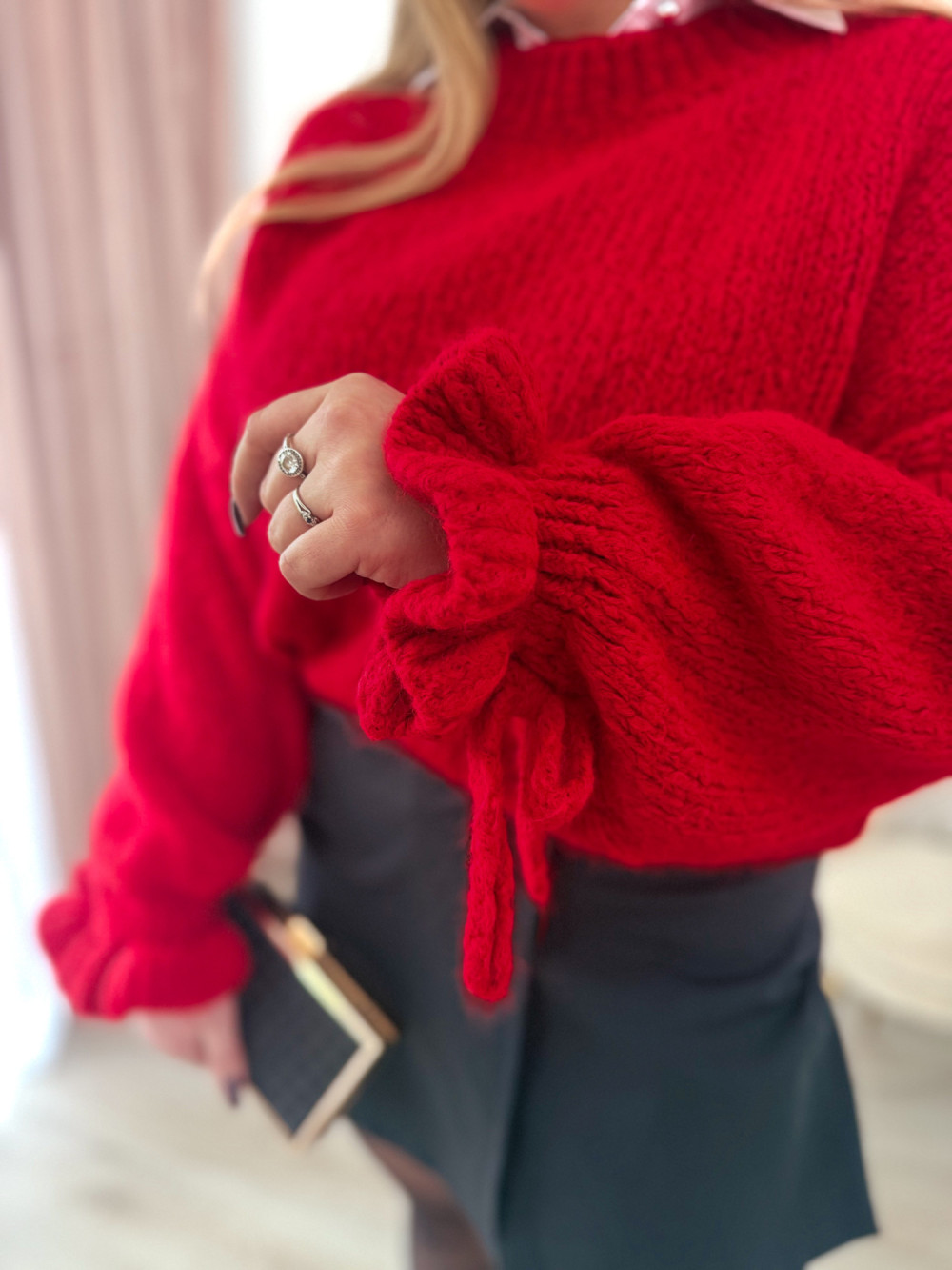 Sweter oversize z wełną i szerokimi rękawami z falbanką Graceful - czerwony