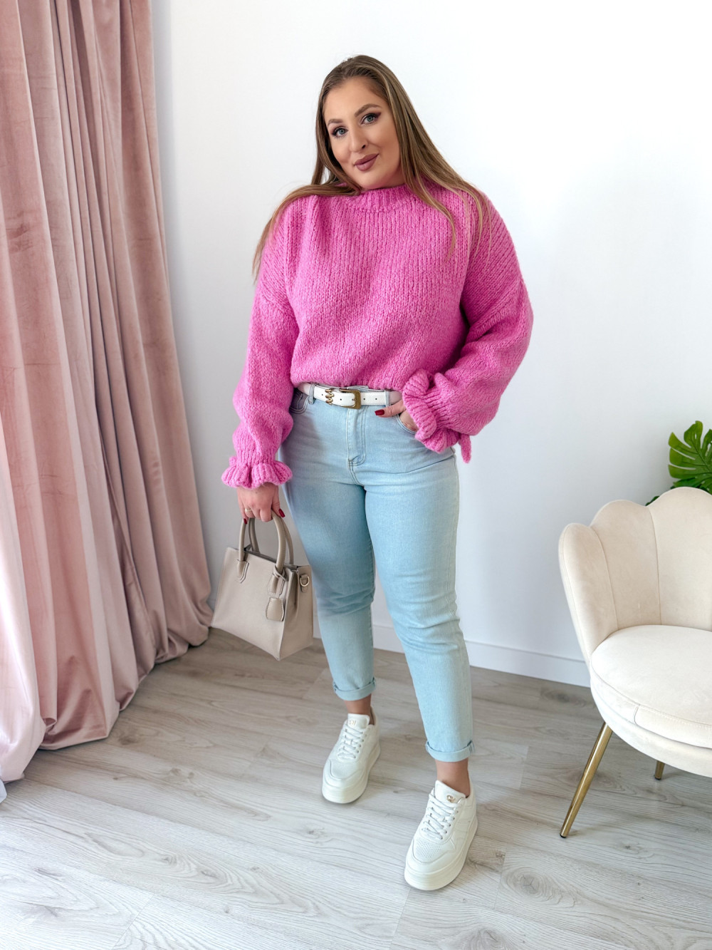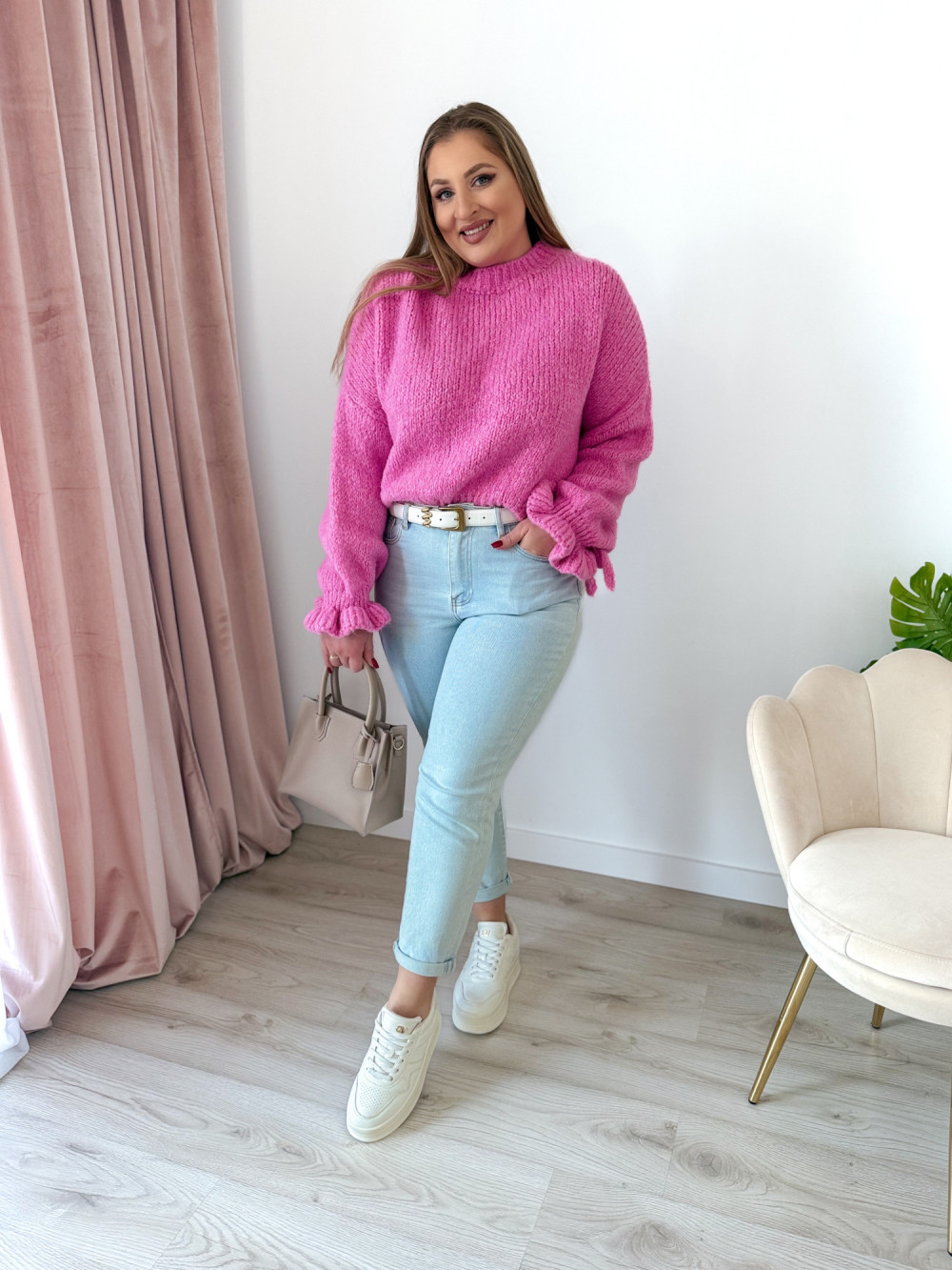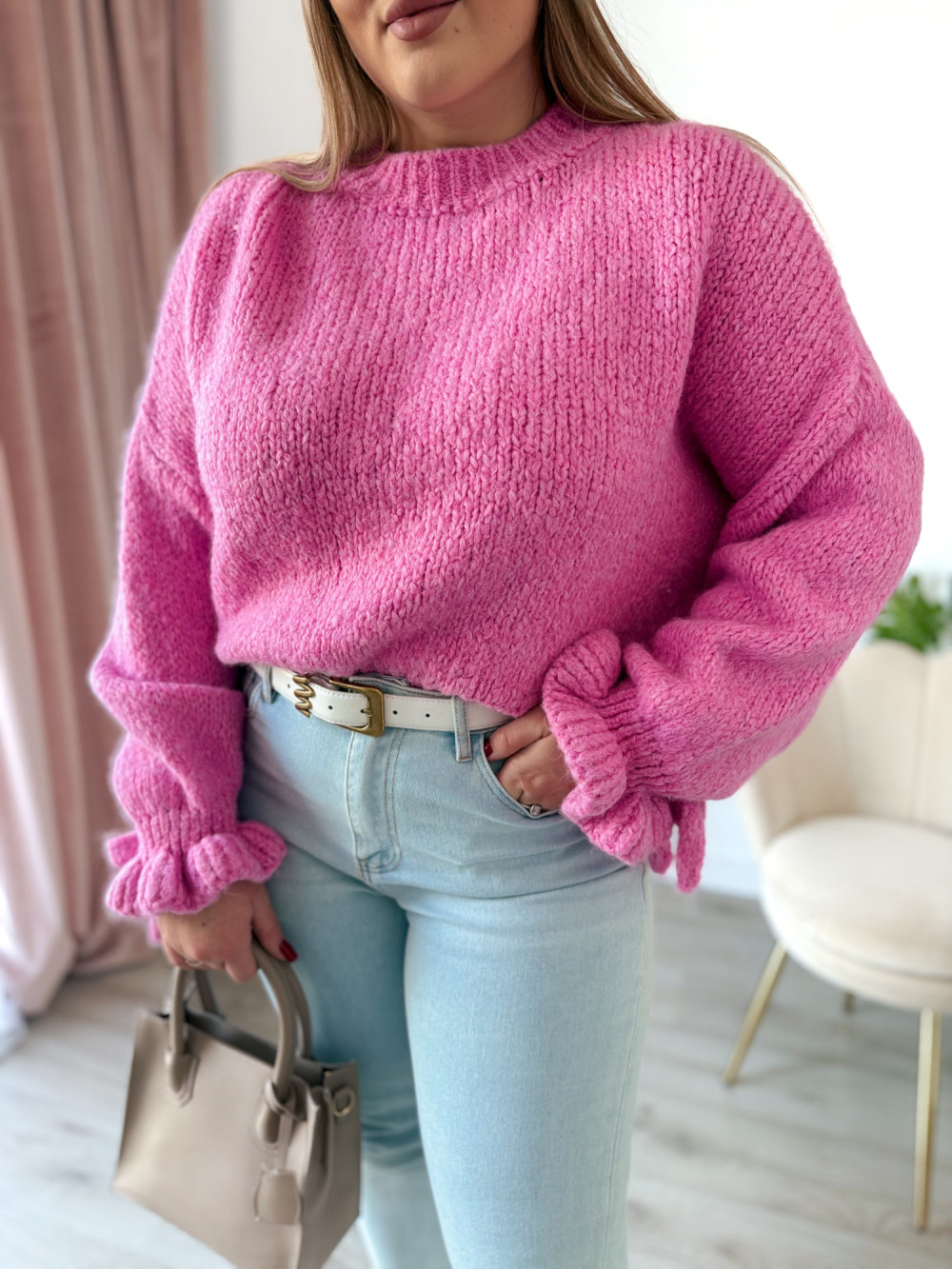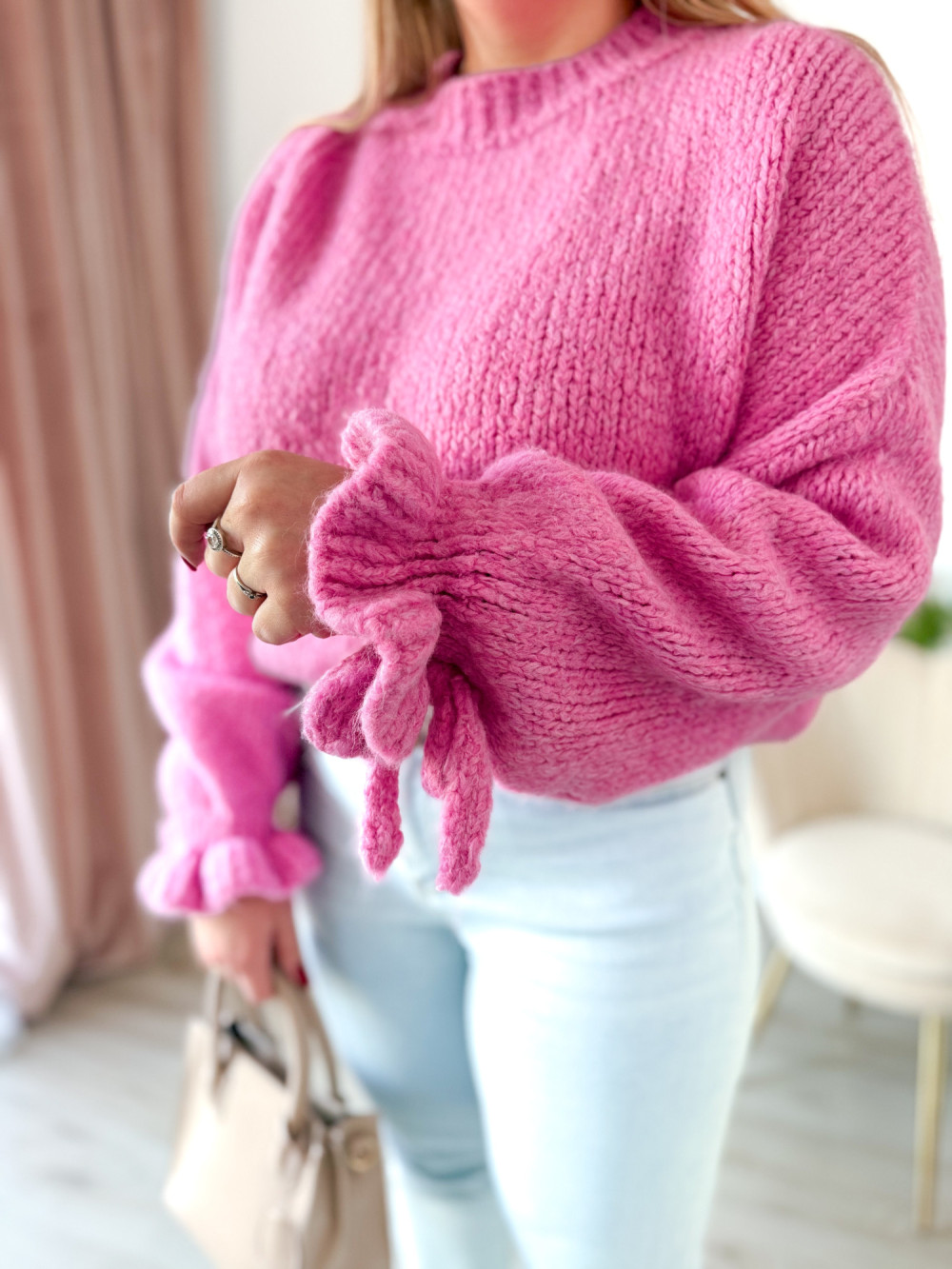 Ten urokliwy sweter z klasycznym, okrągłym dekoltem zachwyca subtelnymi, kobiecymi detalami. Rękawy zostały wykończone delikatną falbanką oraz ozdobnym wiązaniem, które można zawiązać w stylową kokardkę – to akcent dodający lekkości i romantycznego charakteru. Sweter wykonano z miękkiego, przyjemnego w dotyku materiału, dzięki czemu świetnie układa się na sylwetce i zapewnia komfort przez cały dzień. Idealny do eleganckich stylizacji, jak i codziennych zestawów.