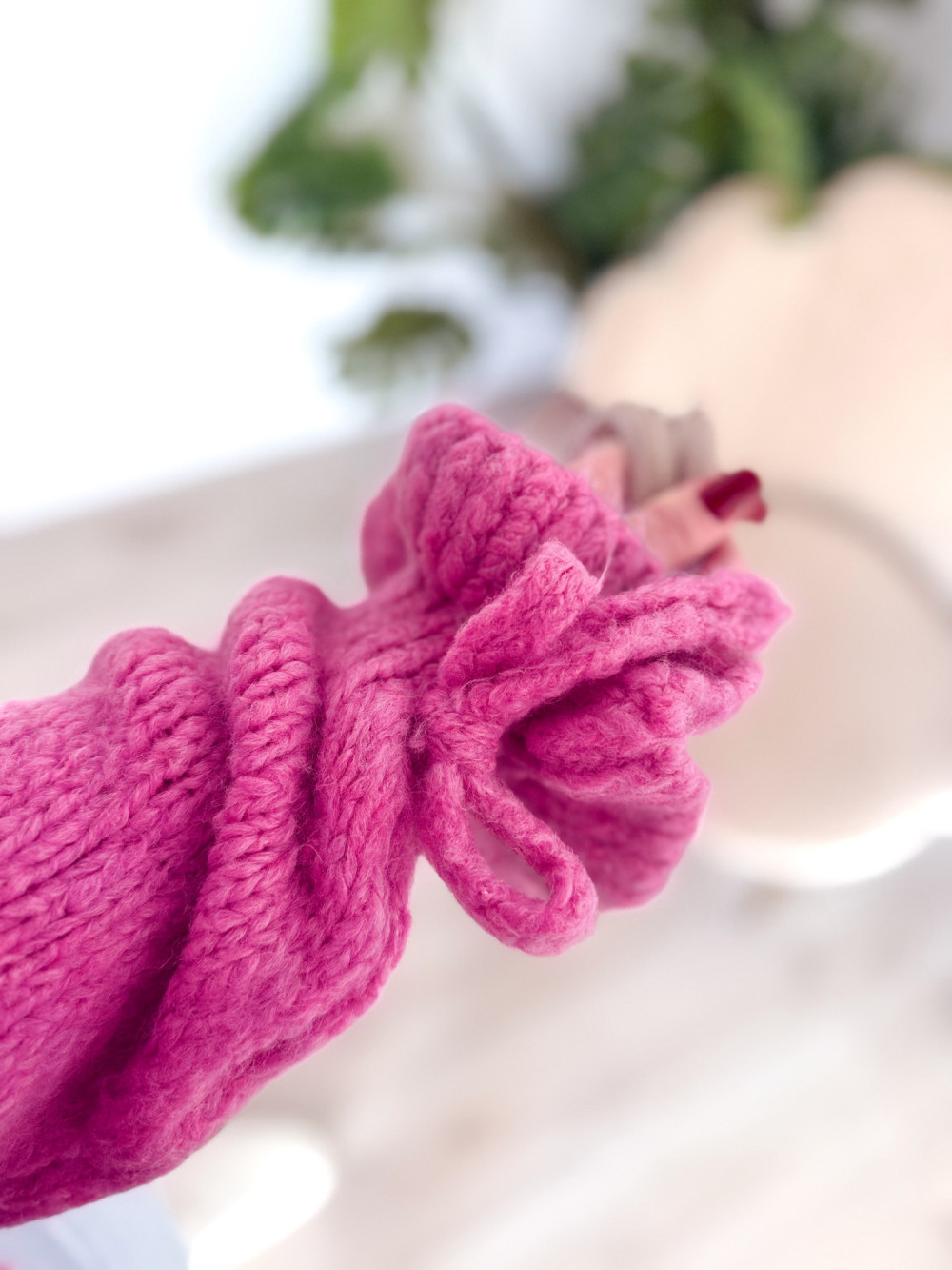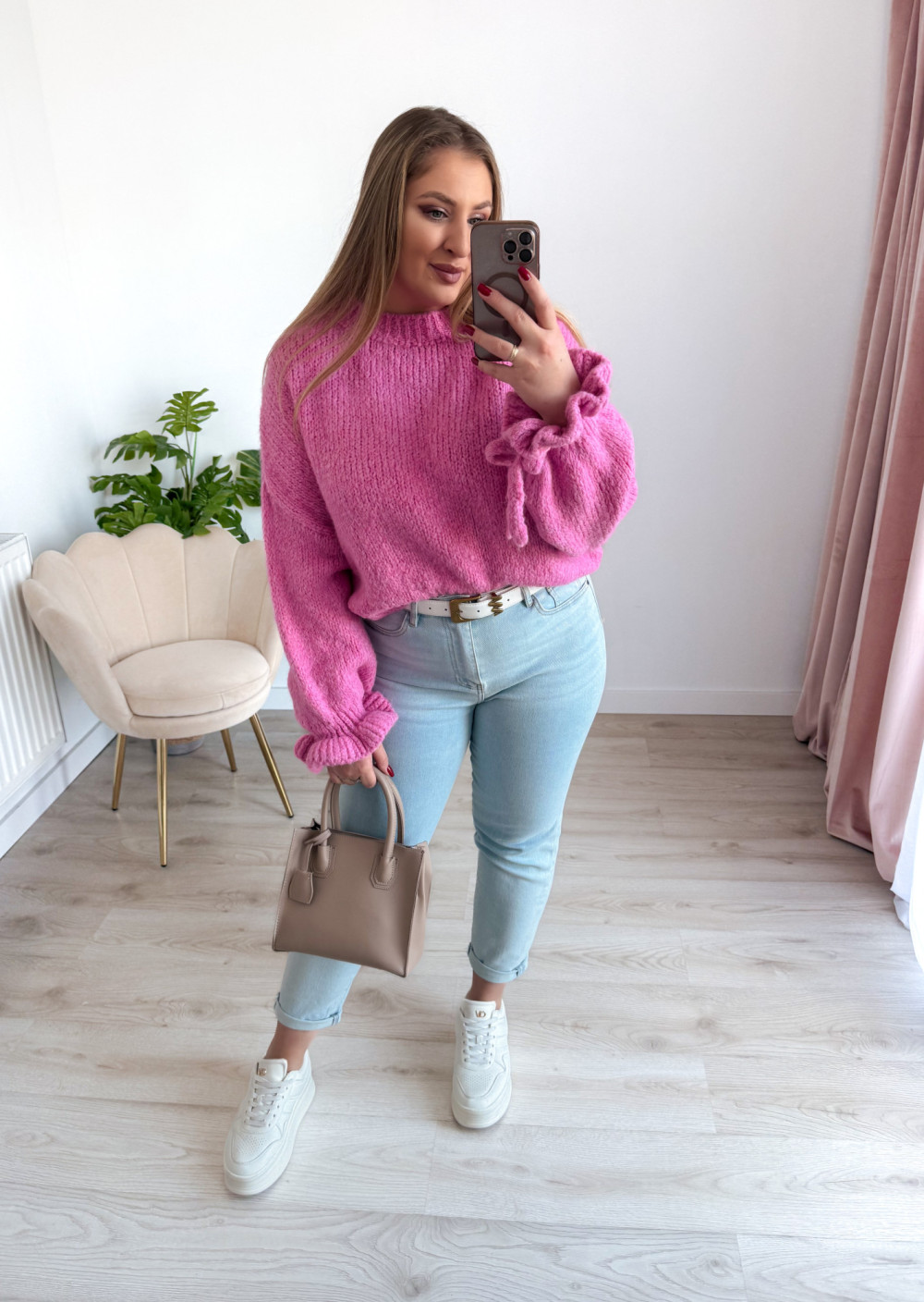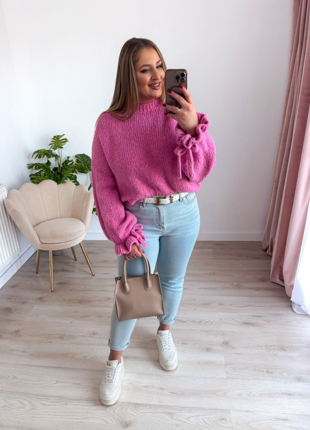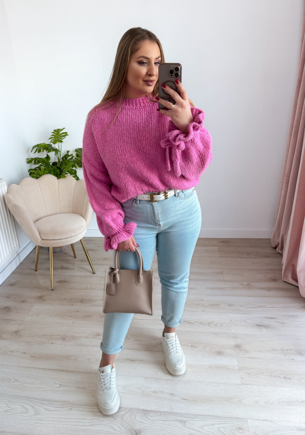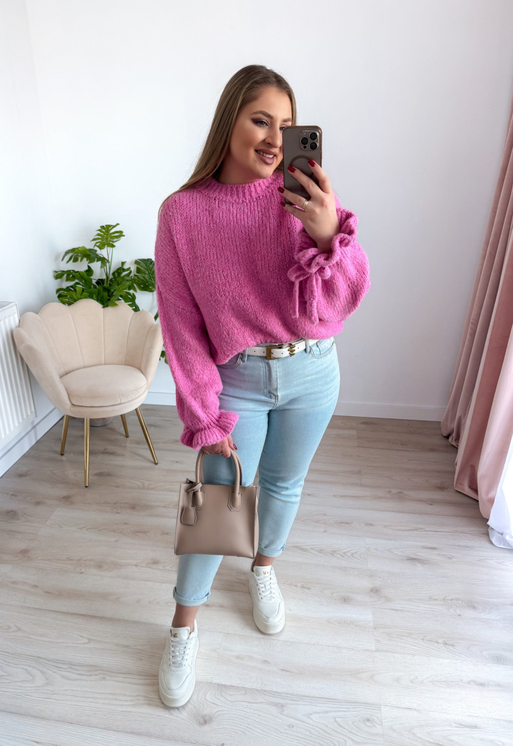 Ten urokliwy sweter z klasycznym, okrągłym dekoltem zachwyca subtelnymi, kobiecymi detalami. Rękawy zostały wykończone delikatną falbanką oraz ozdobnym wiązaniem, które można zawiązać w stylową kokardkę – to akcent dodający lekkości i romantycznego charakteru. Sweter wykonano z miękkiego, przyjemnego w dotyku materiału, dzięki czemu świetnie układa się na sylwetce i zapewnia komfort przez cały dzień. Idealny do eleganckich stylizacji, jak i codziennych zestawów.