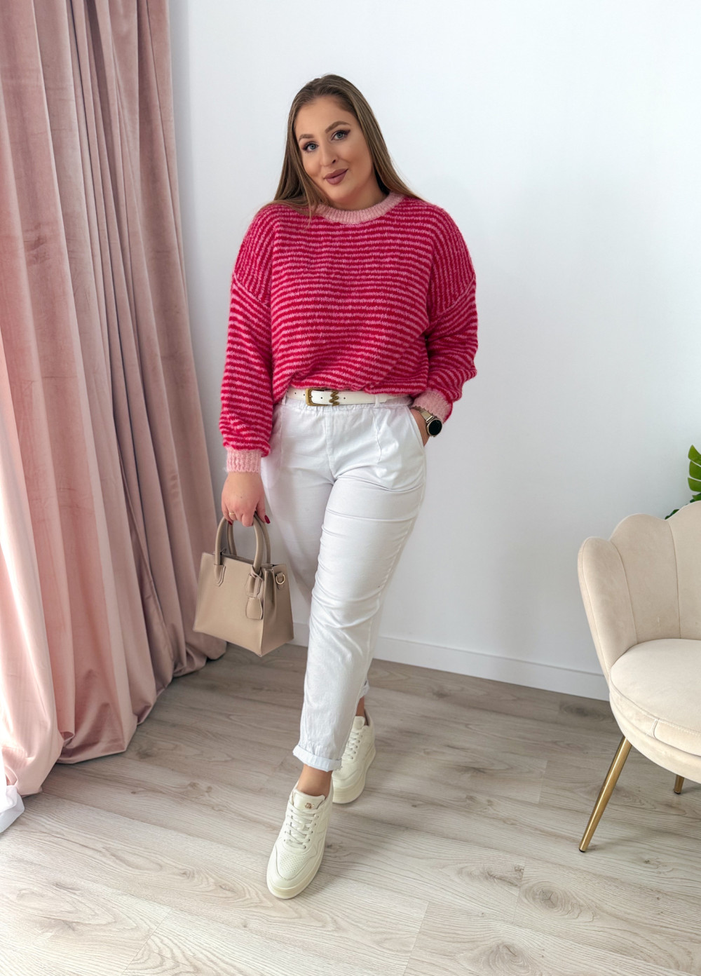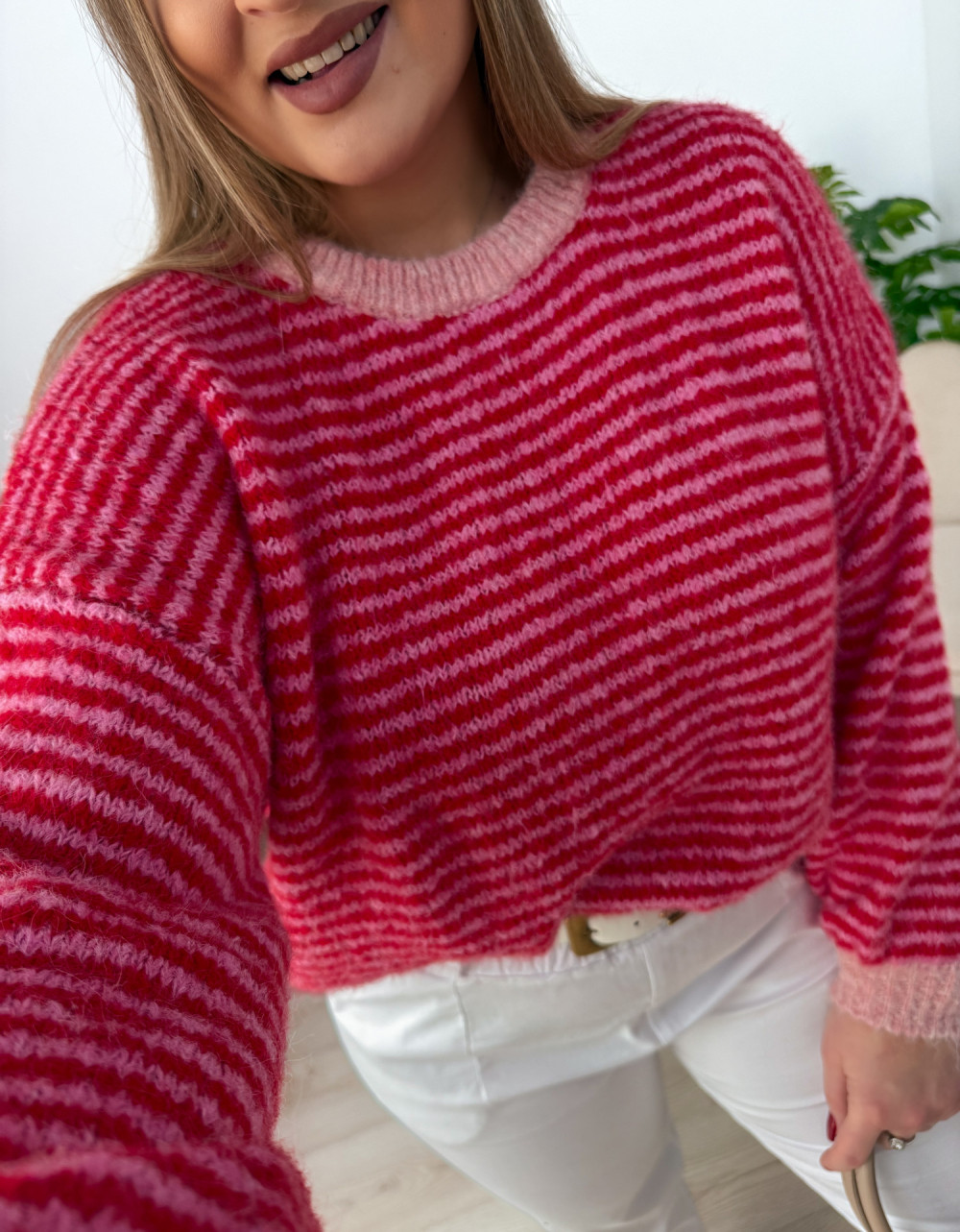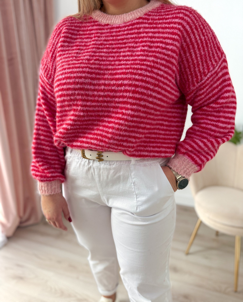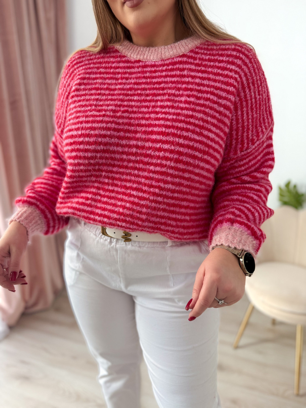 Klasyczny sweterek z okrągłym dekoltem i długim rękawem to ponadczasowy element garderoby, który sprawdzi się w każdej stylizacji. Wzór w paski nadaje mu modnego, a jednocześnie uniwersalnego charakteru. Sweterek doskonale pasuje zarówno do codziennych, jak i bardziej casualowych zestawów. Miękki, przyjemny w dotyku materiał zapewnia komfort noszenia przez cały dzień.