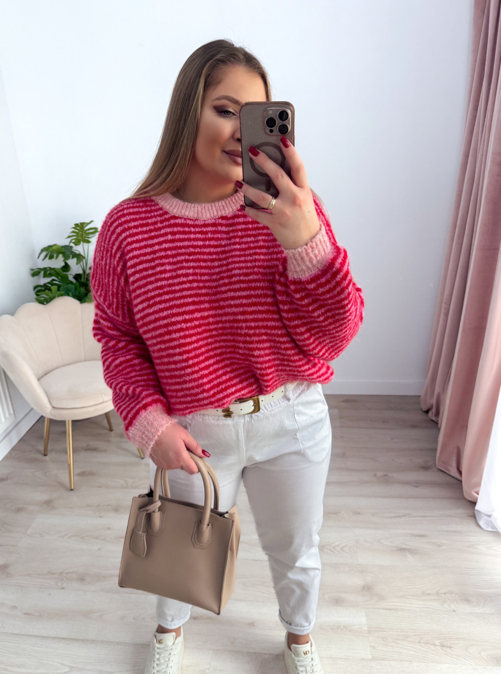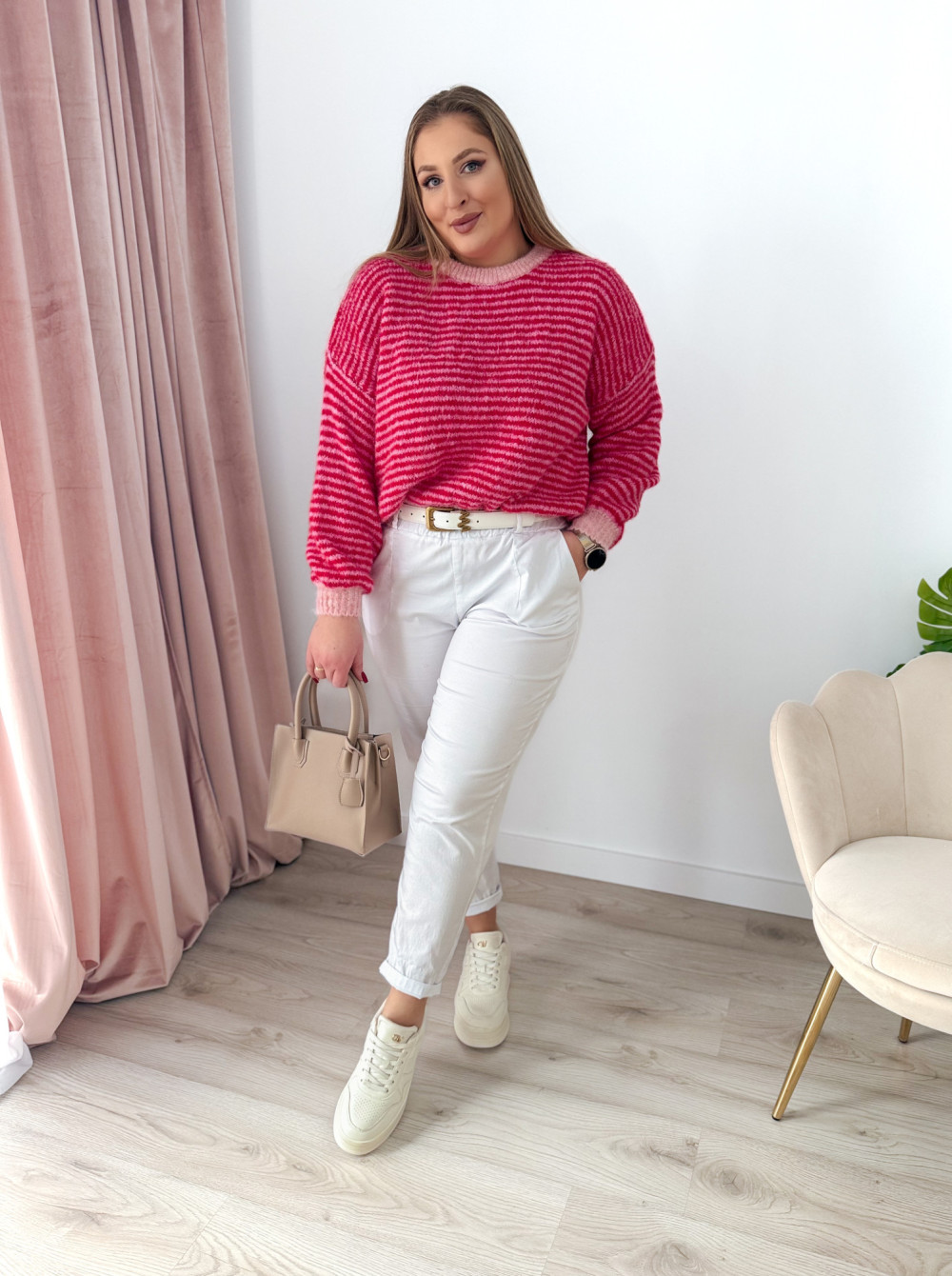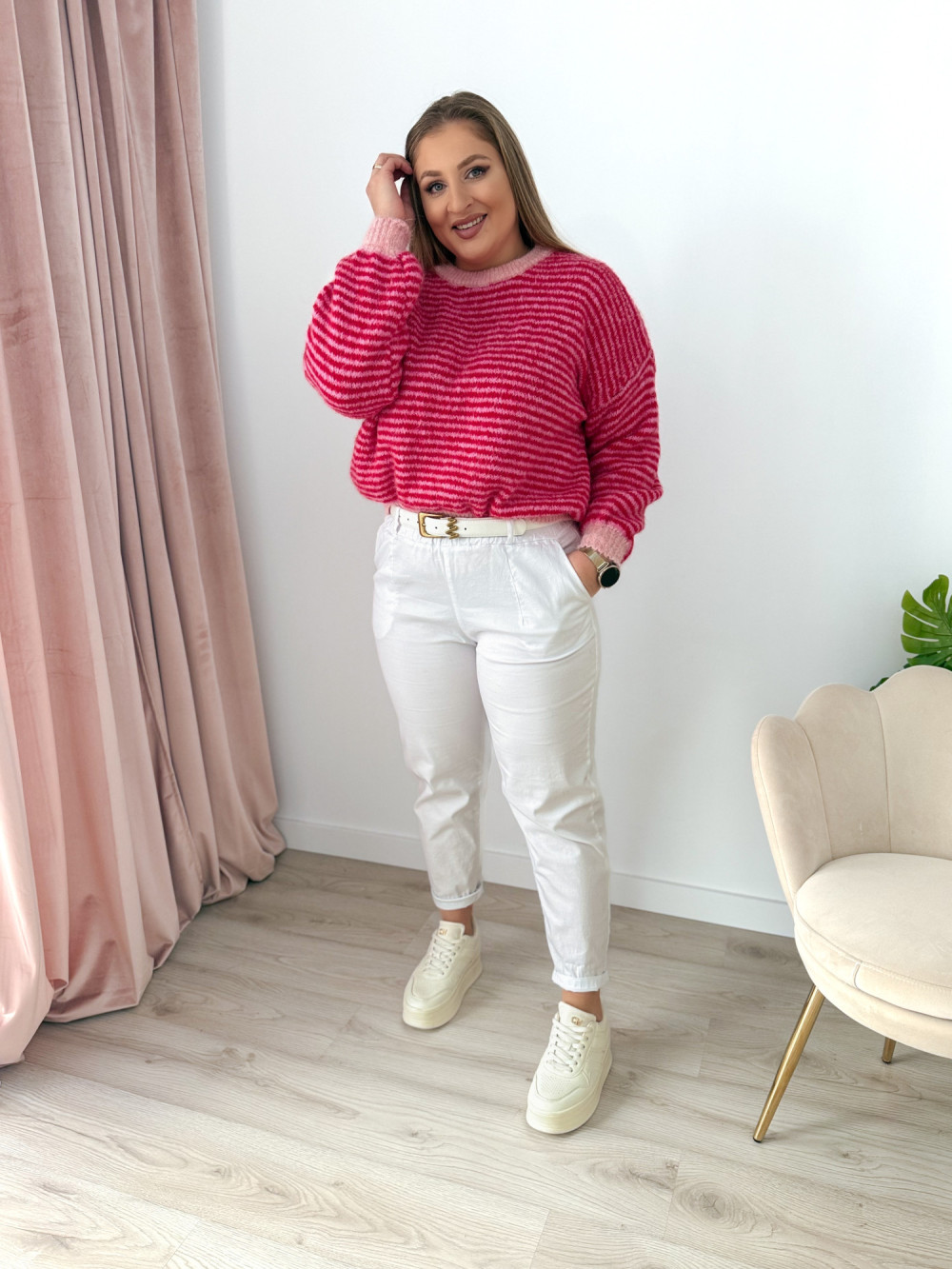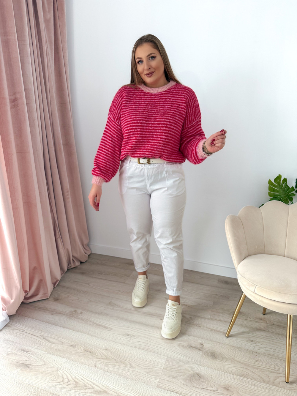 Klasyczny sweterek z okrągłym dekoltem i długim rękawem to ponadczasowy element garderoby, który sprawdzi się w każdej stylizacji. Wzór w paski nadaje mu modnego, a jednocześnie uniwersalnego charakteru. Sweterek doskonale pasuje zarówno do codziennych, jak i bardziej casualowych zestawów. Miękki, przyjemny w dotyku materiał zapewnia komfort noszenia przez cały dzień.