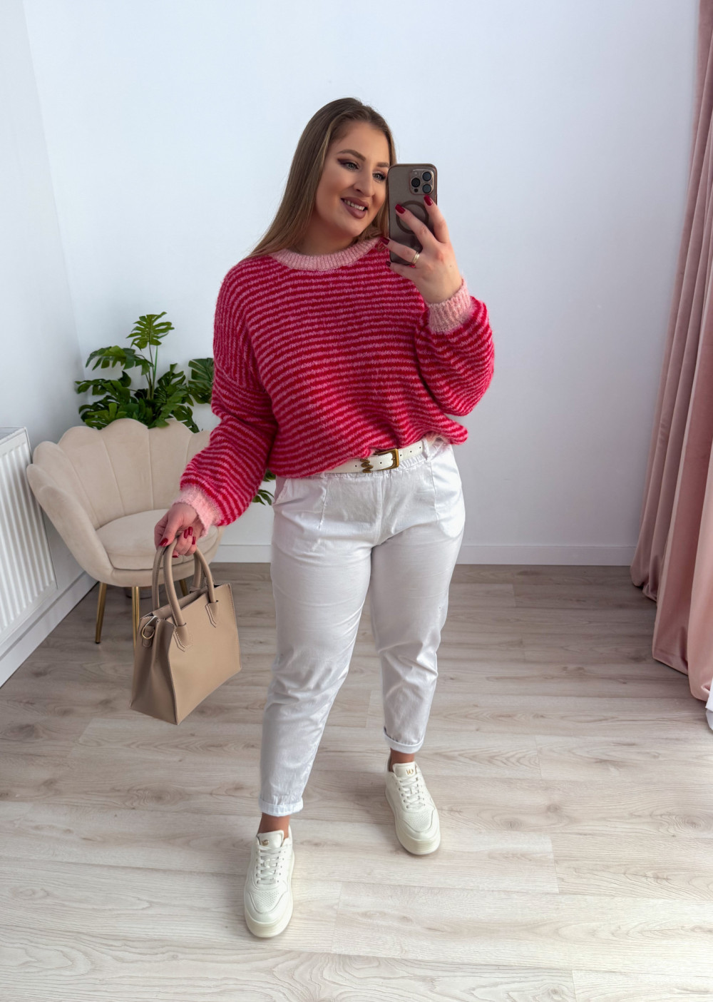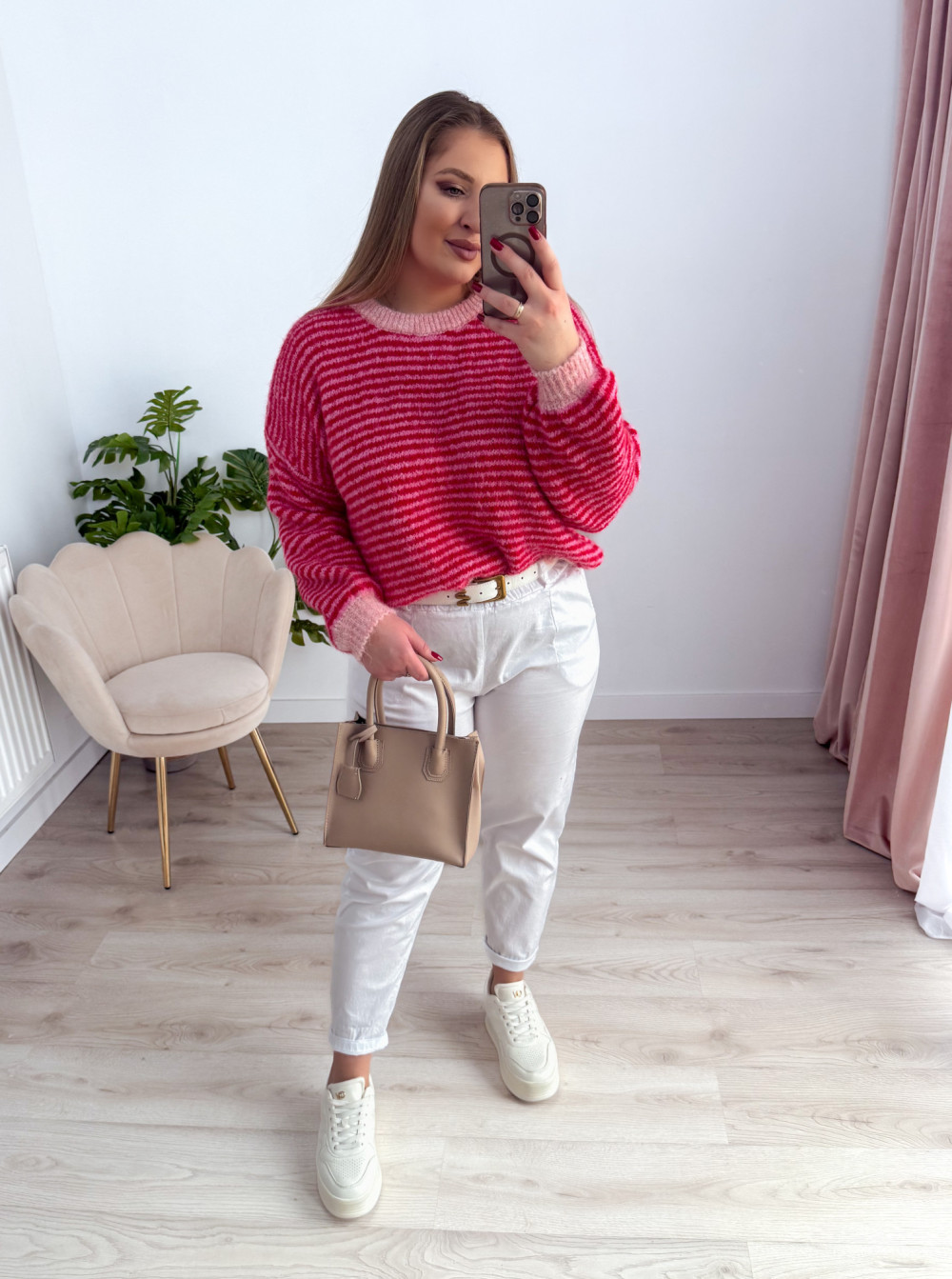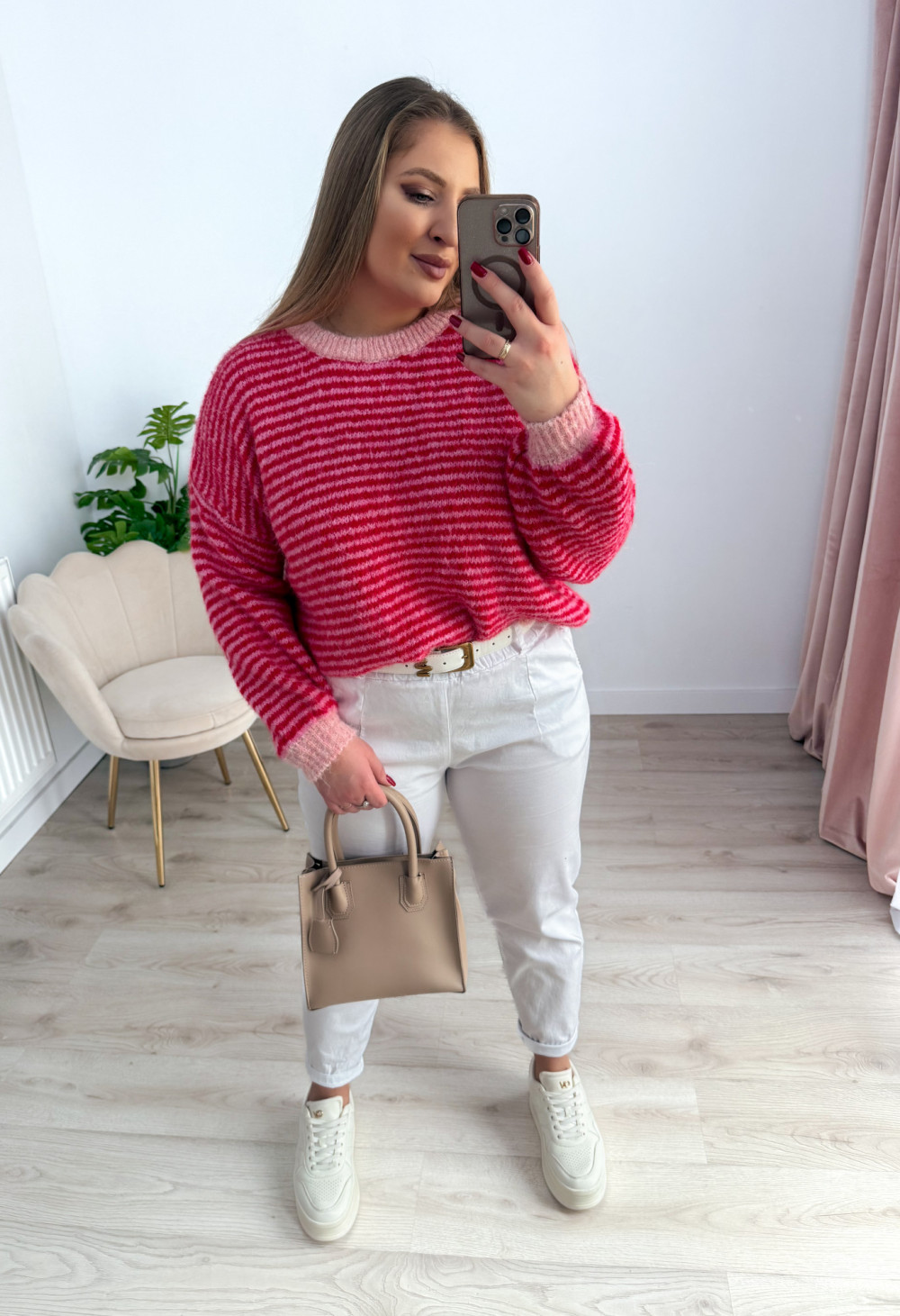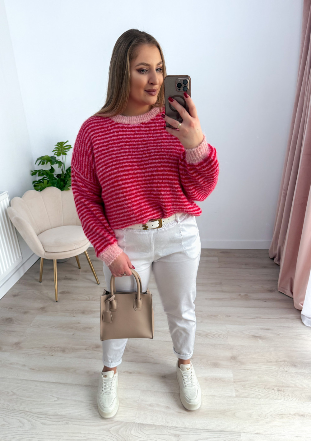 Klasyczny sweterek z okrągłym dekoltem i długim rękawem to ponadczasowy element garderoby, który sprawdzi się w każdej stylizacji. Wzór w paski nadaje mu modnego, a jednocześnie uniwersalnego charakteru. Sweterek doskonale pasuje zarówno do codziennych, jak i bardziej casualowych zestawów. Miękki, przyjemny w dotyku materiał zapewnia komfort noszenia przez cały dzień.