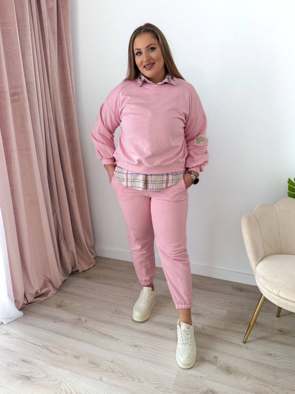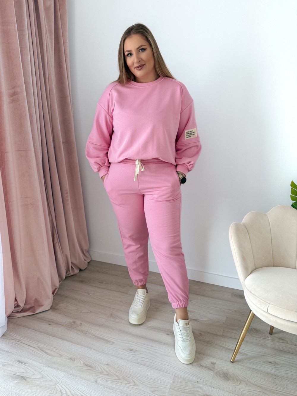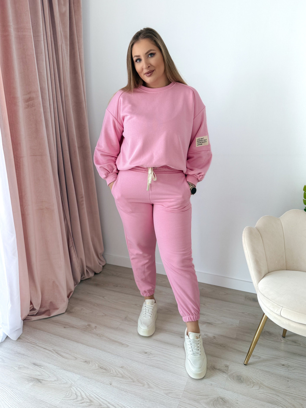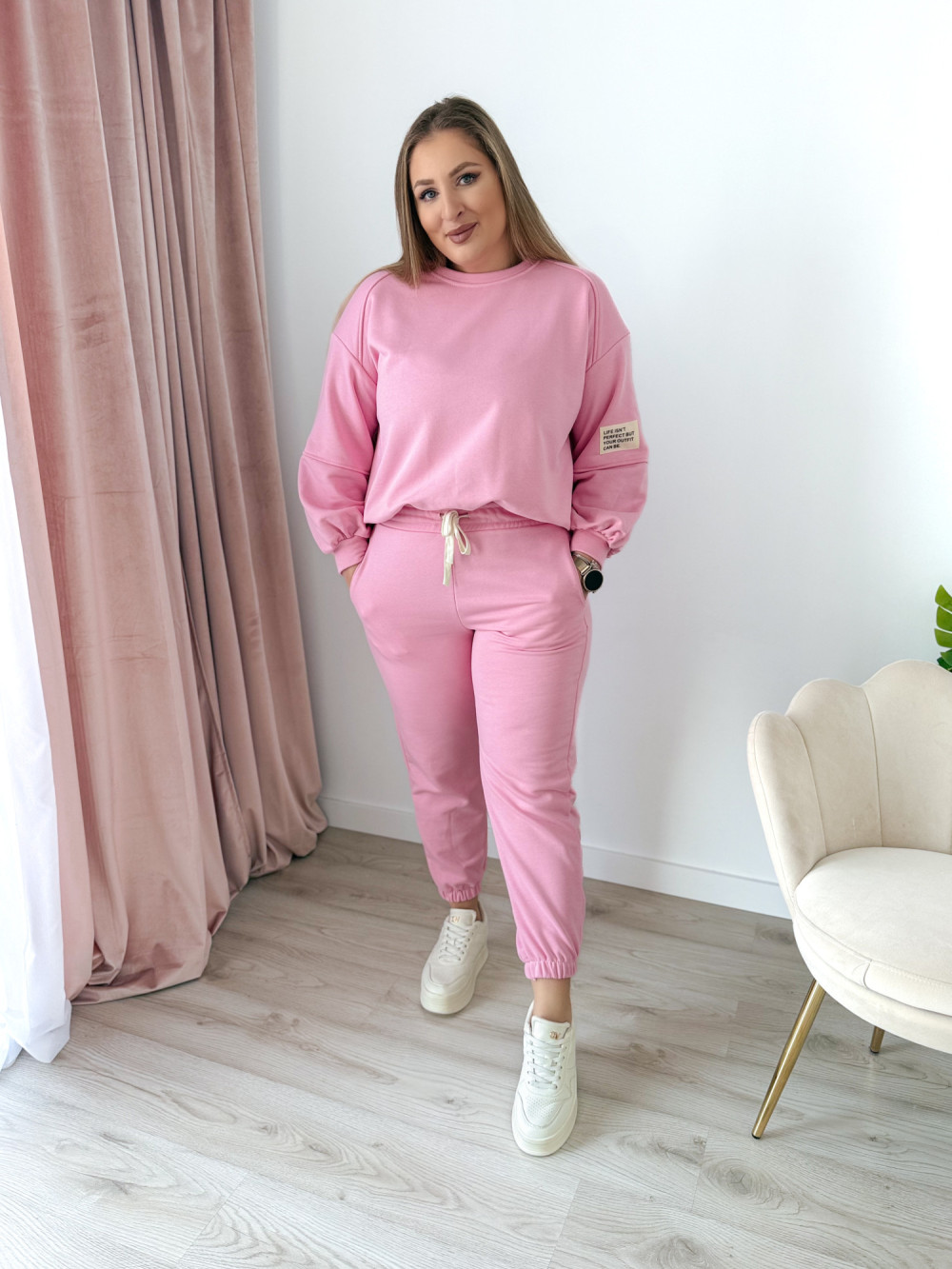 Komfortowy komplet dresowy to idealne połączenie wygody i modnego stylu. Bluza z długim rękawem oraz okrągłym dekoltem wyróżnia się asymetrycznym krojem – przód jest delikatnie krótszy, a tył dłuższy, co nadaje całości nowoczesnego charakteru i świetnie układa się na sylwetce. Spodnie wyposażone w elastyczną gumkę w pasie oraz gumki na nogawkach zapewniają doskonałe dopasowanie i swobodę ruchów. Praktyczne kieszenie po bokach podnoszą funkcjonalność kompletu. Idealny wybór na co dzień, do domu oraz na casualowe wyjścia.