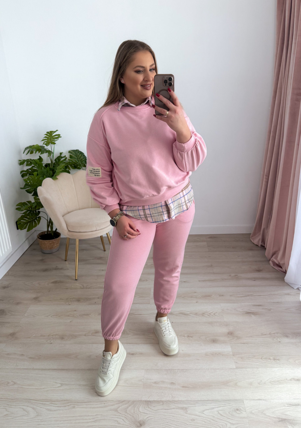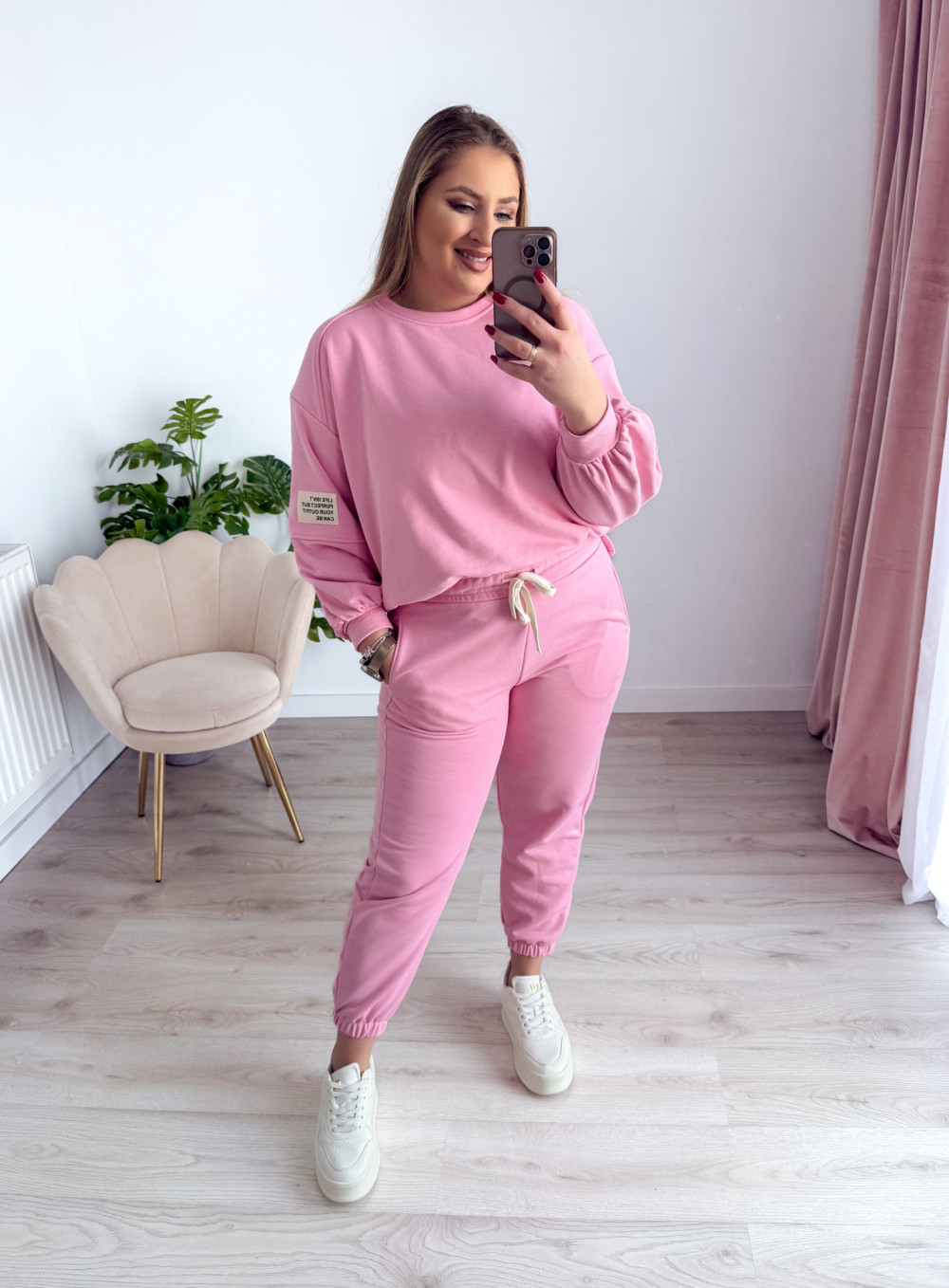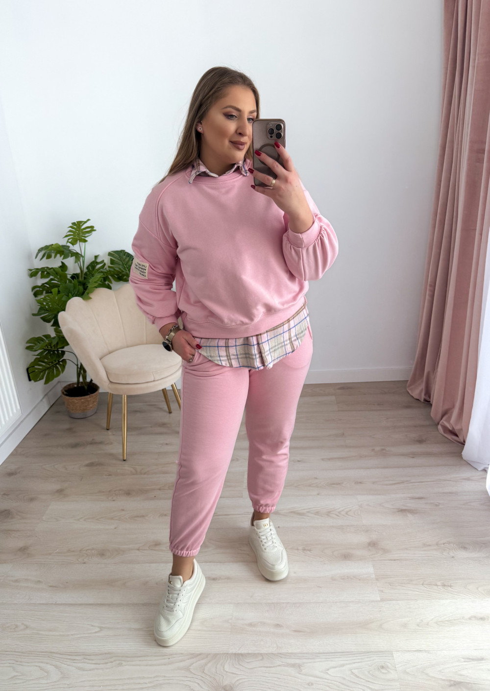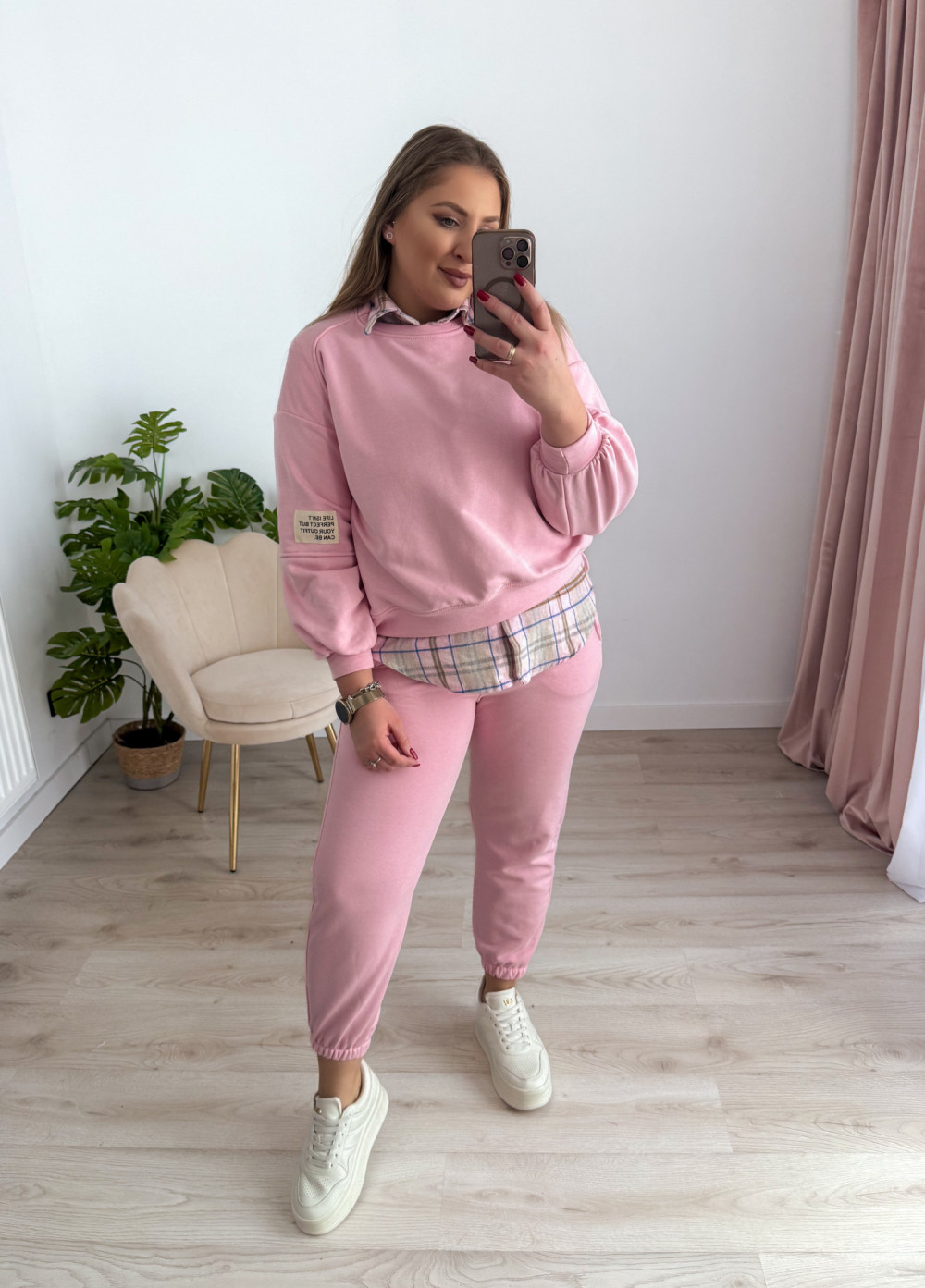Komfortowy komplet dresowy to idealne połączenie wygody i modnego stylu. Bluza z długim rękawem oraz okrągłym dekoltem wyróżnia się asymetrycznym krojem – przód jest delikatnie krótszy, a tył dłuższy, co nadaje całości nowoczesnego charakteru i świetnie układa się na sylwetce. Spodnie wyposażone w elastyczną gumkę w pasie oraz gumki na nogawkach zapewniają doskonałe dopasowanie i swobodę ruchów. Praktyczne kieszenie po bokach podnoszą funkcjonalność kompletu. Idealny wybór na co dzień, do domu oraz na casualowe wyjścia.