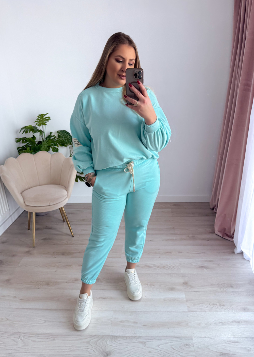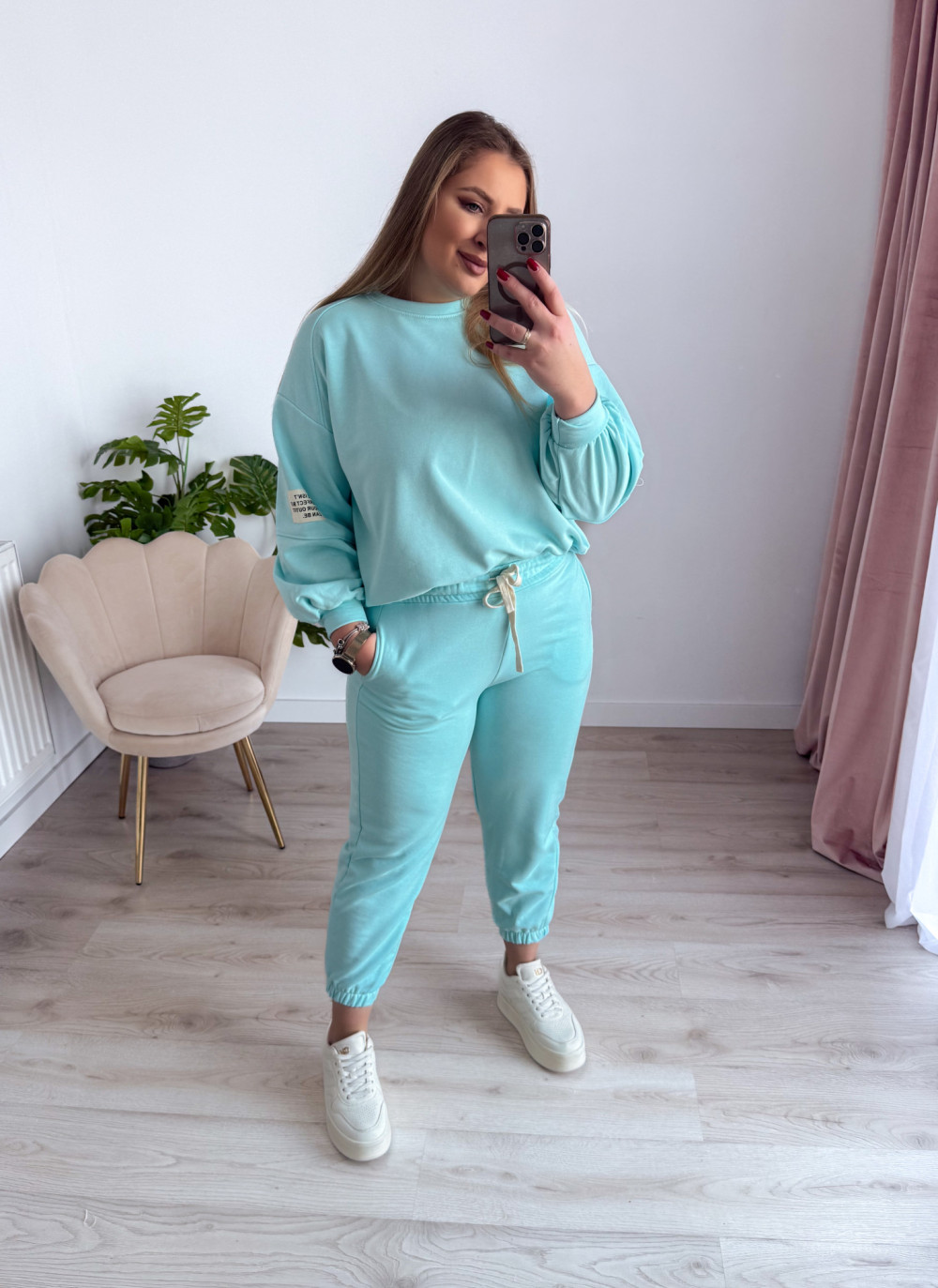 Komfortowy komplet dresowy to idealne połączenie wygody i modnego stylu. Bluza z długim rękawem oraz okrągłym dekoltem wyróżnia się asymetrycznym krojem – przód jest delikatnie krótszy, a tył dłuższy, co nadaje całości nowoczesnego charakteru i świetnie układa się na sylwetce. Spodnie wyposażone w elastyczną gumkę w pasie oraz gumki na nogawkach zapewniają doskonałe dopasowanie i swobodę ruchów. Praktyczne kieszenie po bokach podnoszą funkcjonalność kompletu. Idealny wybór na co dzień, do domu oraz na casualowe wyjścia.