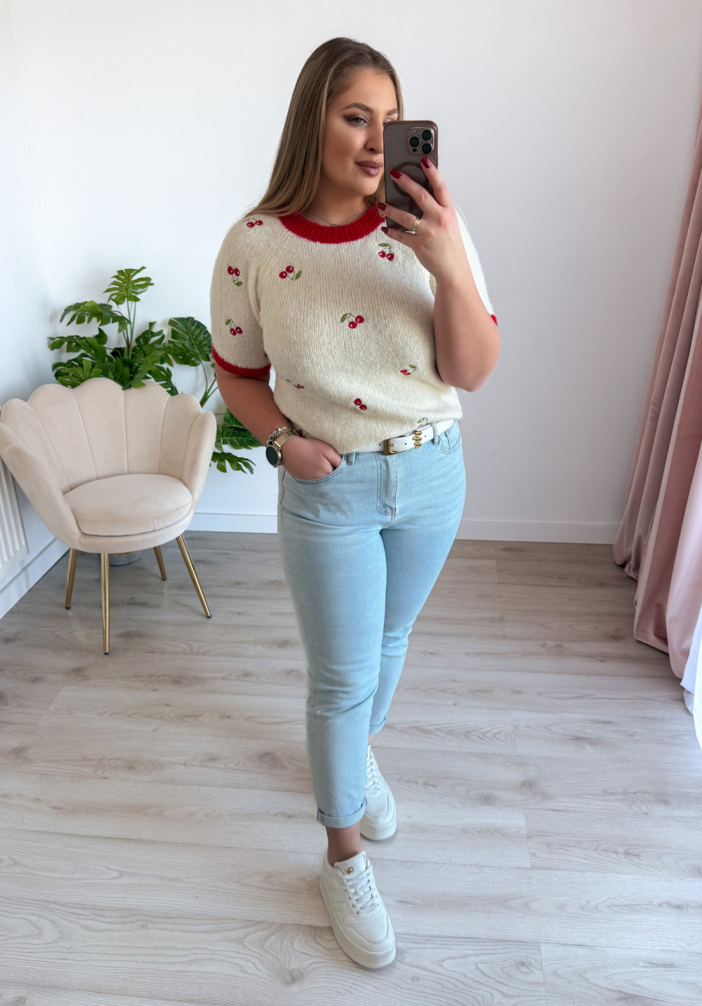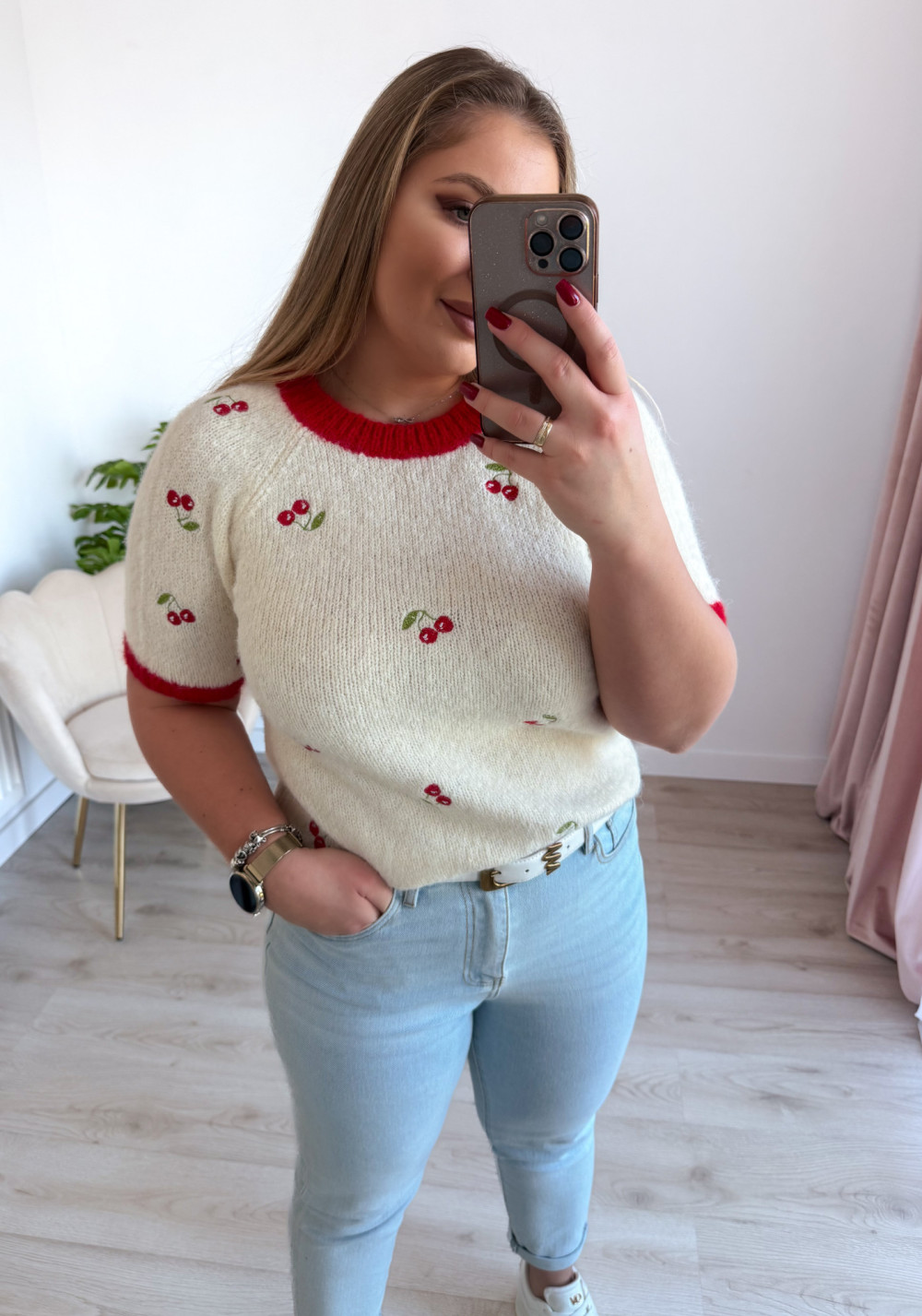 Lekki sweterek z krótkim rękawem to idealna propozycja na cieplejsze dni. Uroczy wzór w owoce nadaje mu świeżego, radosnego charakteru i przyciąga wzrok. Okrągły dekolt podkreśla klasyczny fason, zapewniając wygodę noszenia. Sweterek doskonale sprawdzi się w codziennych stylizacjach, świetnie komponując się zarówno z jeansami, jak i spódnicami czy szortami.