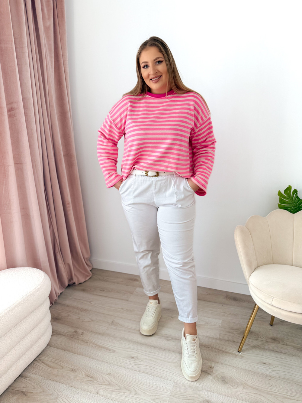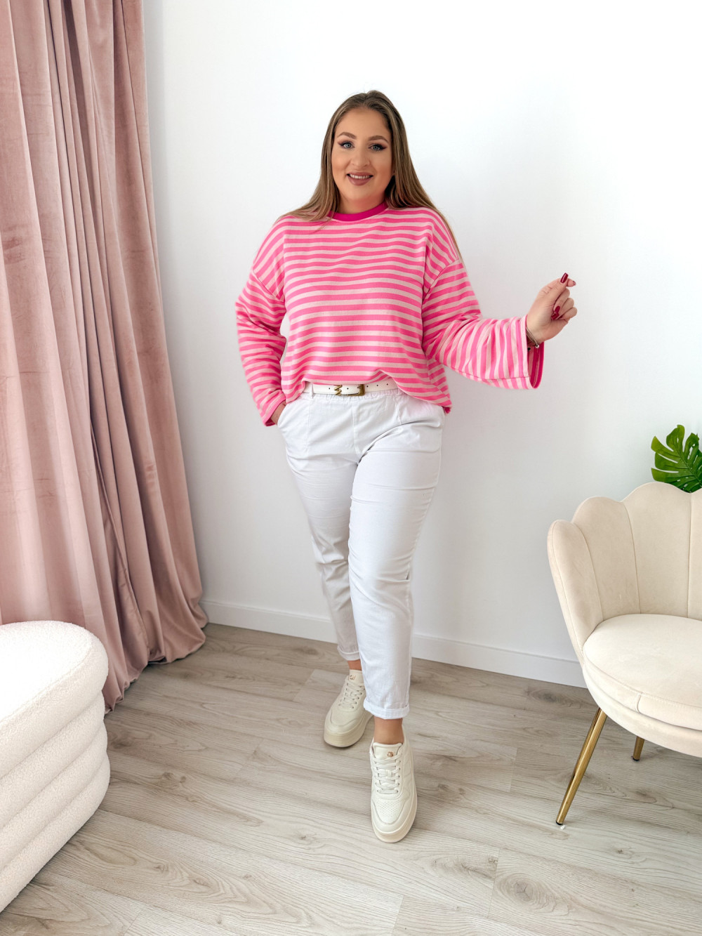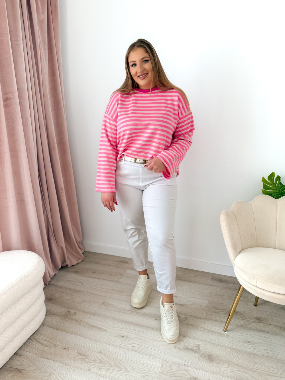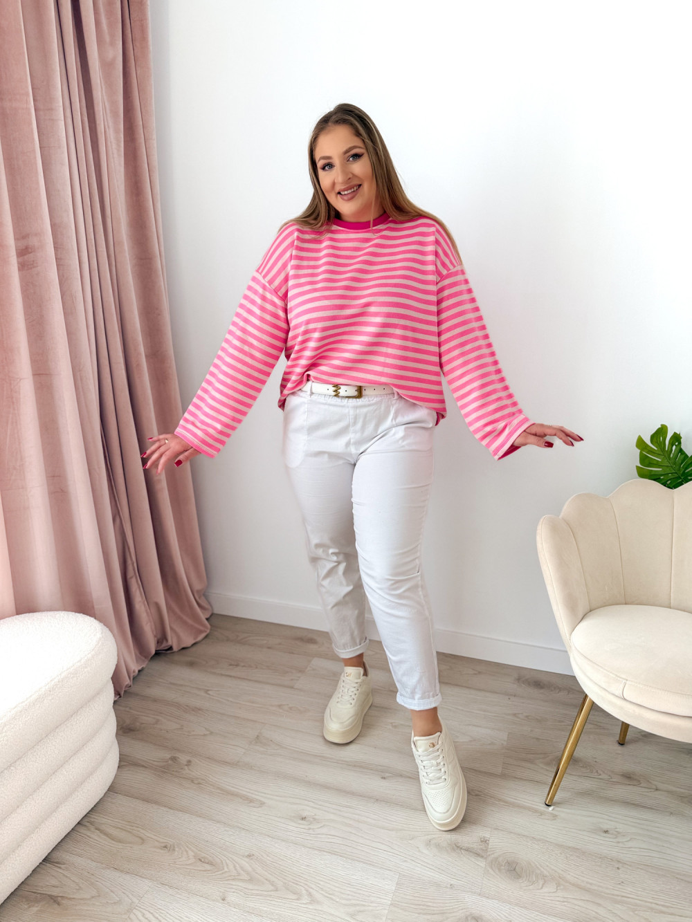 Bluza o fasonie oversize z okrągłym dekoltem to idealne połączenie wygody i modnego, swobodnego stylu. Klasyczny wzór w paski nadaje jej ponadczasowego charakteru, a długi rękaw zapewnia komfort noszenia w chłodniejsze dni. Luźny krój świetnie układa się na sylwetce i gwarantuje pełną swobodę ruchów. Bluza doskonale sprawdzi się w codziennych stylizacjach – zarówno do jeansów, jak i legginsów czy spodni dresowych.