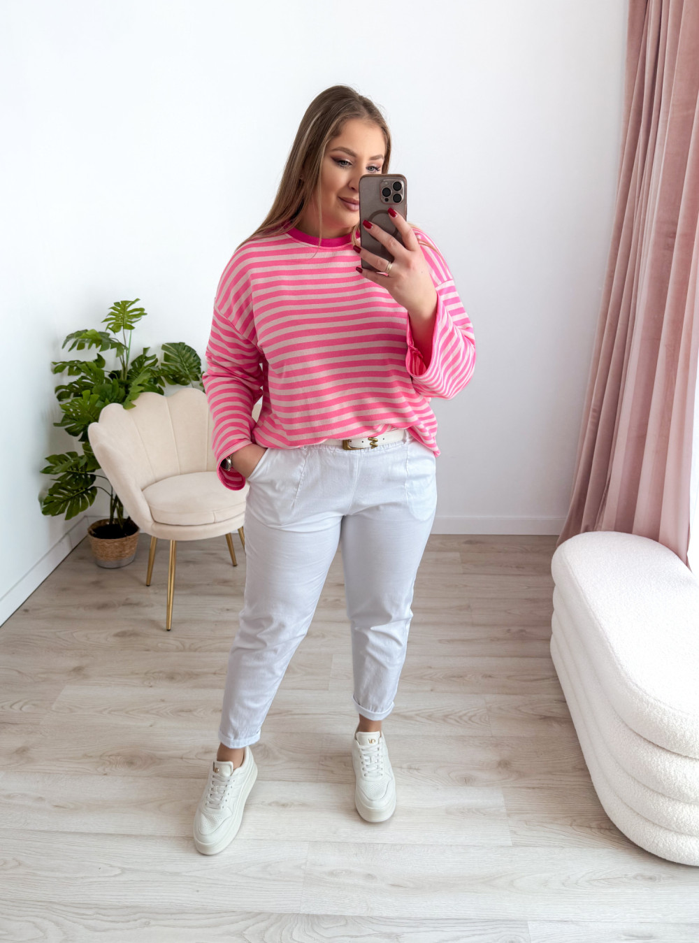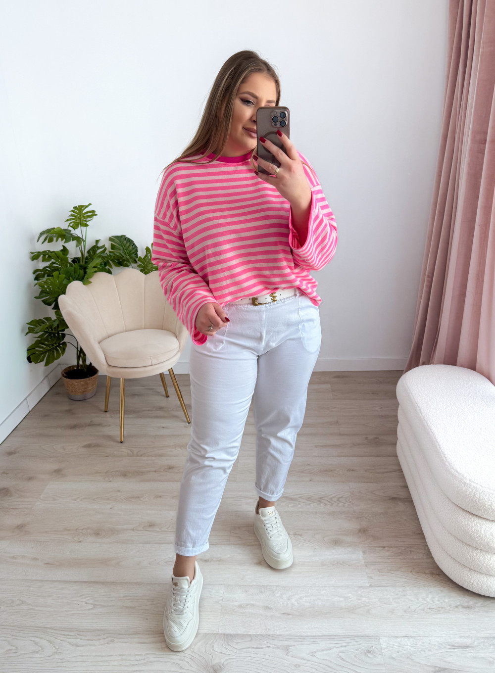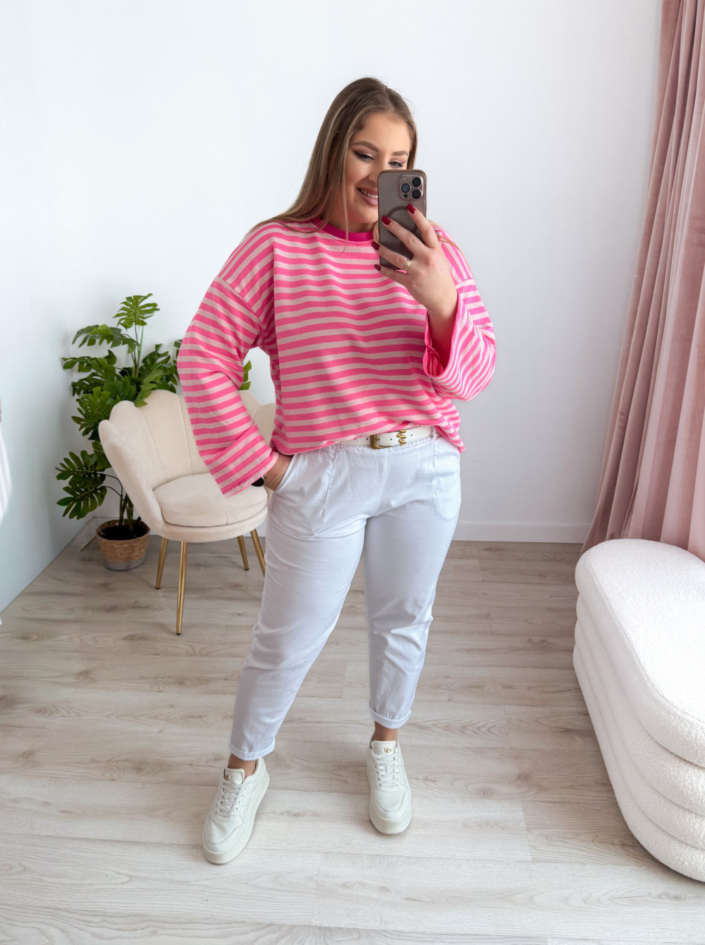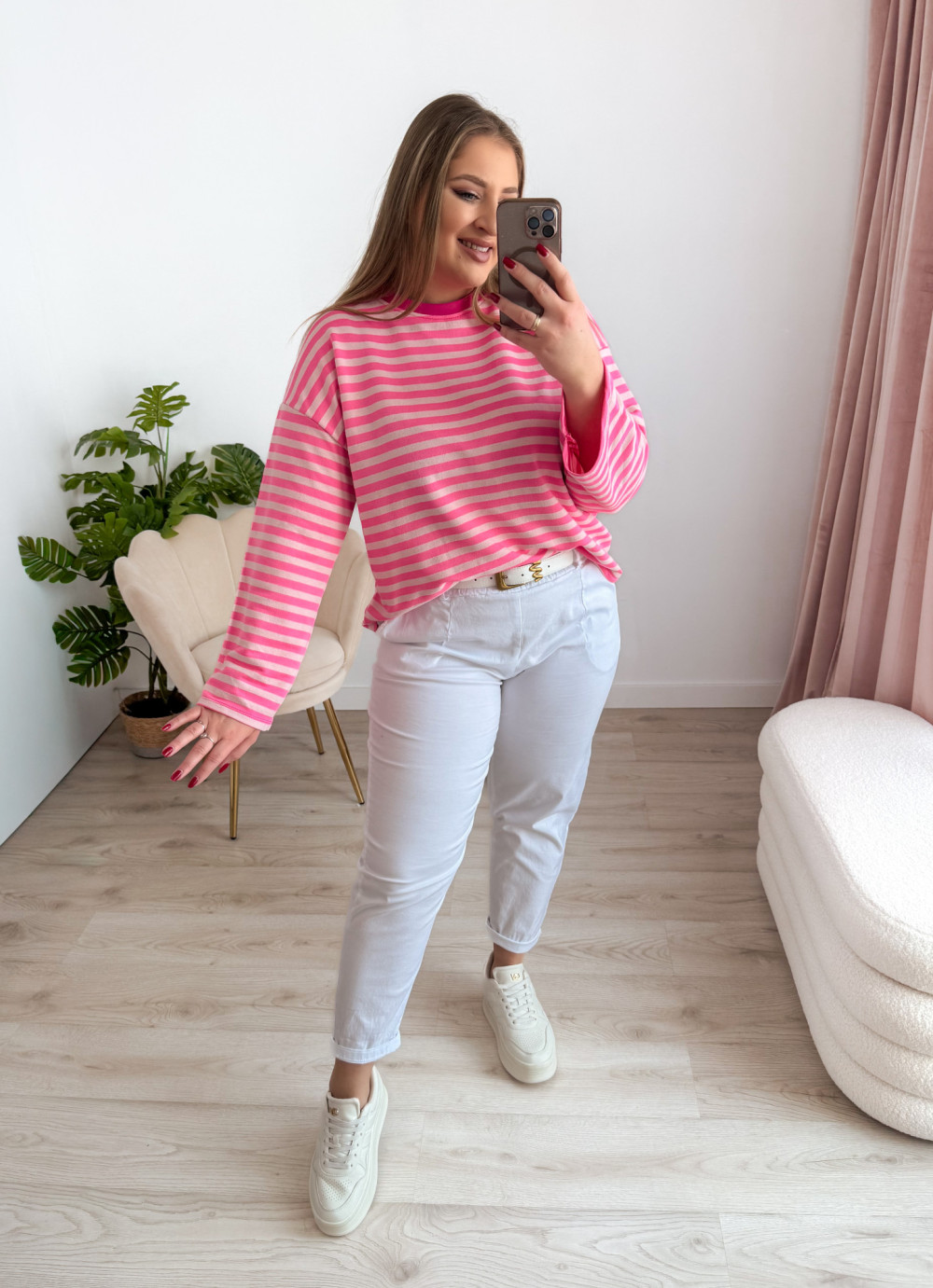 Bluza o fasonie oversize z okrągłym dekoltem to idealne połączenie wygody i modnego, swobodnego stylu. Klasyczny wzór w paski nadaje jej ponadczasowego charakteru, a długi rękaw zapewnia komfort noszenia w chłodniejsze dni. Luźny krój świetnie układa się na sylwetce i gwarantuje pełną swobodę ruchów. Bluza doskonale sprawdzi się w codziennych stylizacjach – zarówno do jeansów, jak i legginsów czy spodni dresowych.