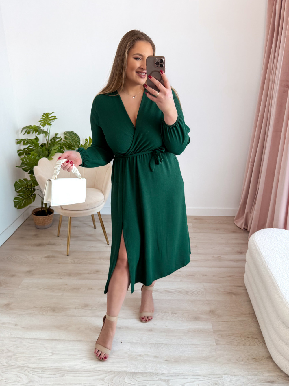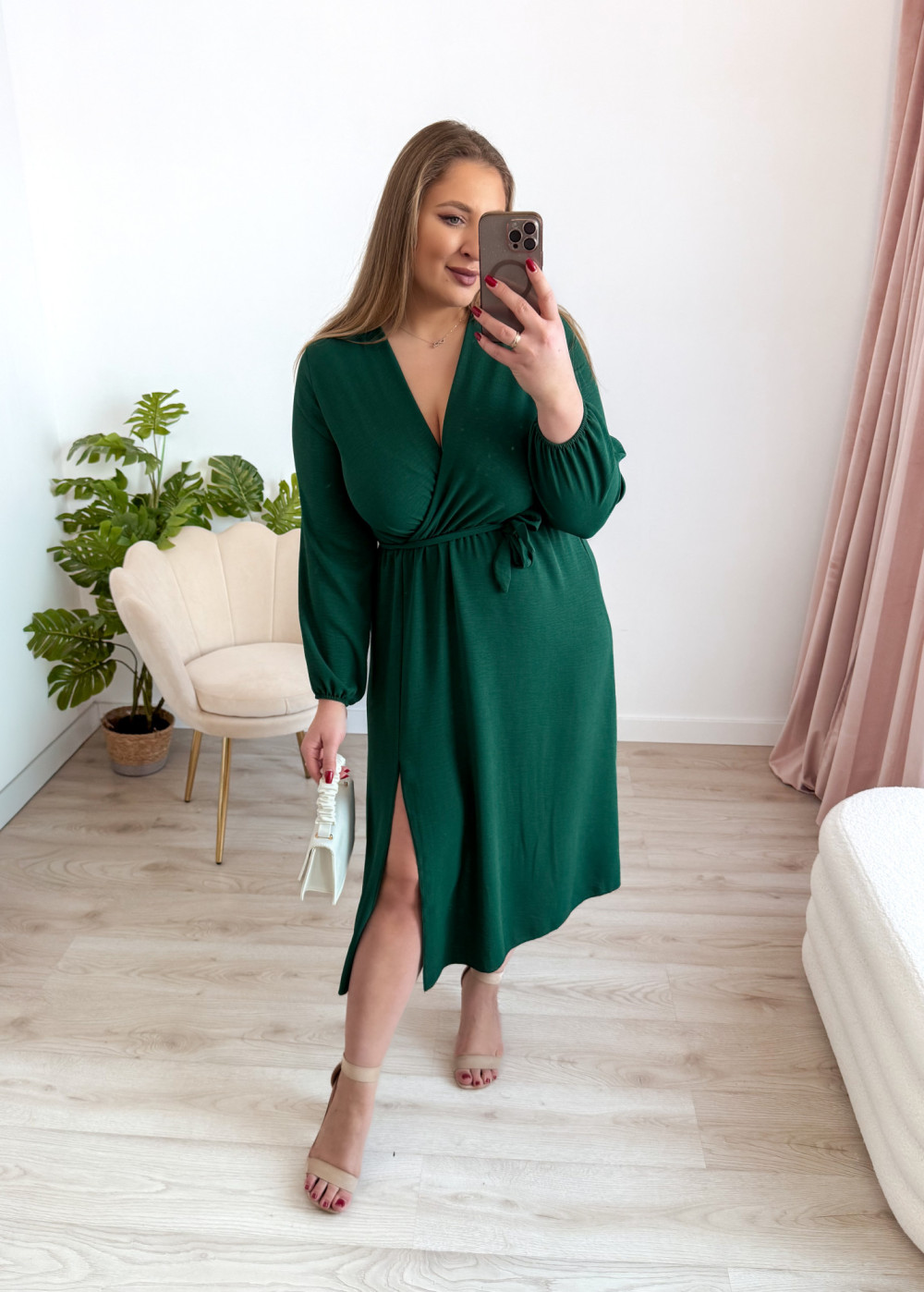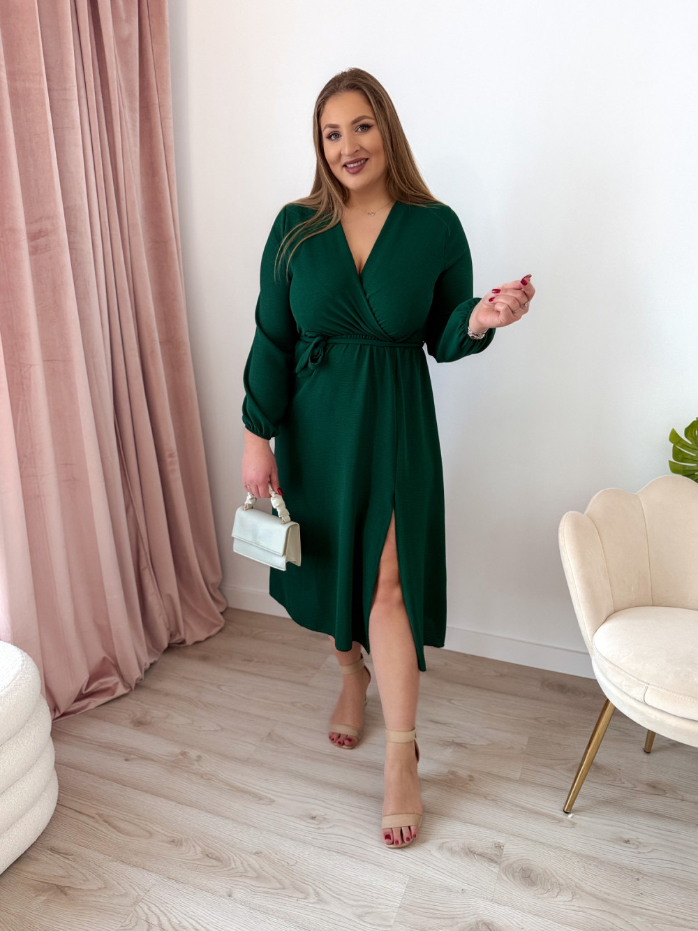 Sukienka nietoperzowa midi z rozcięciem na nogę Marina - butelkowa zieleń
