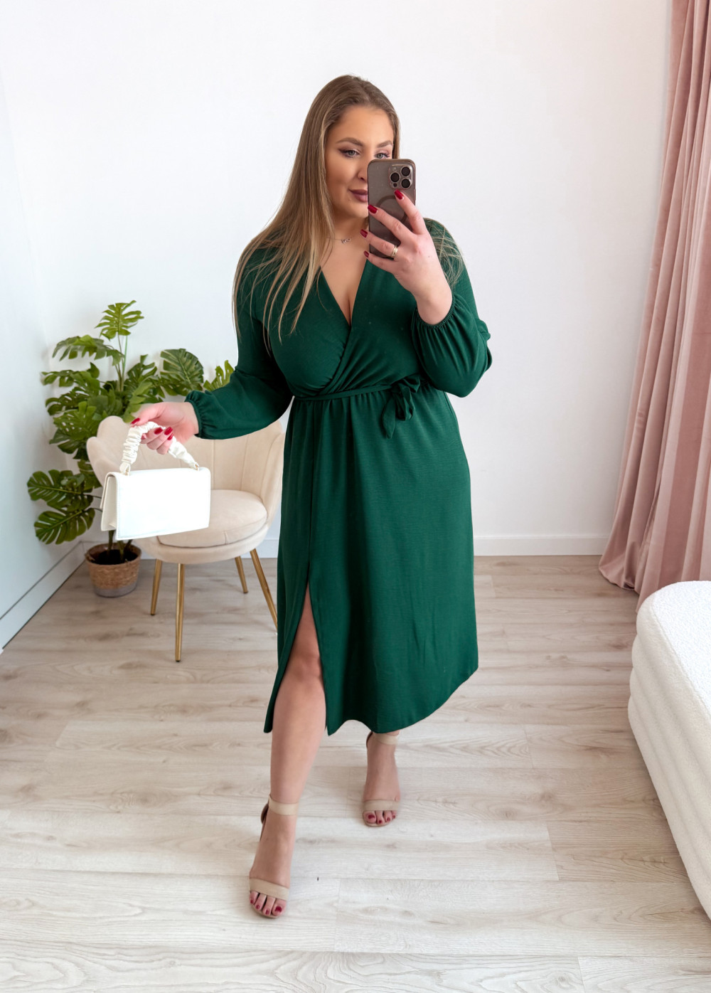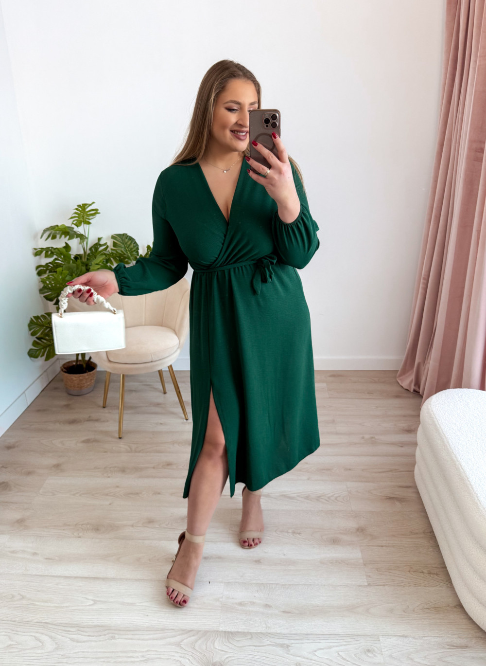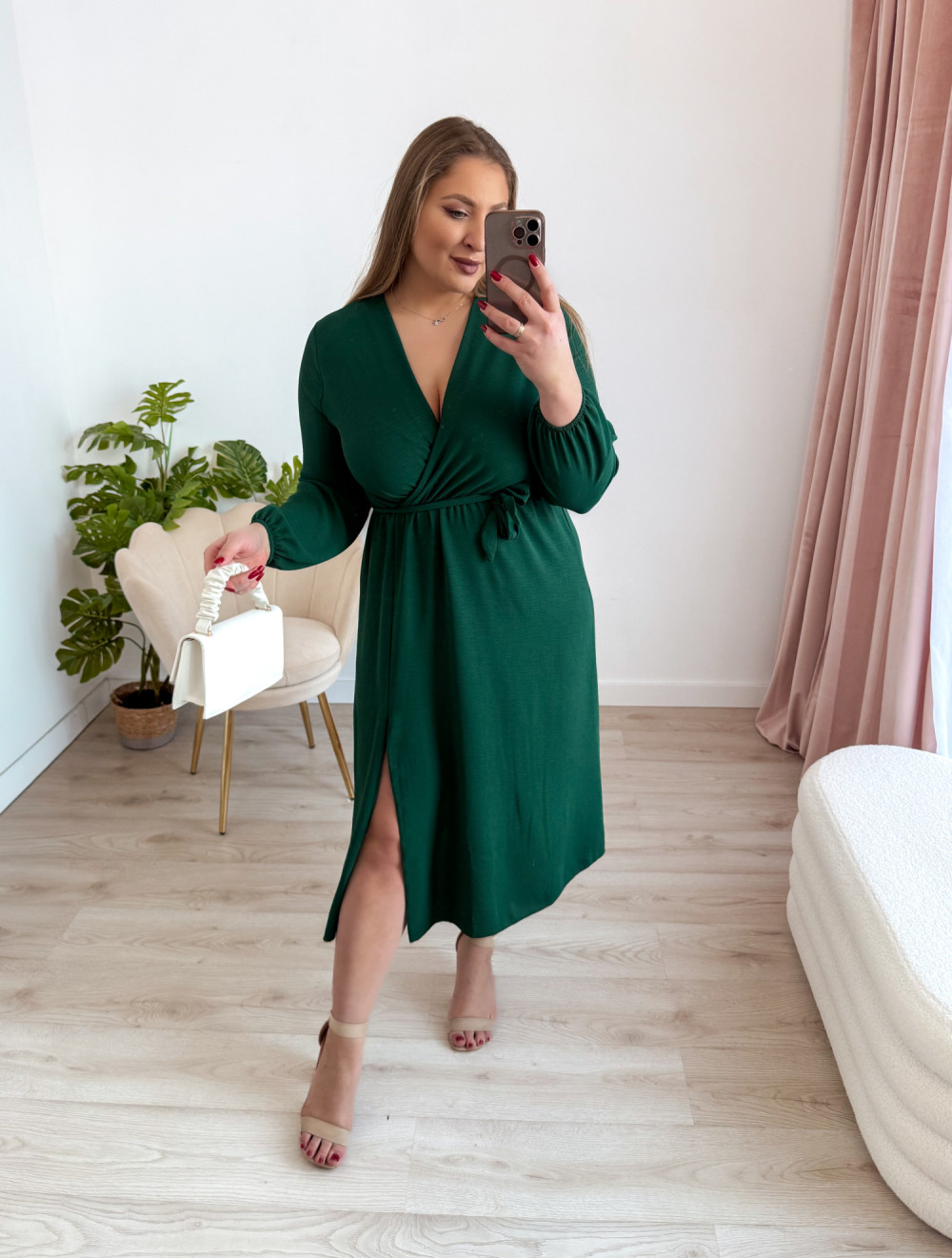 Sukienka nietoperzowa midi z rozcięciem na nogę Marina - butelkowa zieleń