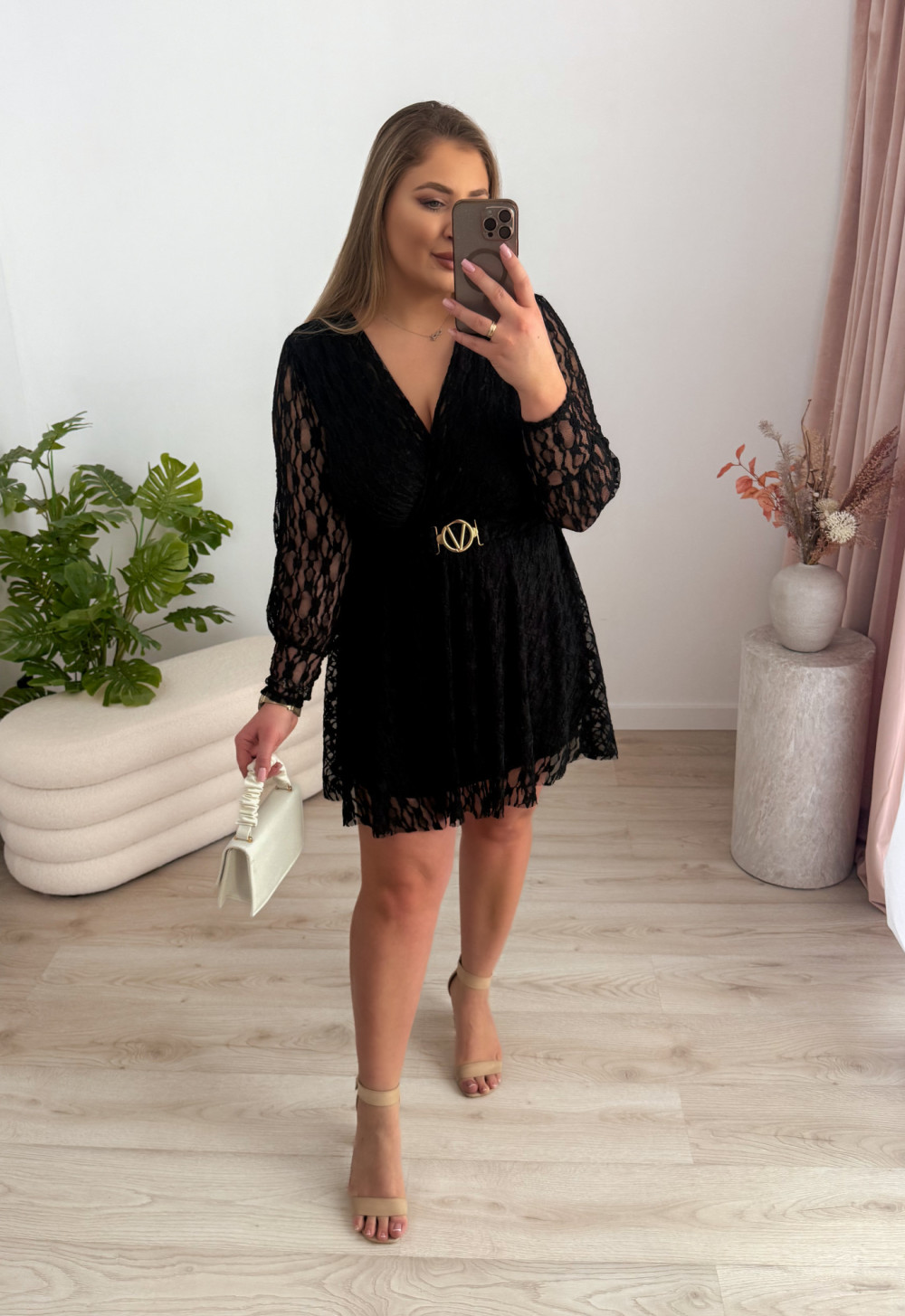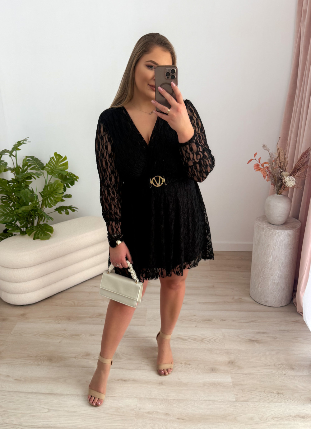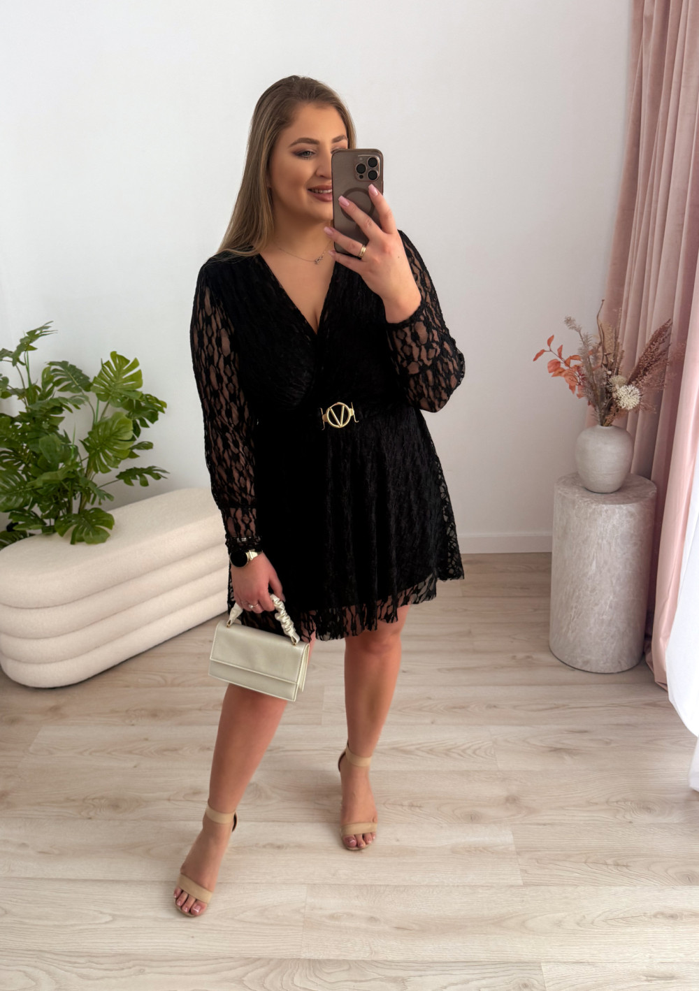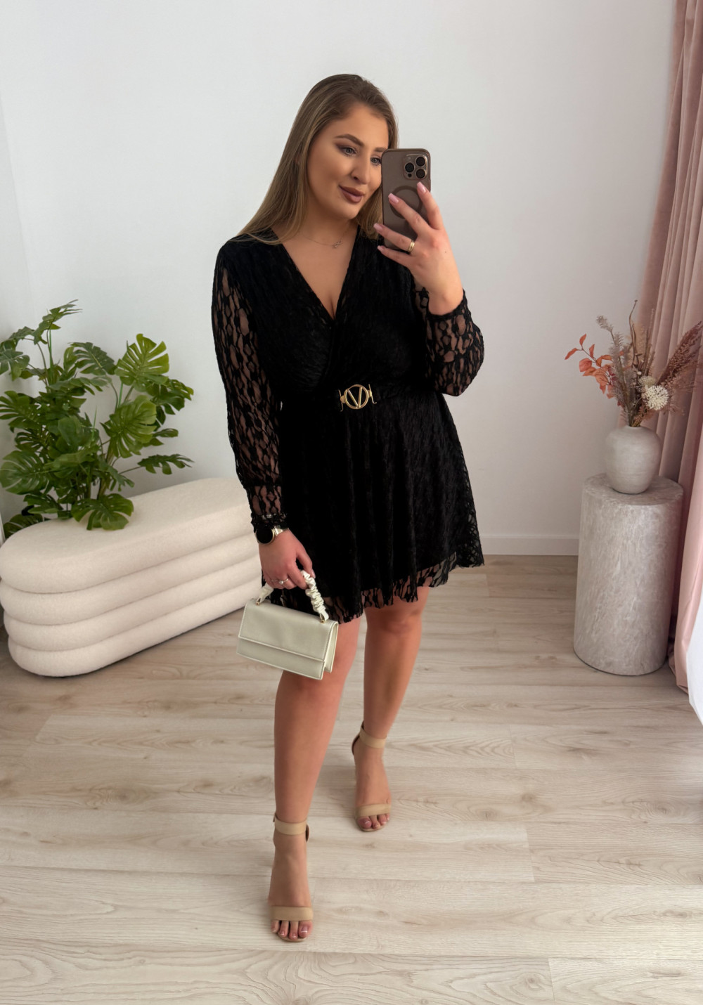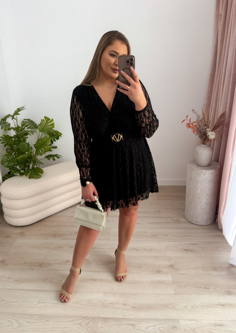 Ta koronkowa sukienka to elegancka i bardzo kobieca propozycja na wyjątkowe okazje. Delikatna koronka pięknie prezentuje się na sylwetce, a zakładany dekolt dodaje całości subtelnej zmysłowości.