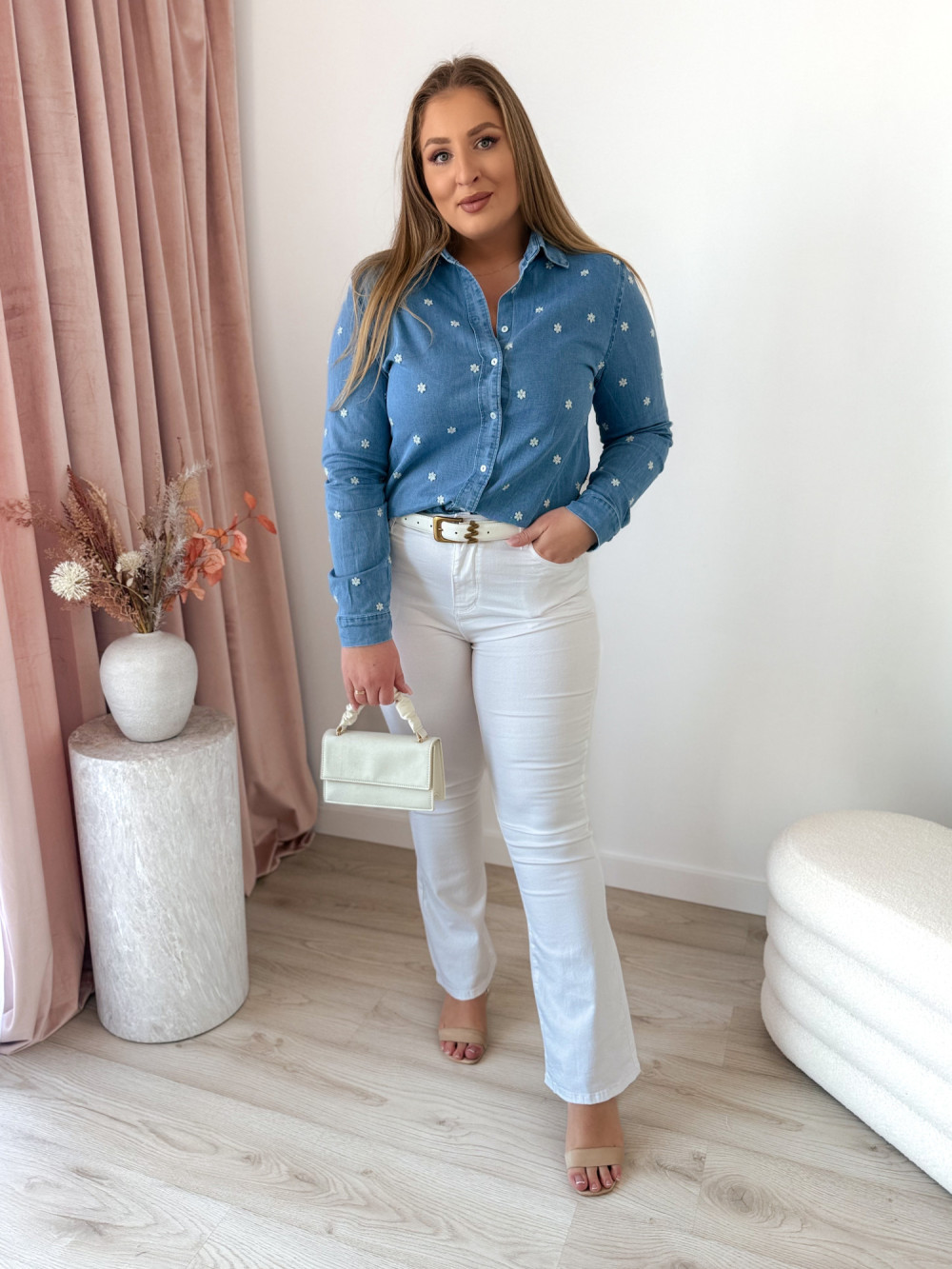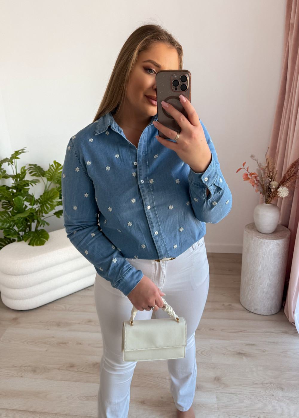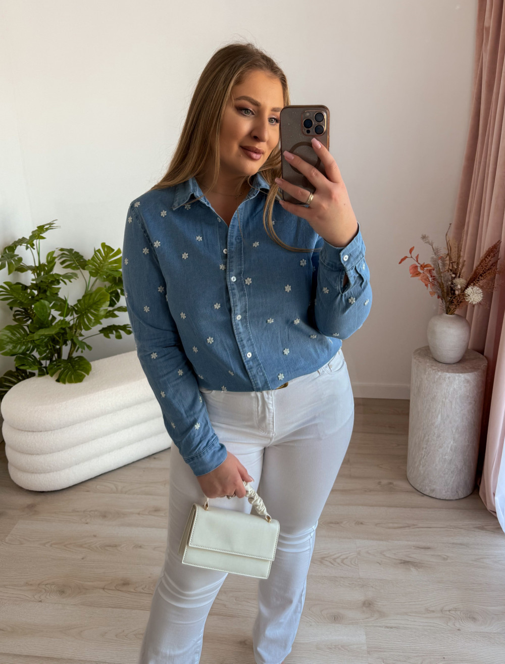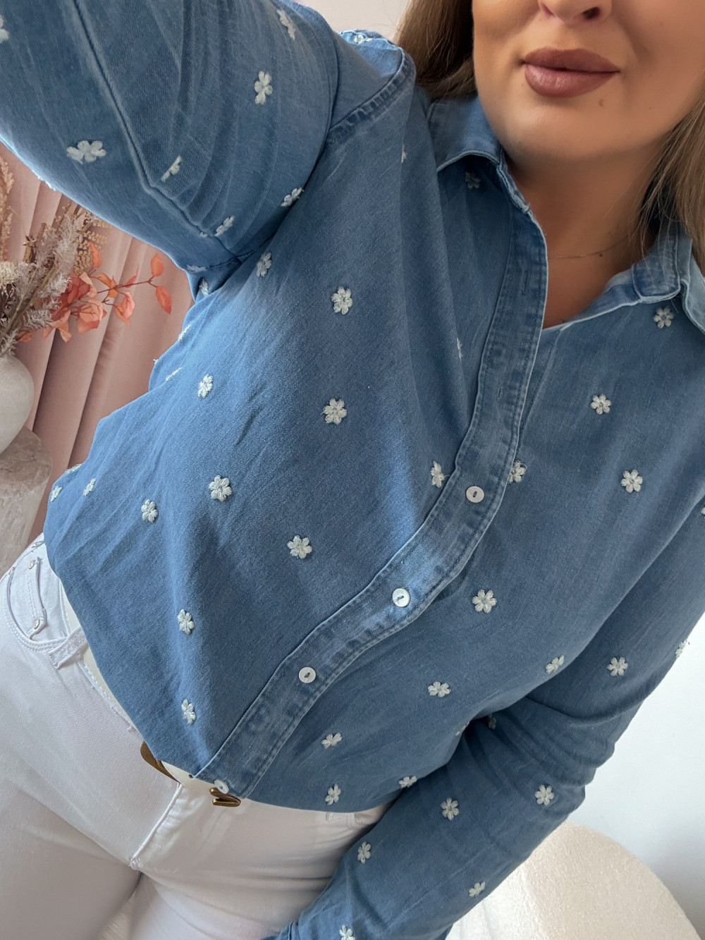 Koszula w kolorze jeansu w urocze stokrotki to połączenie klasyki z dziewczęcym akcentem. Idealnie sprawdzi się w codziennych, wiosennych stylizacjach.