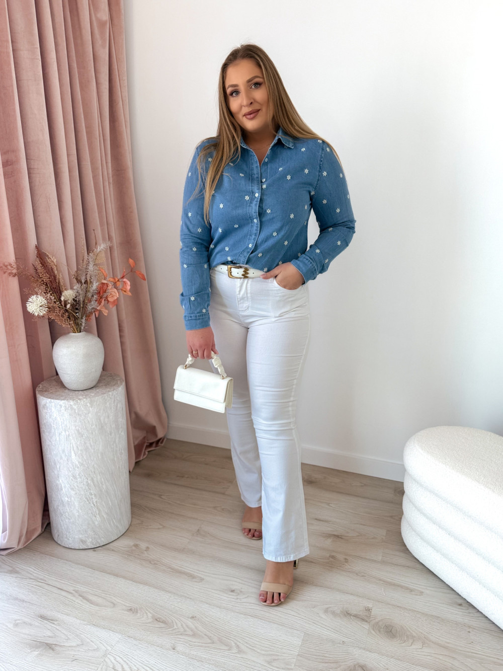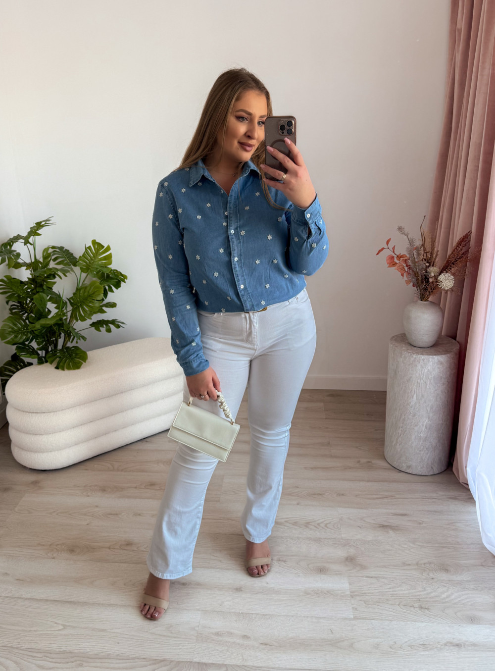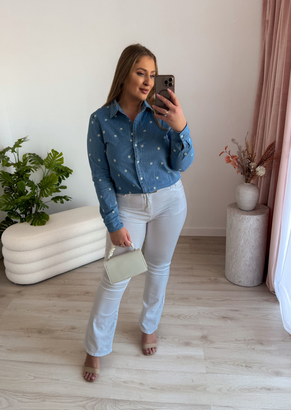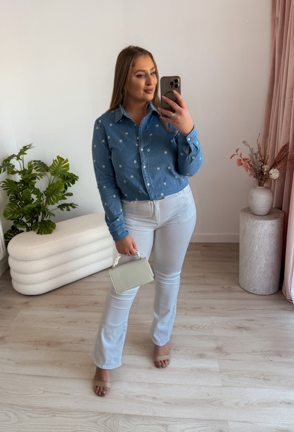 Koszula w kolorze jeansu w urocze stokrotki to połączenie klasyki z dziewczęcym akcentem. Idealnie sprawdzi się w codziennych, wiosennych stylizacjach.