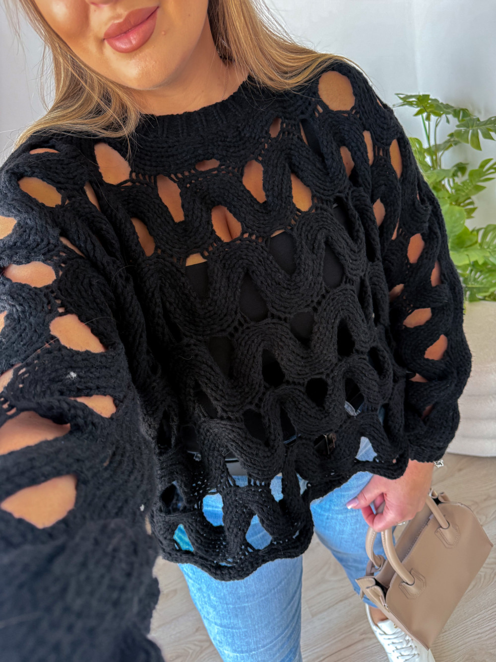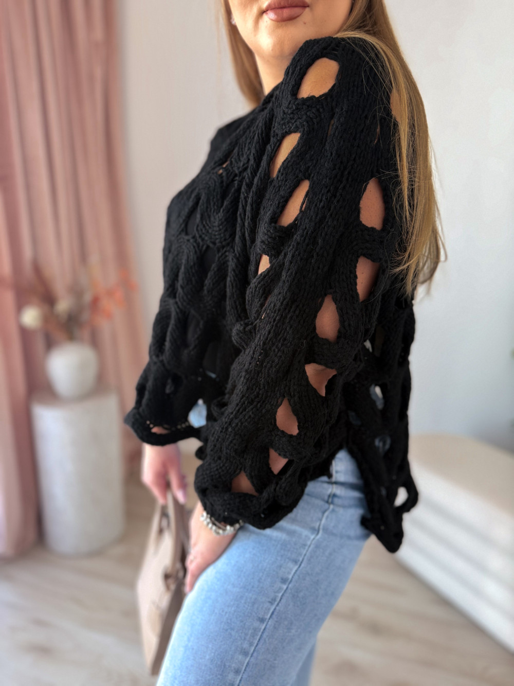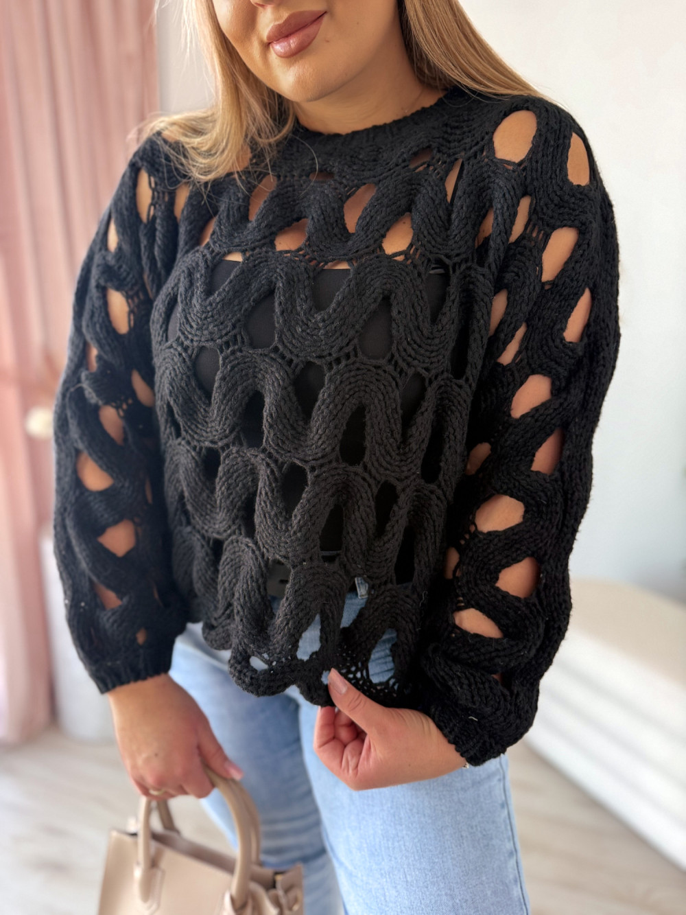 Sweter nietoperzowy ażurowy Lopez - czarny
